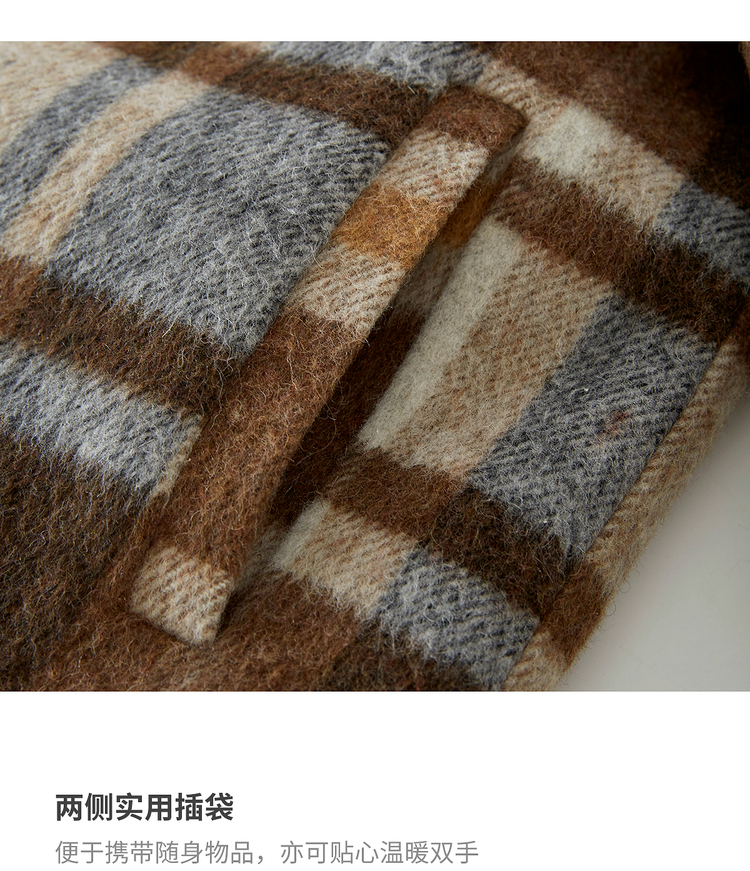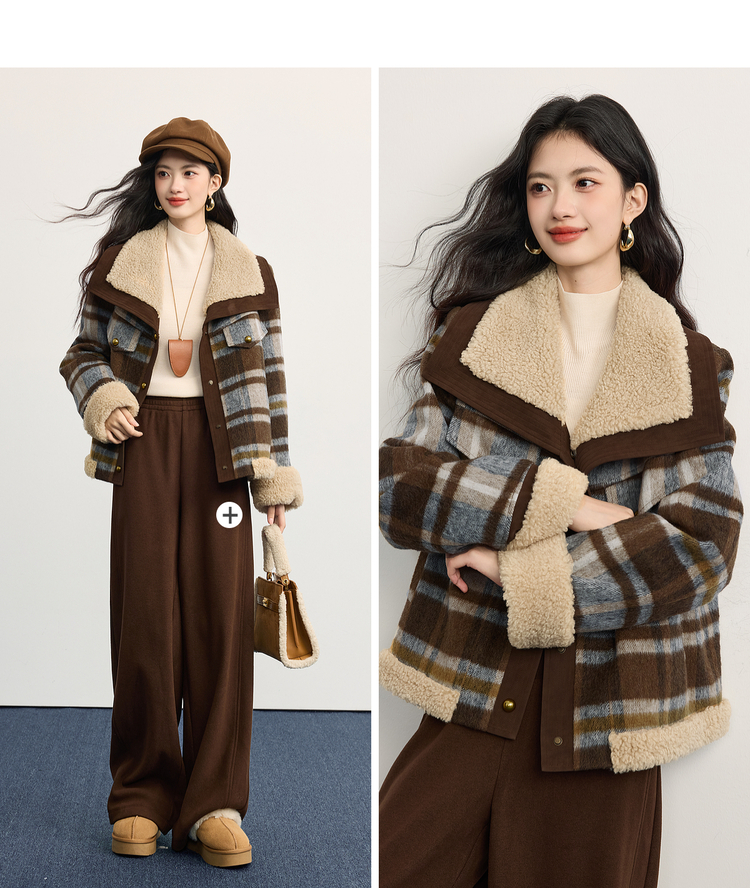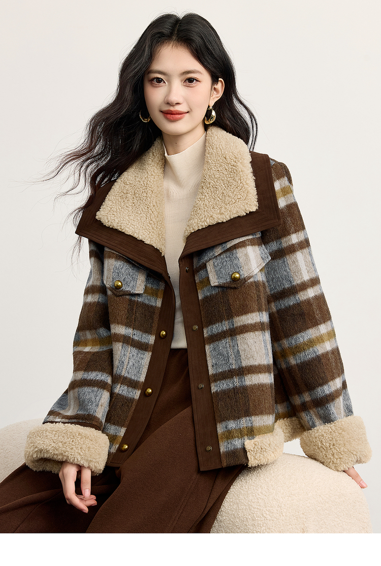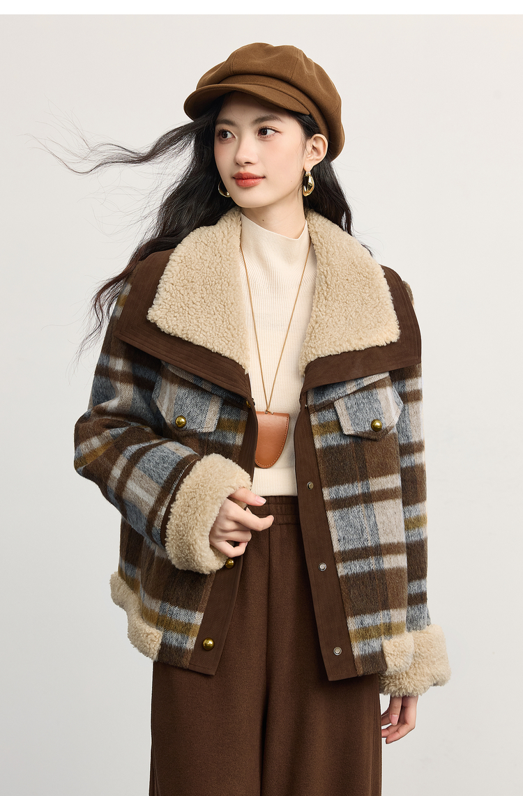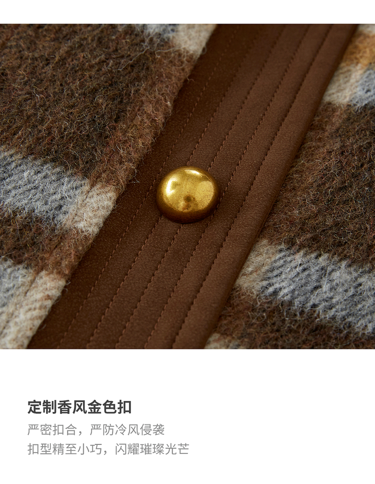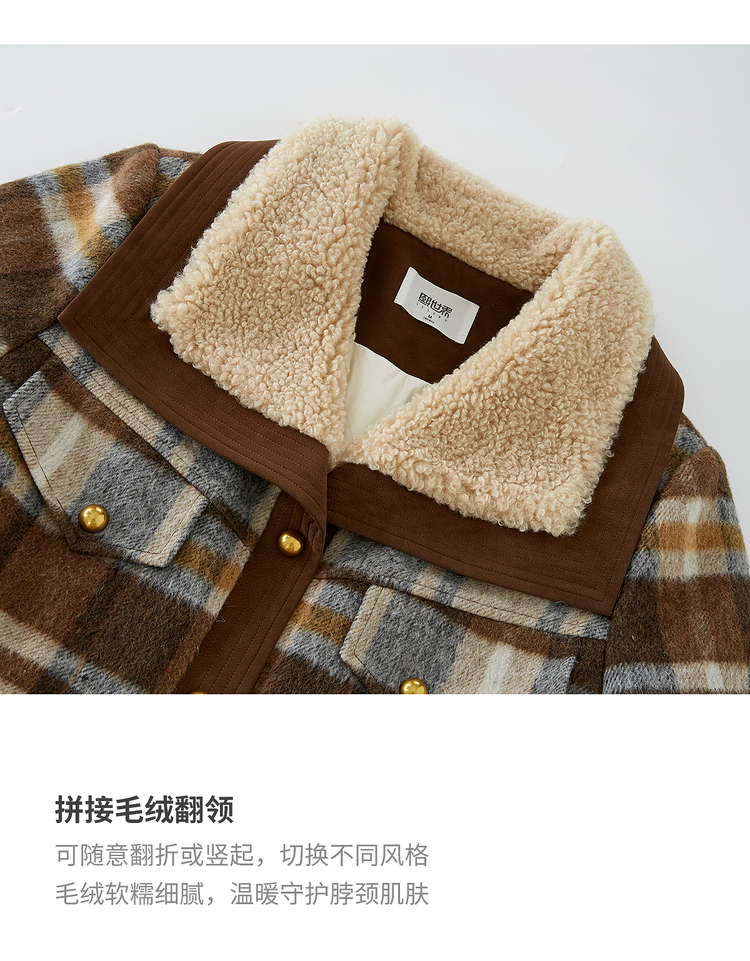 【11/19新品】熙世界白鸭绒内胆羊毛呢短外套女2025冬季新款翻领复古格纹羽绒服