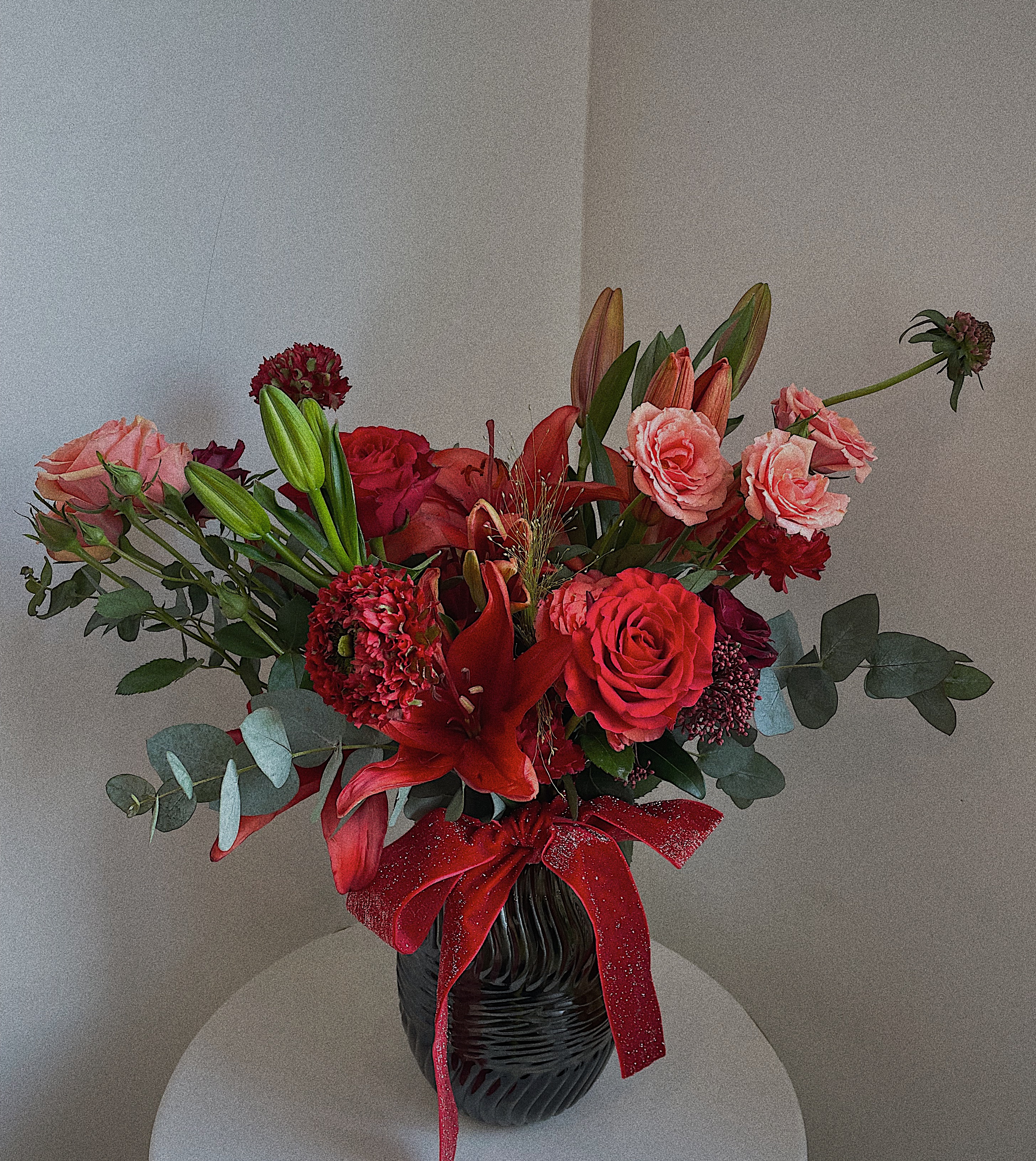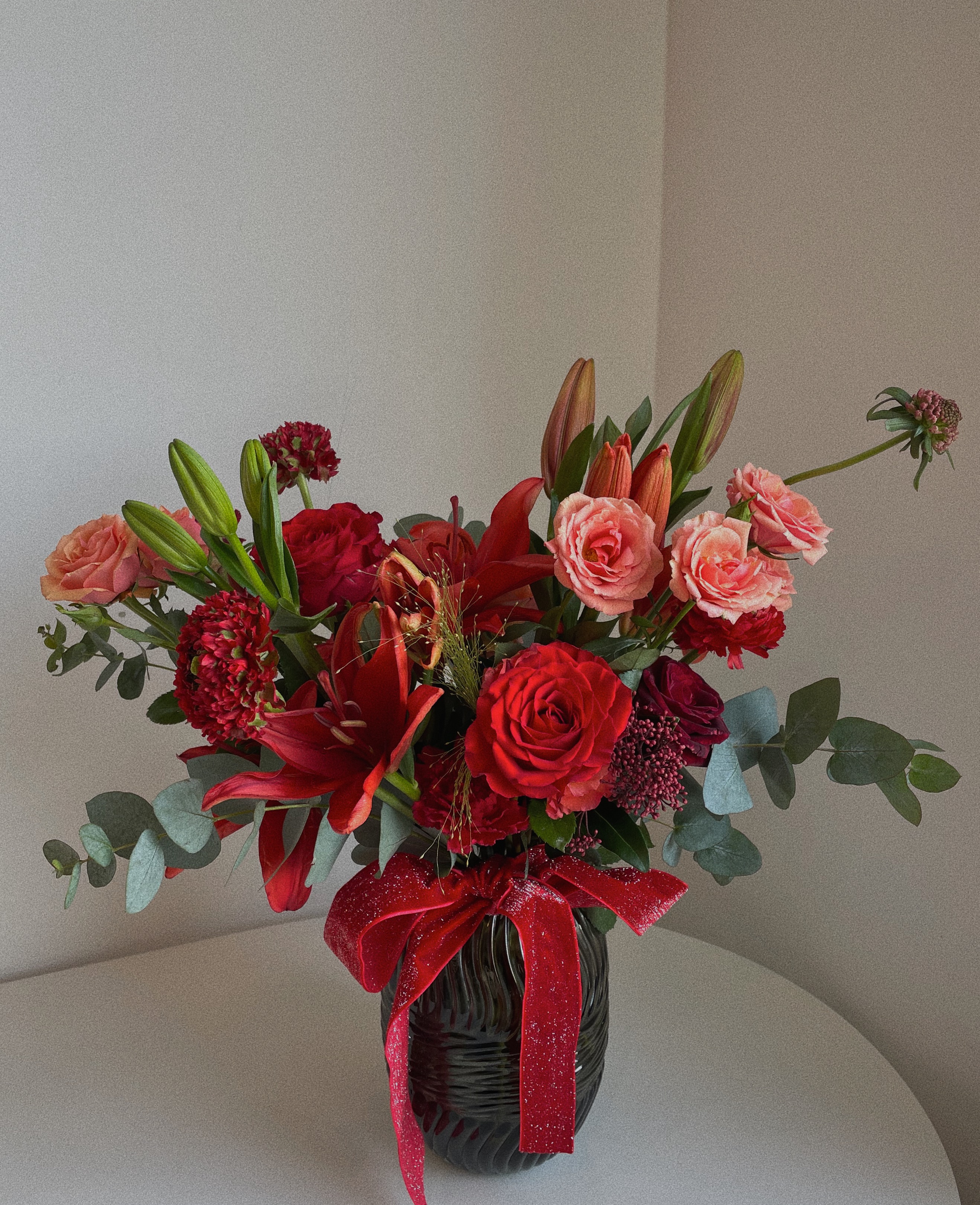 桌角摆上一瓶红色鲜花