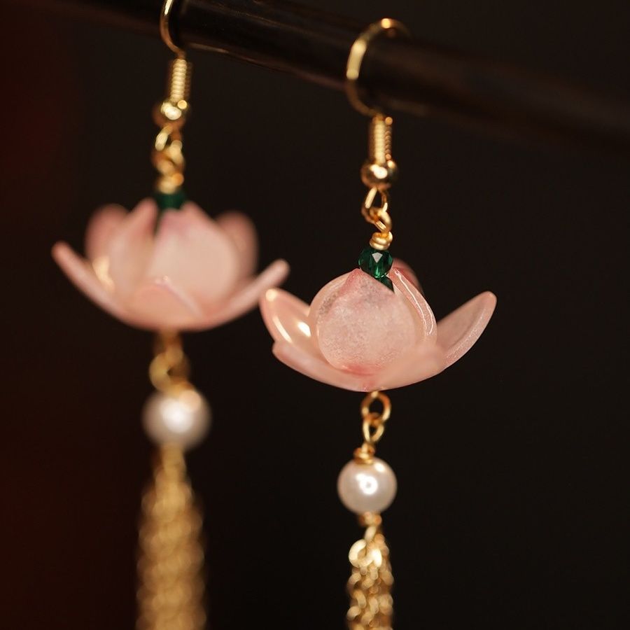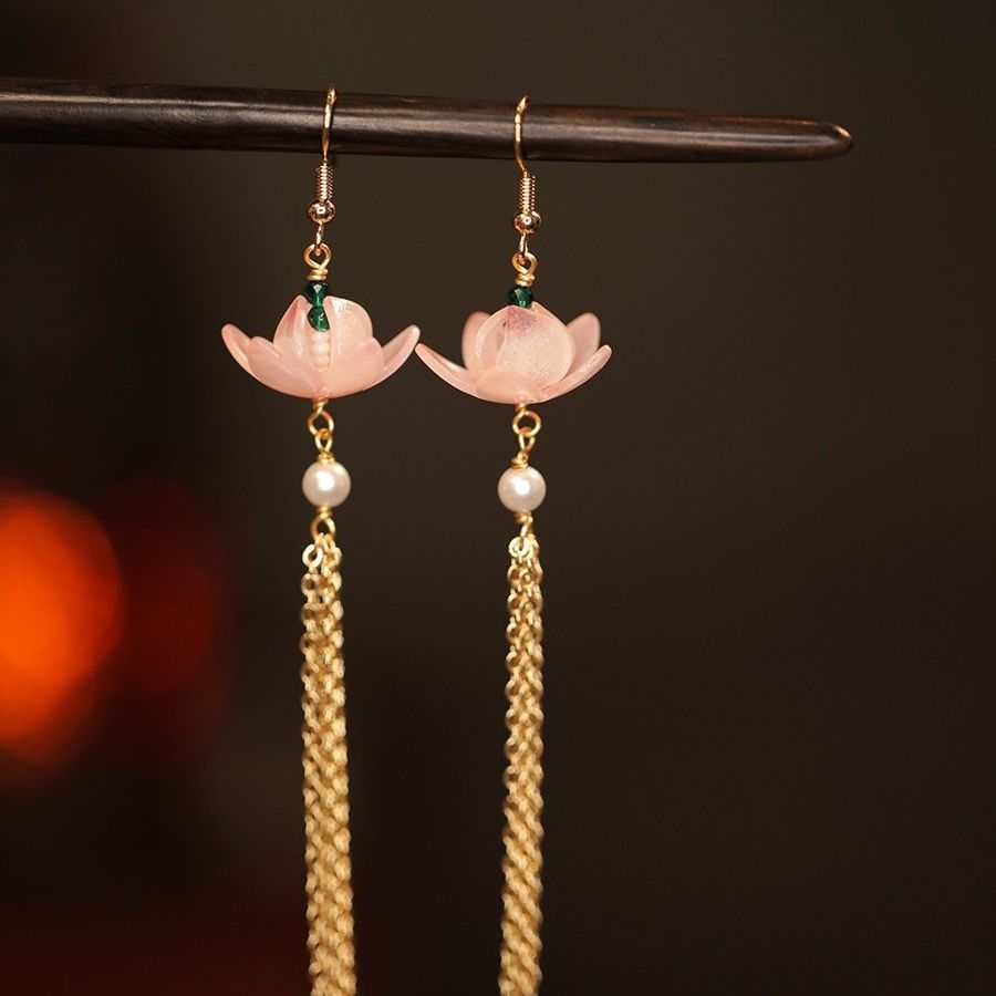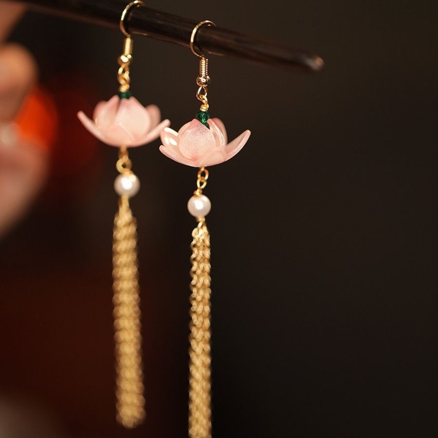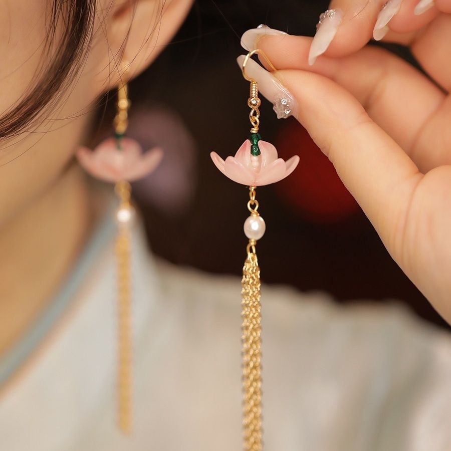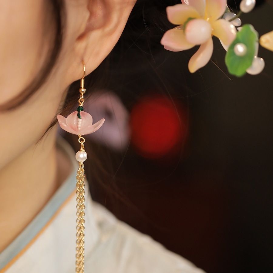 旗袍耳饰中式 荷花耳环小众设计感高级夏天长款流苏古风汉服耳坠