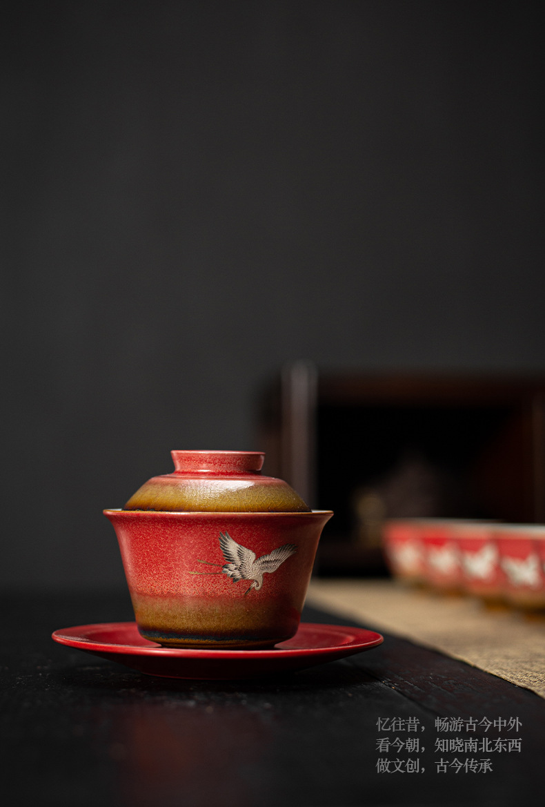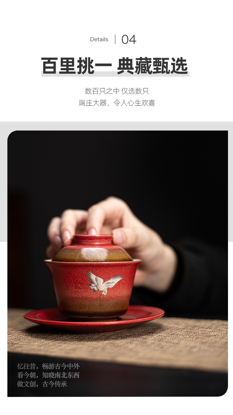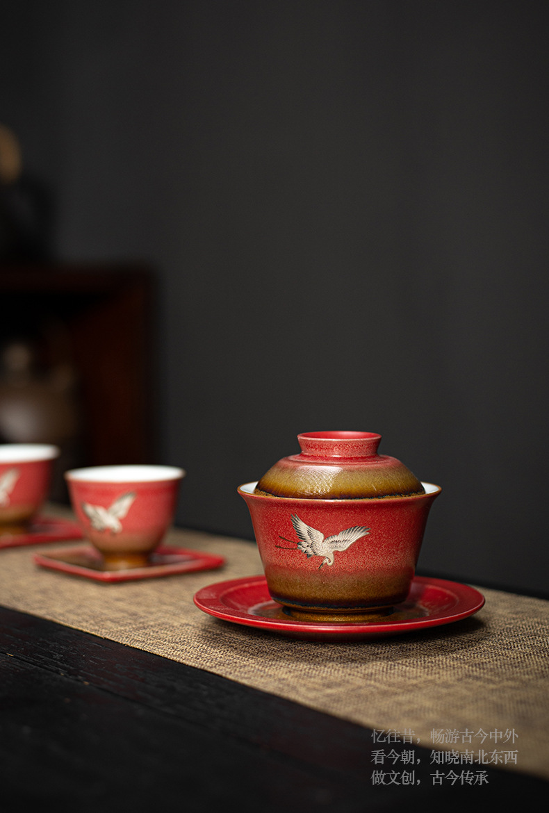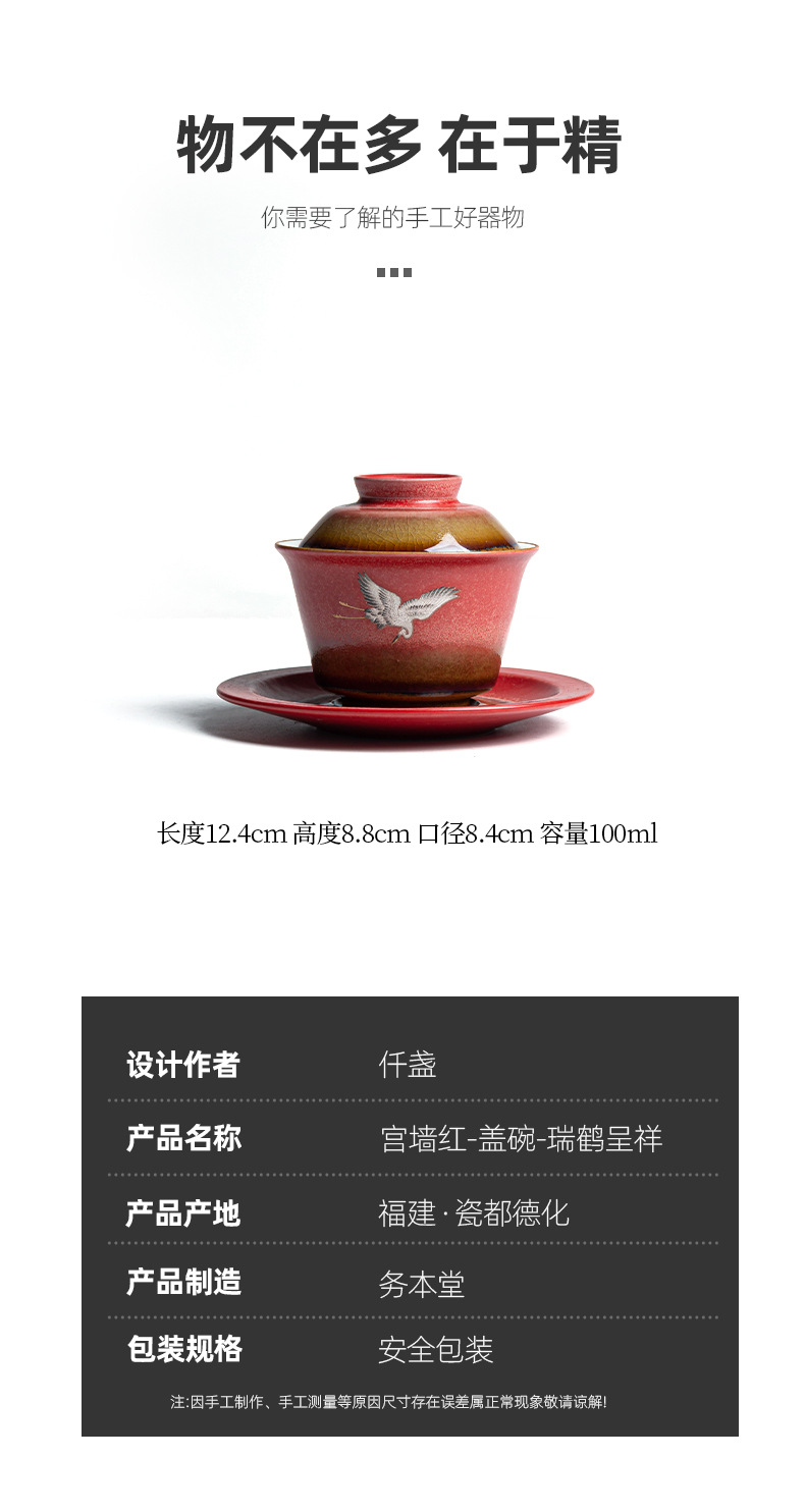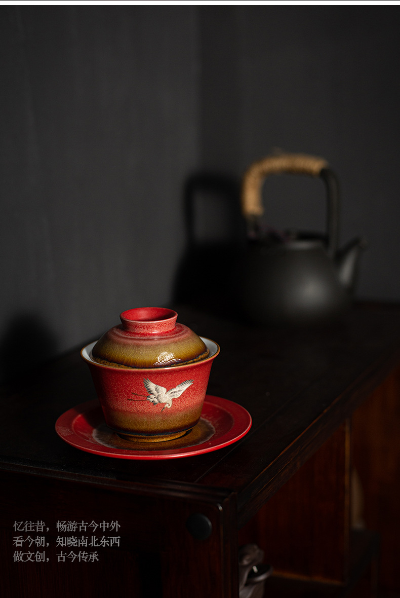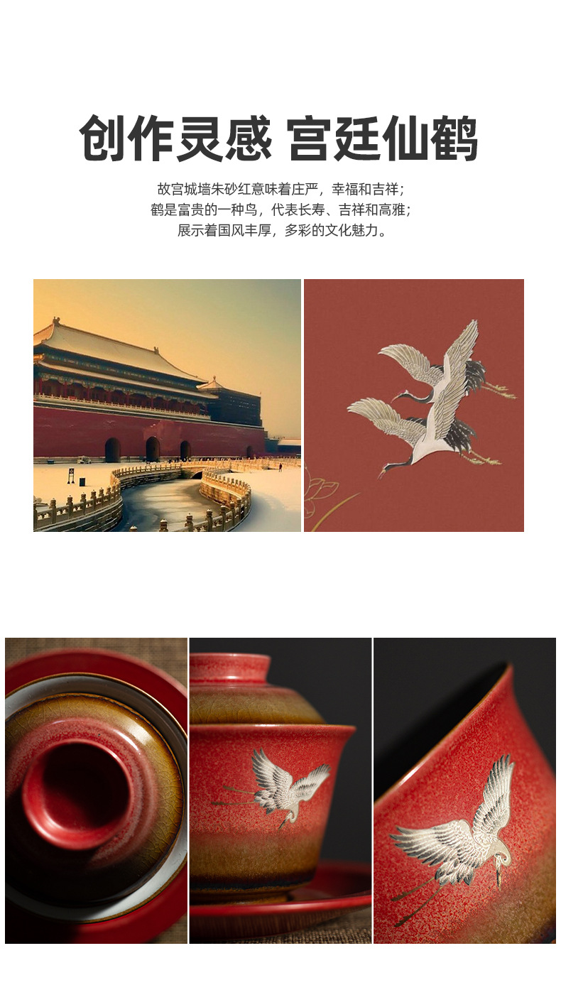 宫墙红瑞鹤呈祥盖碗茶杯三才功夫泡茶碗单带盖家用陶瓷不烫手茶具