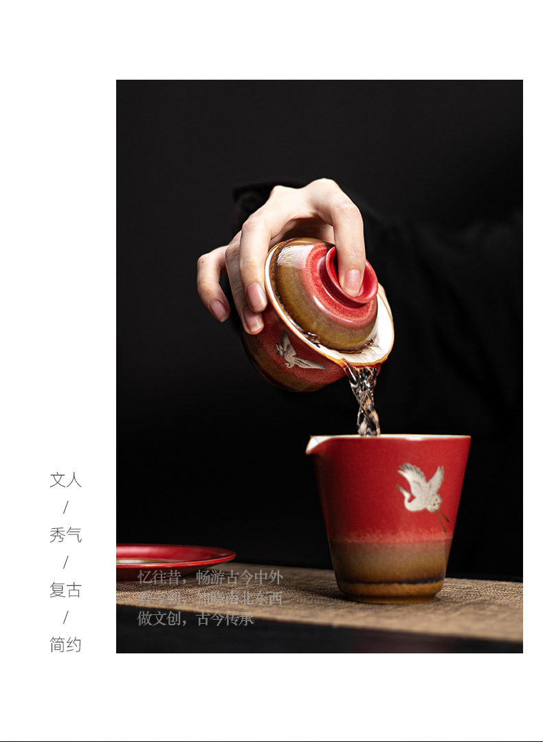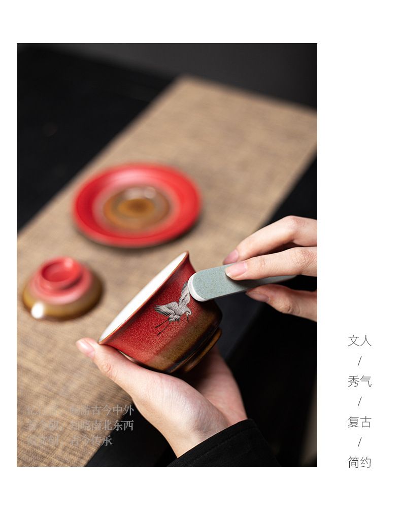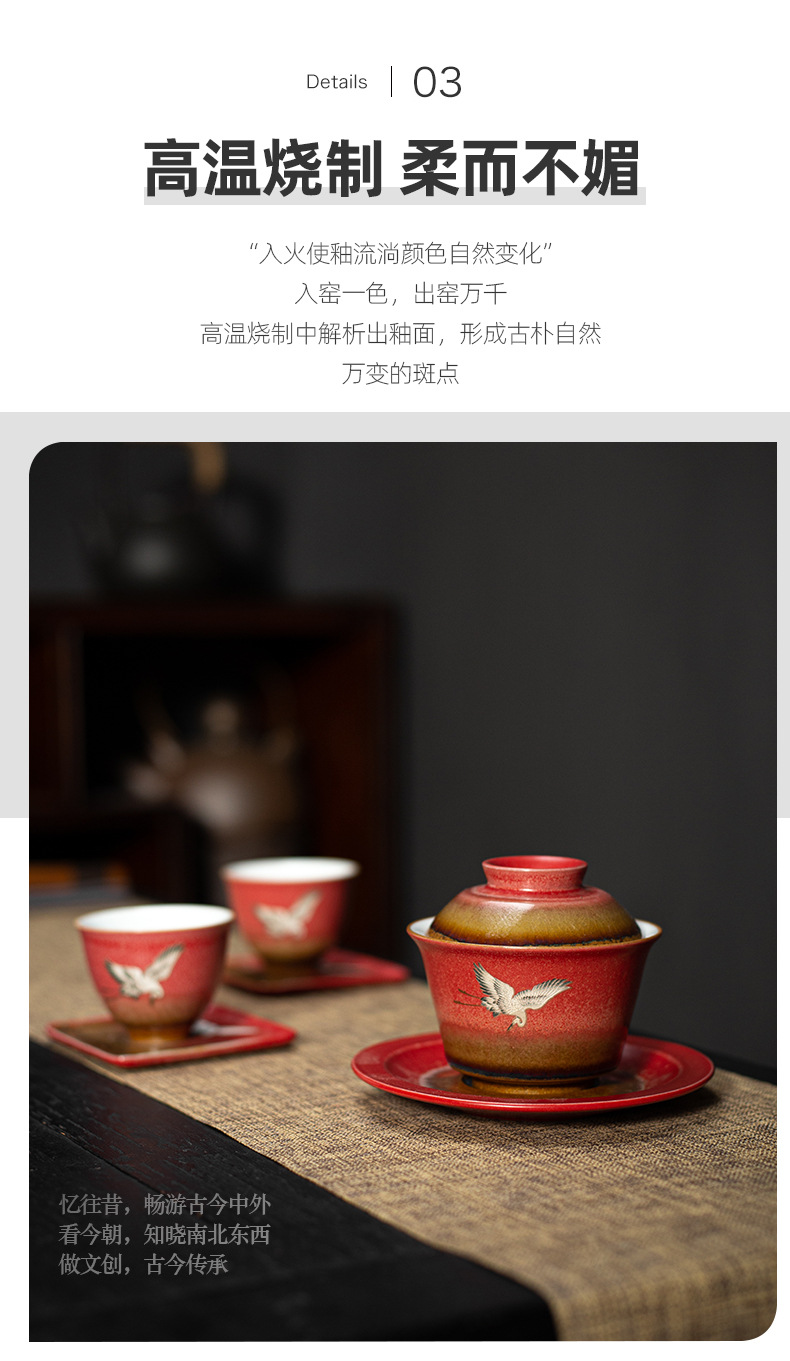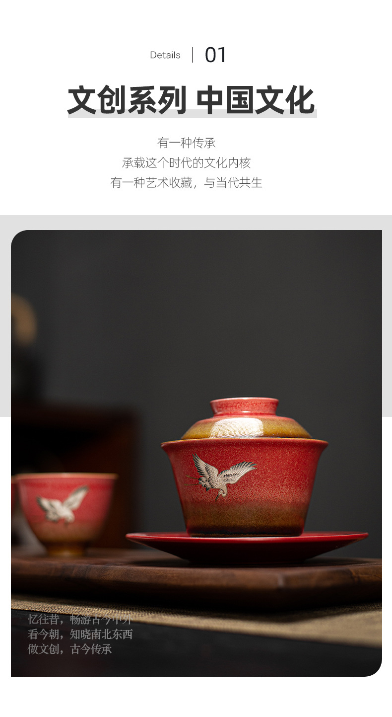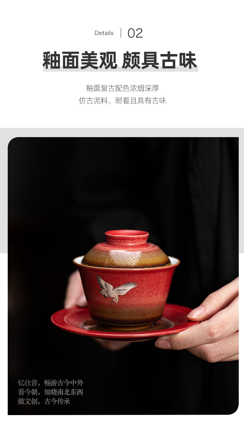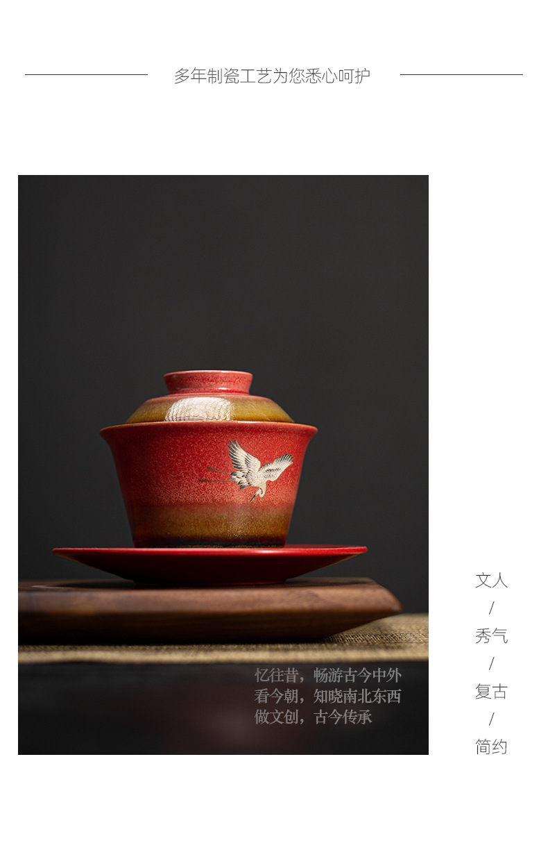 宫墙红瑞鹤呈祥盖碗茶杯三才功夫泡茶碗单带盖家用陶瓷不烫手茶具