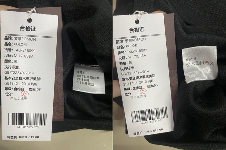面料:66.7%聚酯纤维 29.8%棉 3.5%桑蚕丝