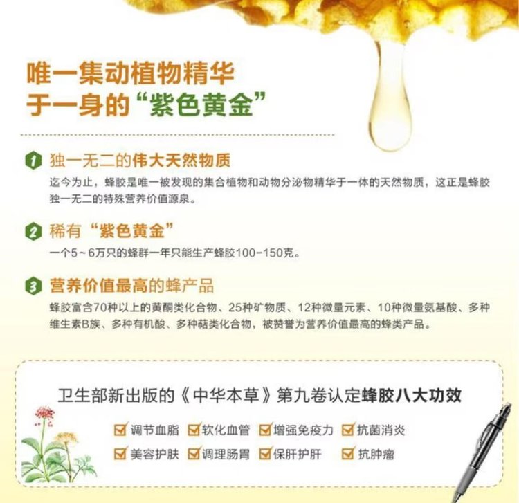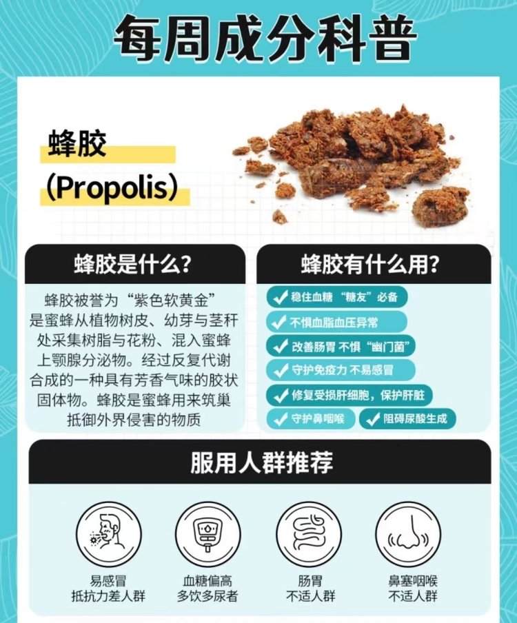【禁忌人群】:蜂胶含有大豆和蜂蜜制品,对此过敏人群需谨慎食用。孕妇、哺乳期需遵医嘱