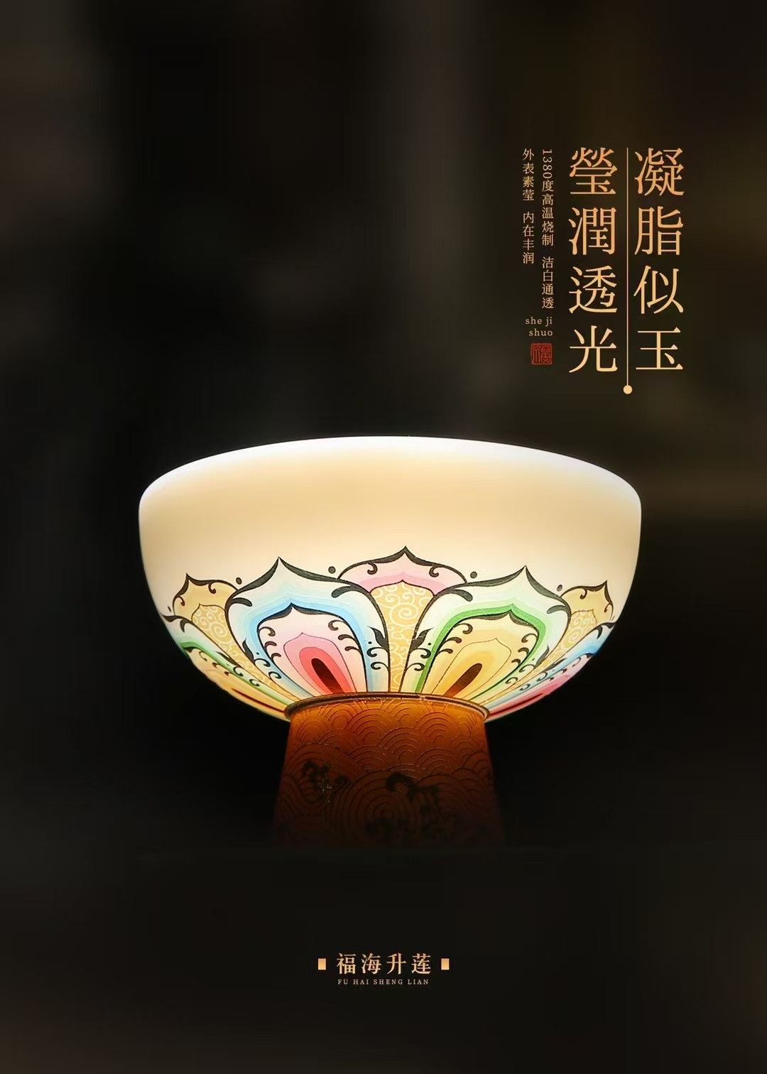 【七彩莲花 步步高升】福海升莲羊脂玉瓷高脚水杯,徐建勇大师签章 疑脂似玉 莹润透光 送礼佳品 好物相伴