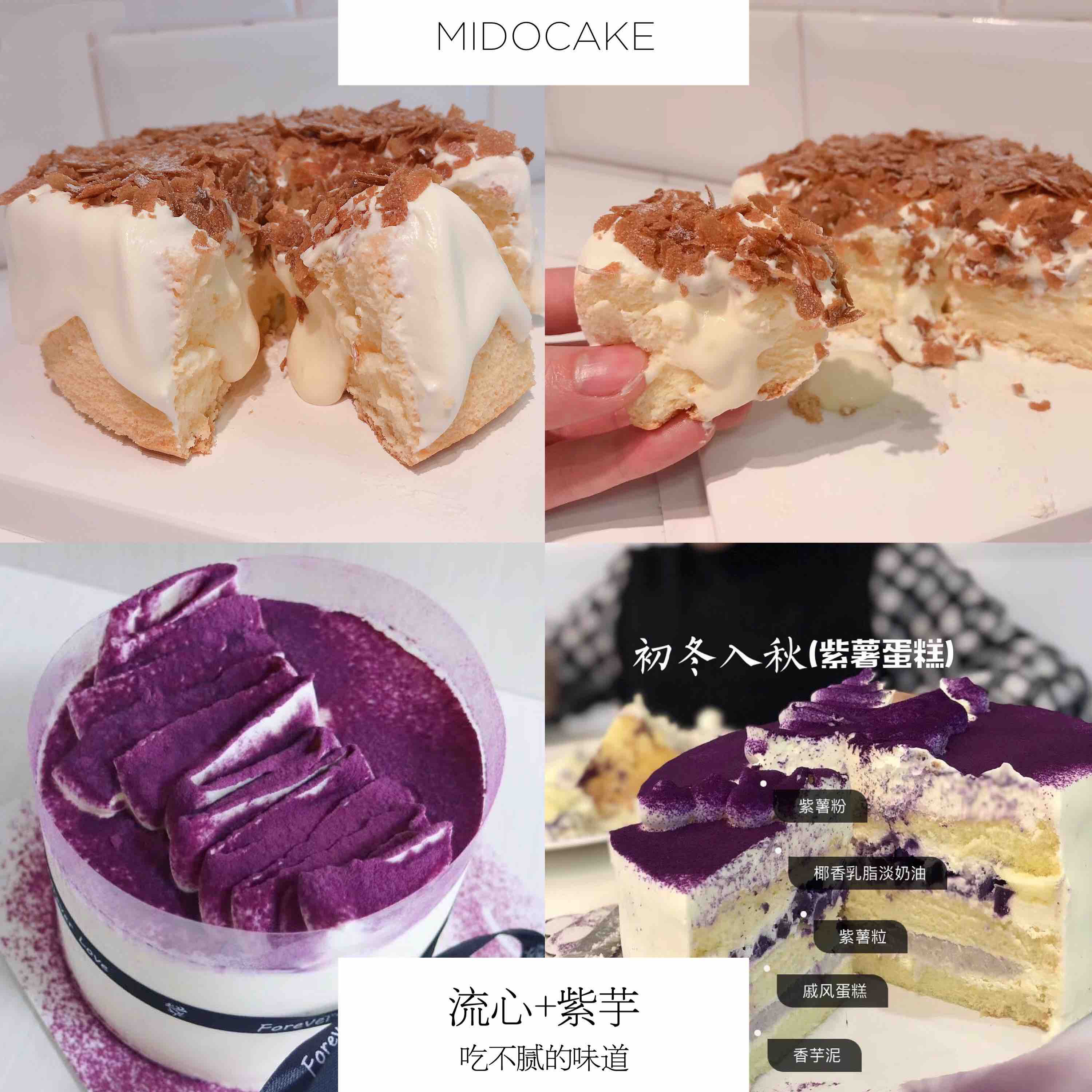 这两款蛋糕都超级炸味蕾的,米粉们都知道紫芋蛋糕不常做,因为May要去市场给你们买最香的芋头以及大自然的紫薯回店里蒸熟再用来做蛋糕…大自然的味道说的就是它没错了,酱爆流心用的是手工卡仕达酱,搭配上脆片真的一流的口感,一点都不腻,两个味道都完全不会踩雷。一句话,有钱买它,没钱贷款也要买它!