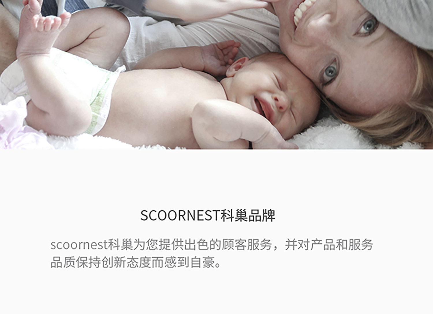 - Scoornest始终秉承给每一位宝宝送去科学的、关心的、创新的成长体验,通过提供商品和服务,使顾客形成守护、发展、巩固这种弥足珍贵的亲情的爱。