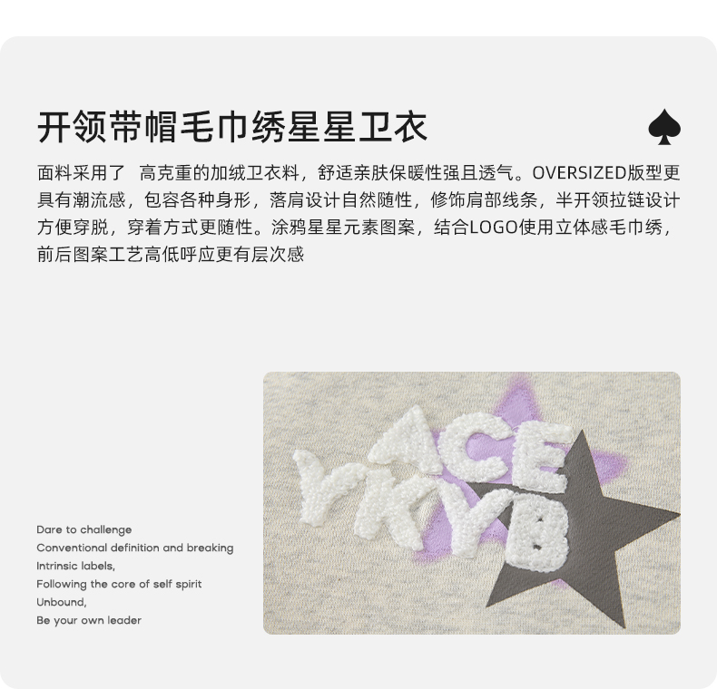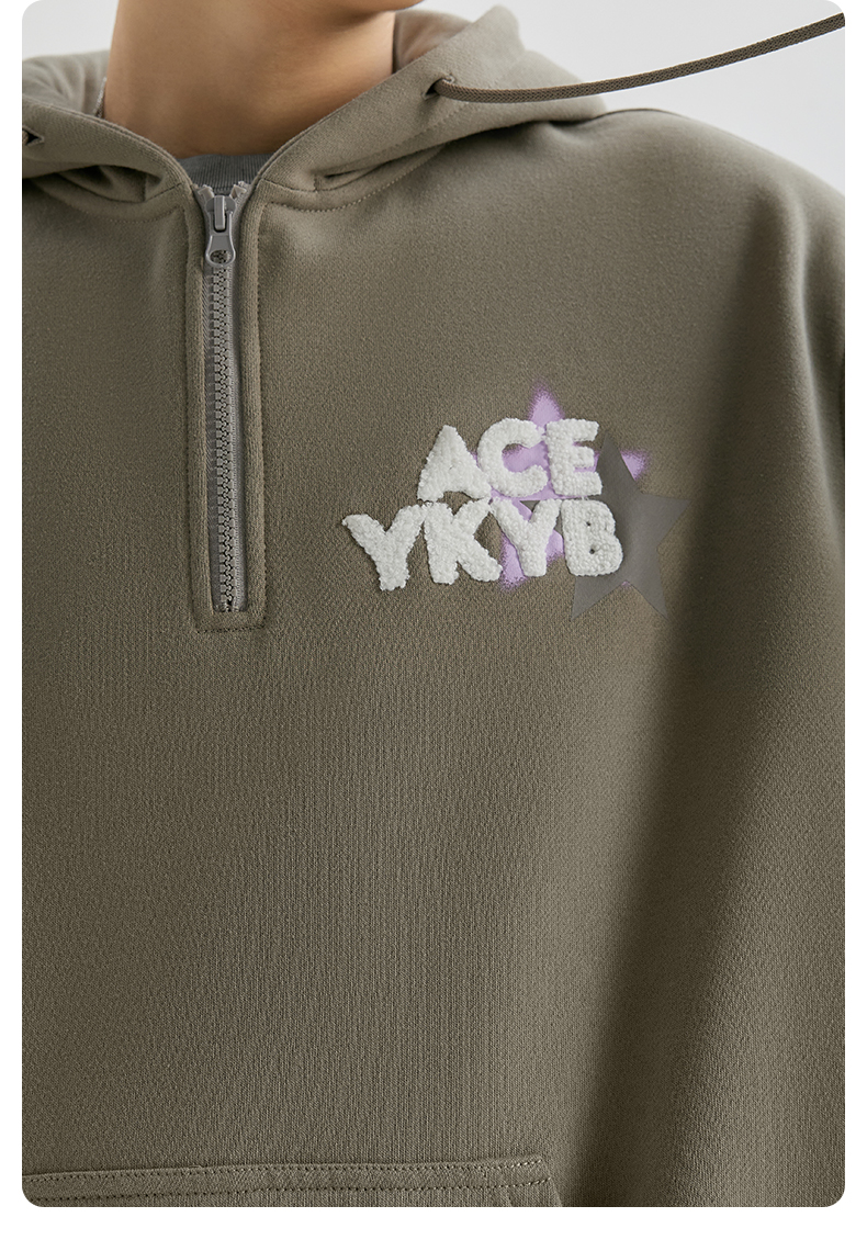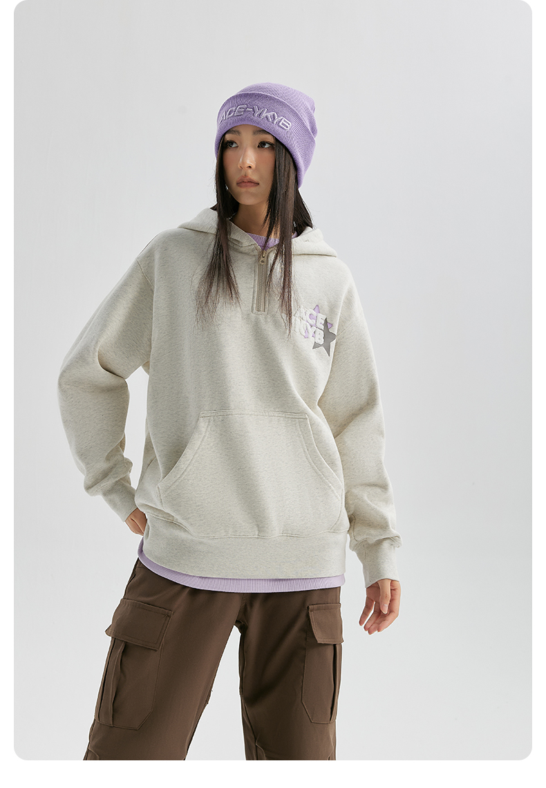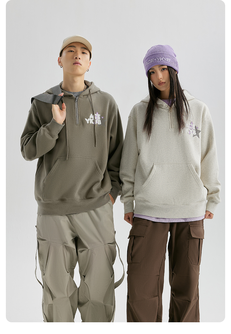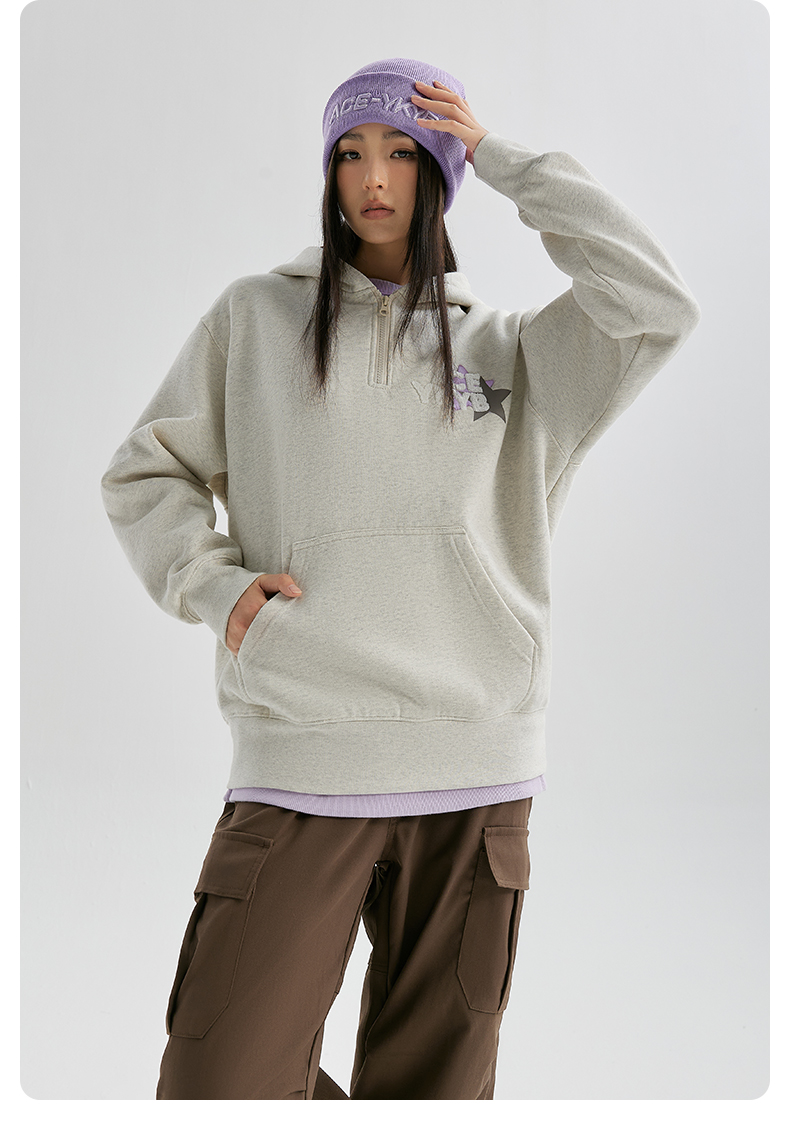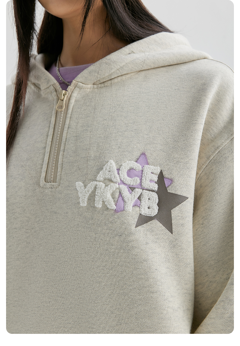 YKYB冬连帽卫衣加绒潮保暖领口拉链外套星星刺绣重磅落肩宽松帽衫