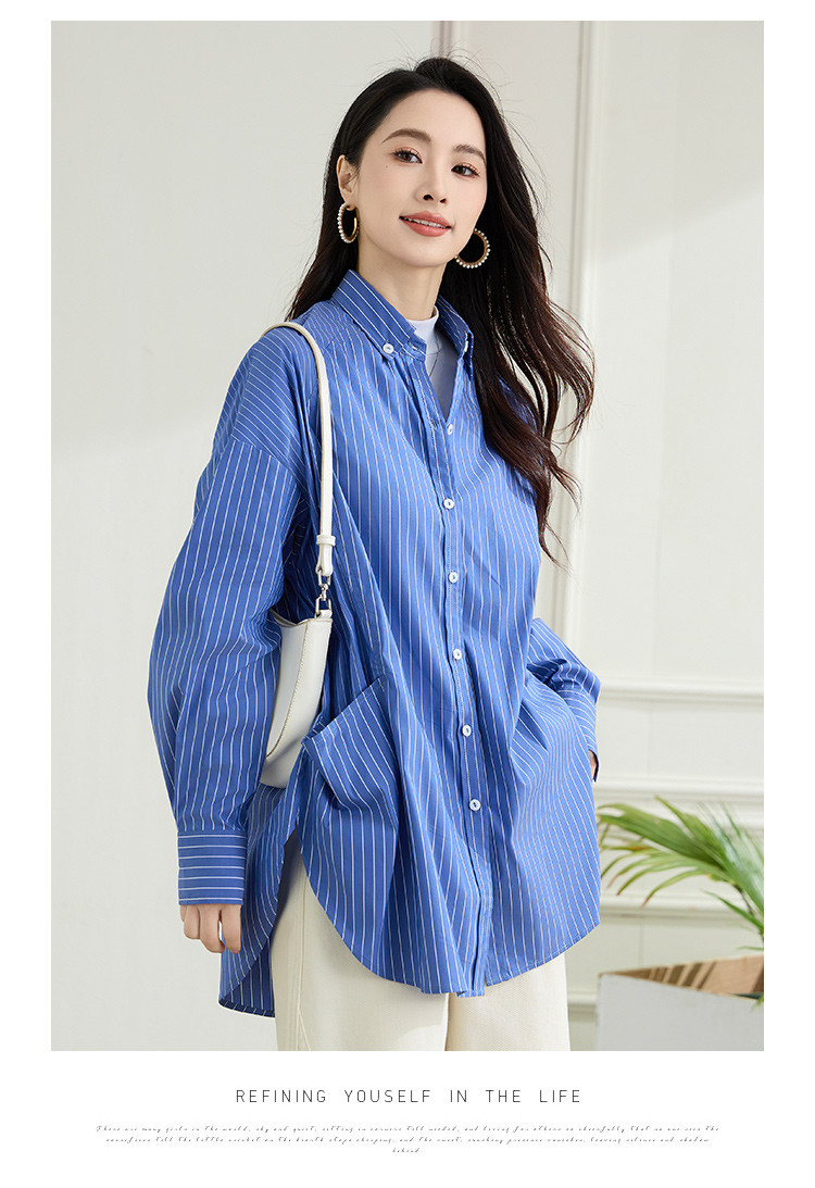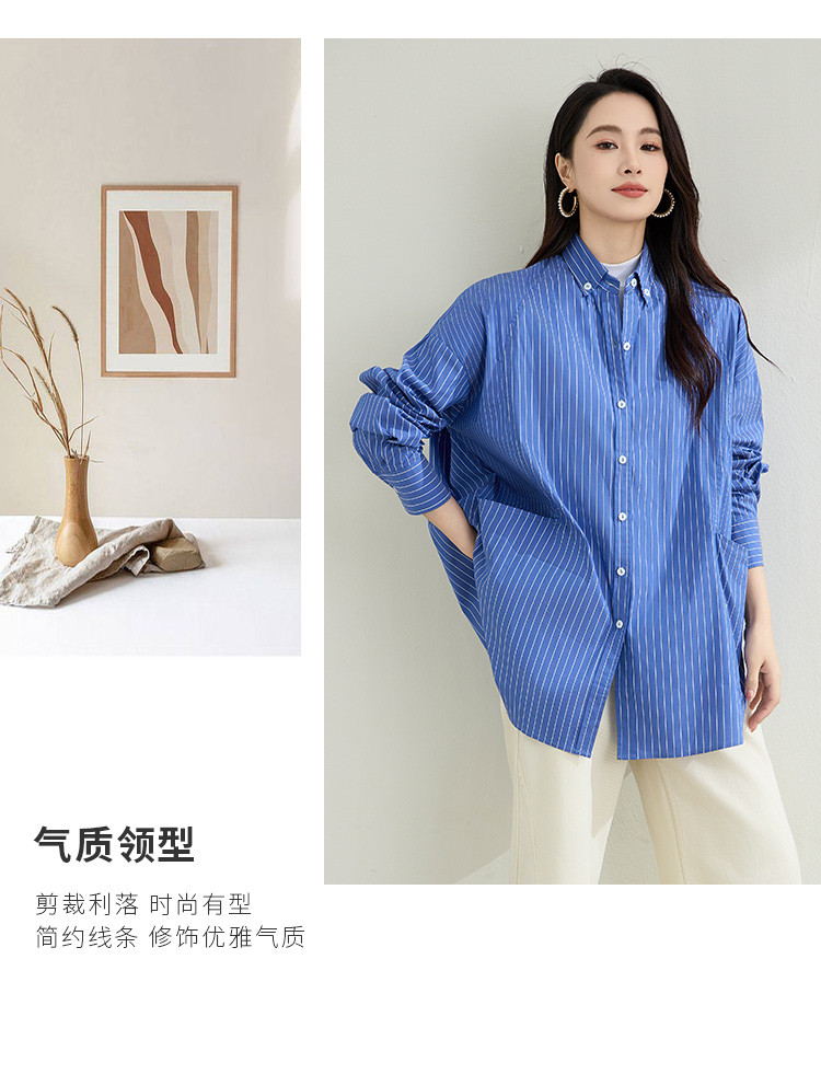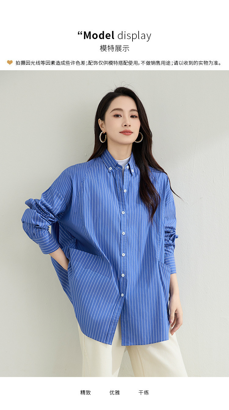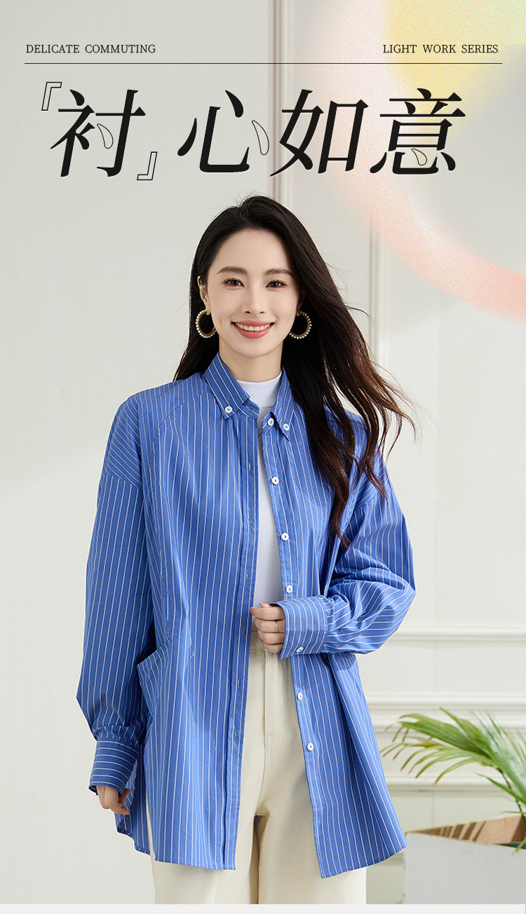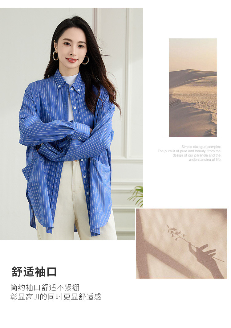 罗蒙春季蓝色条纹长袖衬衫女士宽松休闲百搭落肩版棉质衬衫外套女