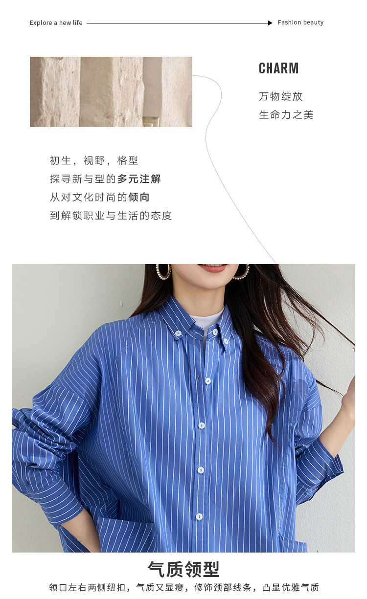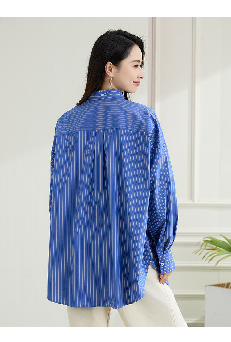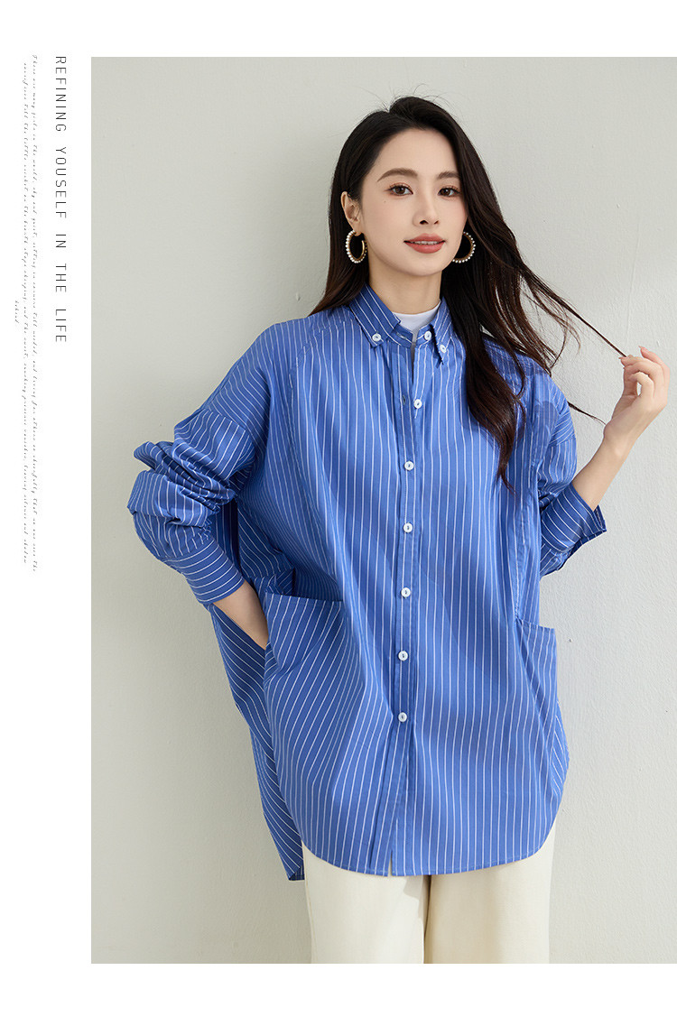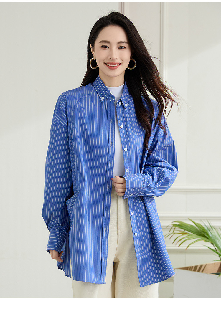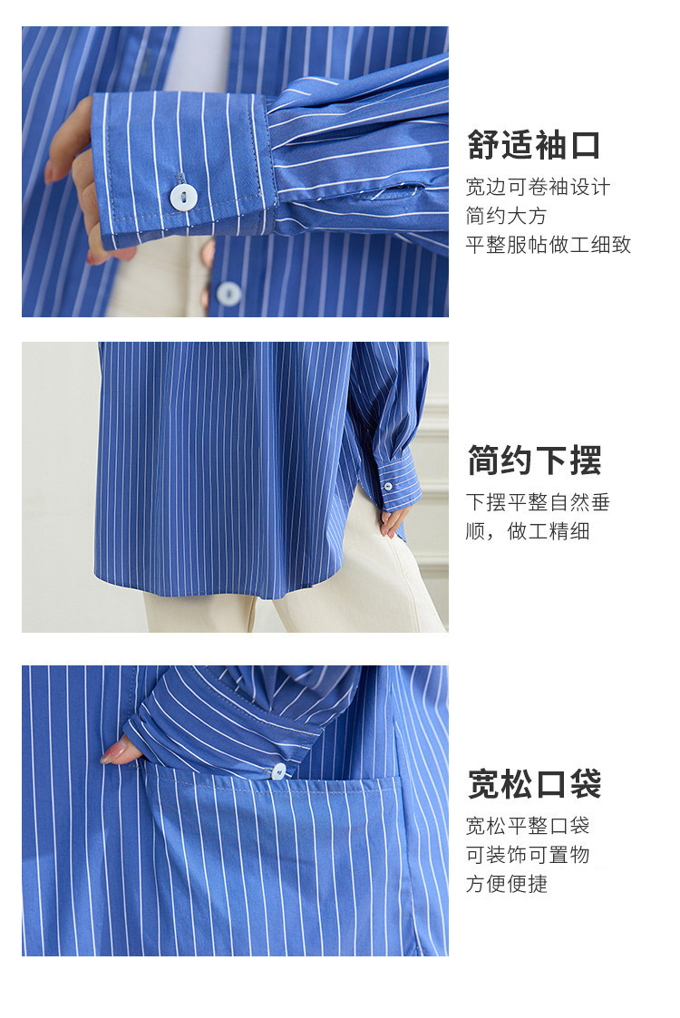 罗蒙春季蓝色条纹长袖衬衫女士宽松休闲百搭落肩版棉质衬衫外套女
