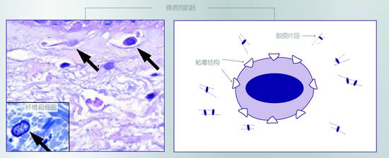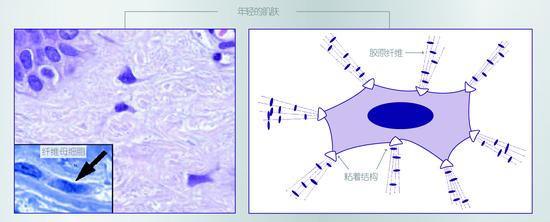 这些粘着结构确保真皮层细胞的细胞骨架蛋白和纤维母细胞与基质成分相互连接。