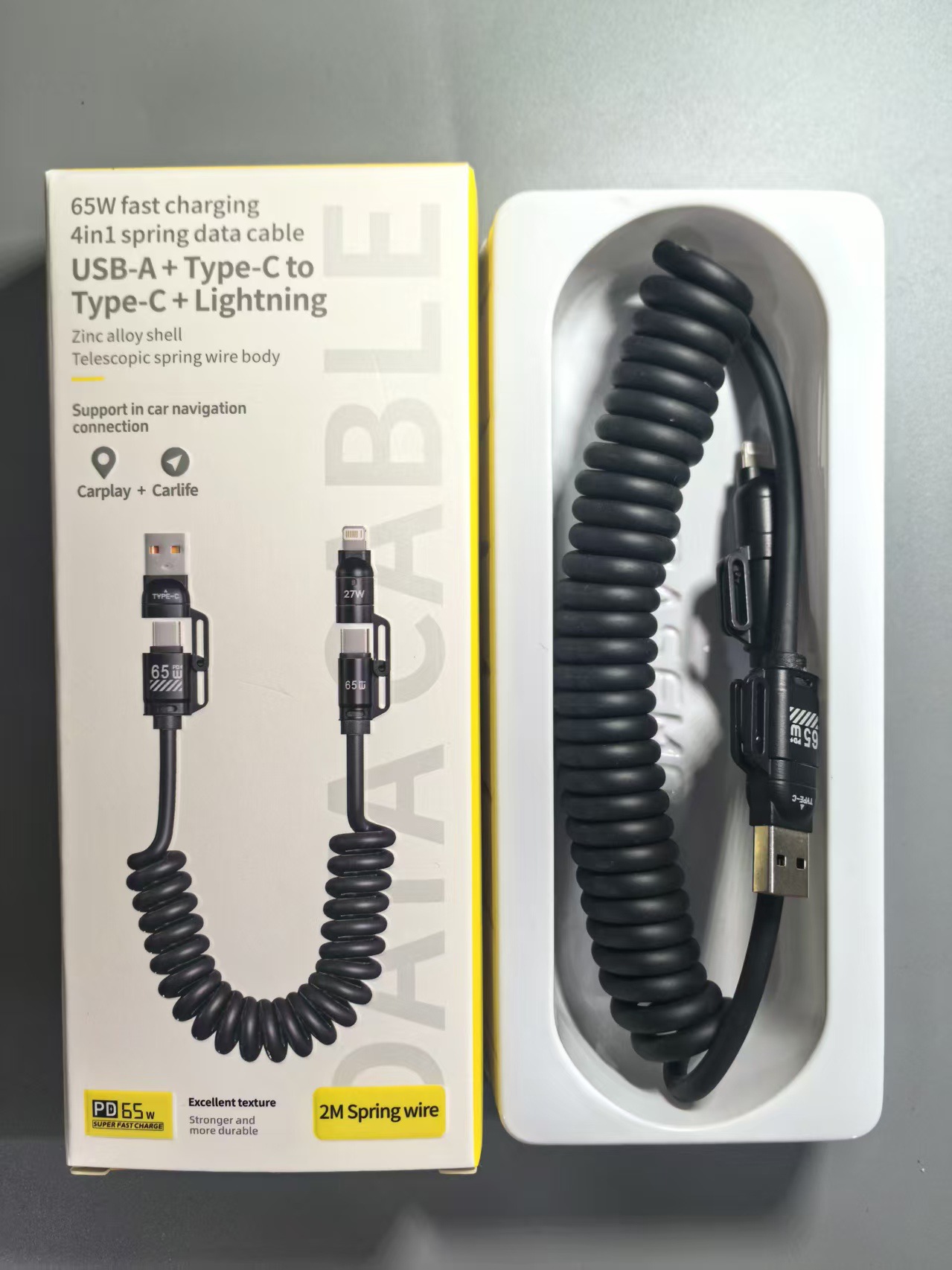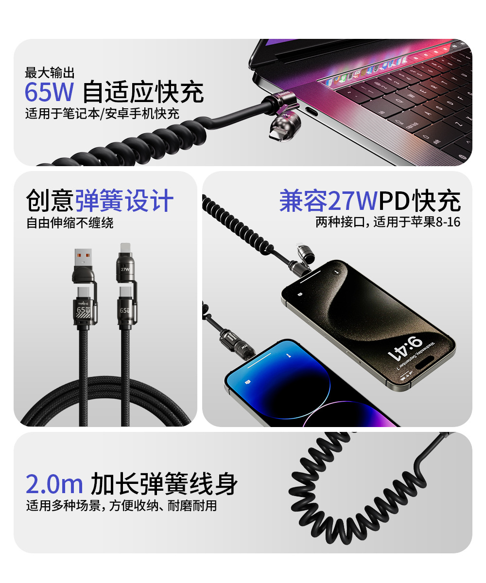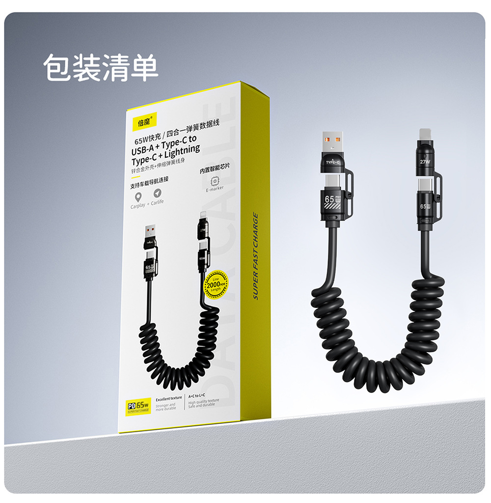 「3米弹簧线!四合一插头」倍魔65W超级快充弹簧数据线 四合一适用于华为苹果16数码配件 商品图2