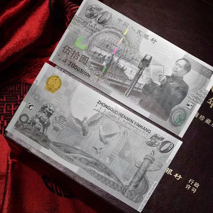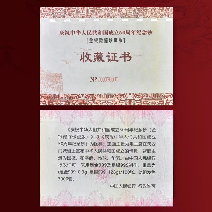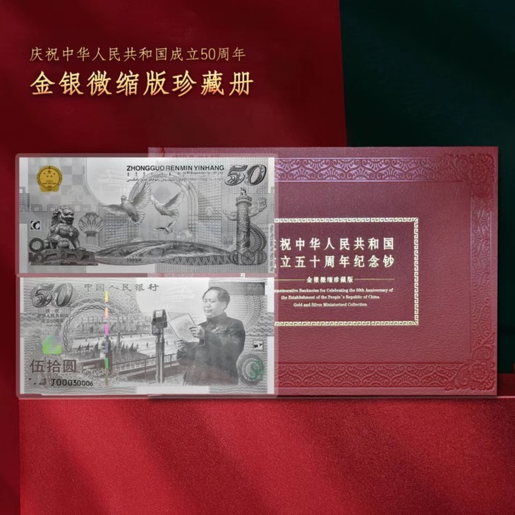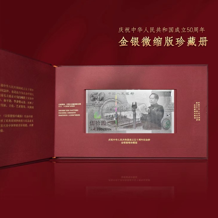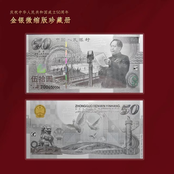 这张银卡含0.003克金和1.28克银,精美复刻了我国首枚纪念钞——建国50周年纪念钞,还原度超高!