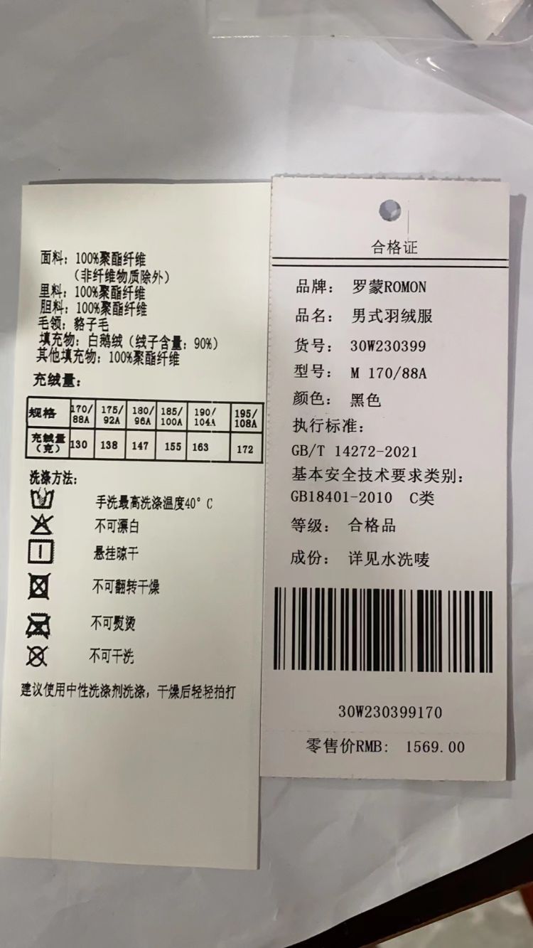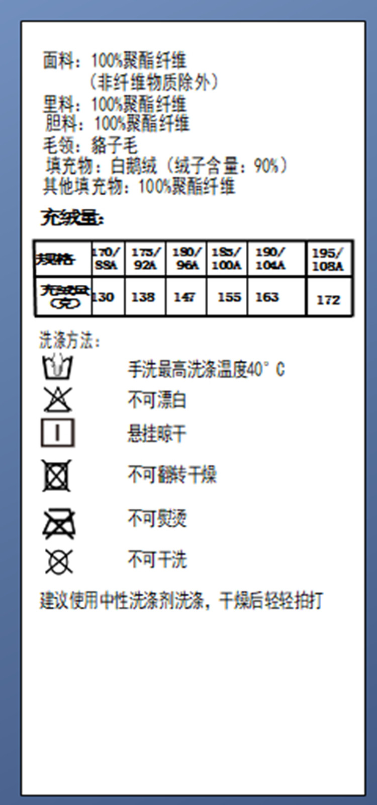 里料:100%聚酯纤维 胆料:100%聚酯纤维