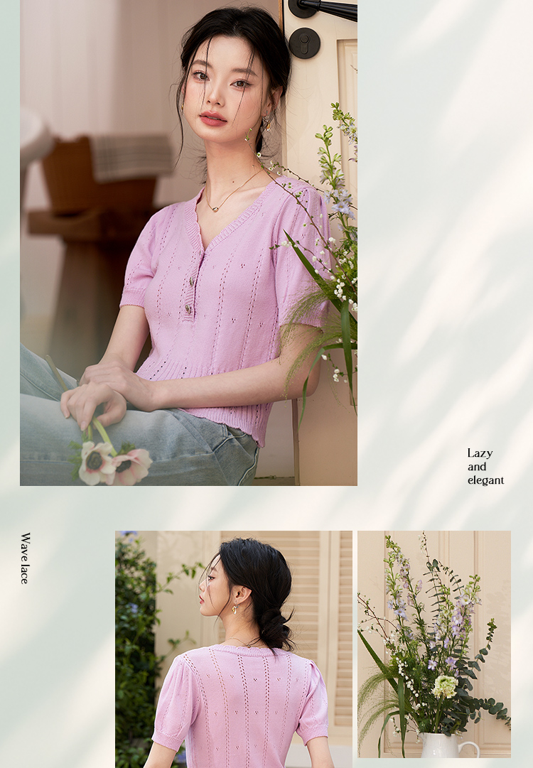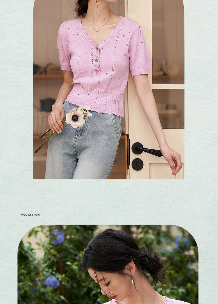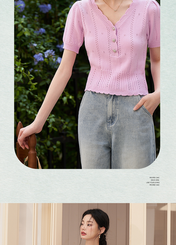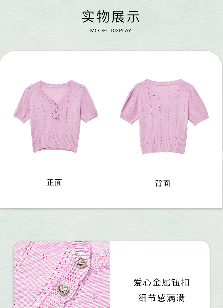 通勤风气质甜美花边短款针织衫女春夏季短款收腰V领毛衣V1040779/V0051036