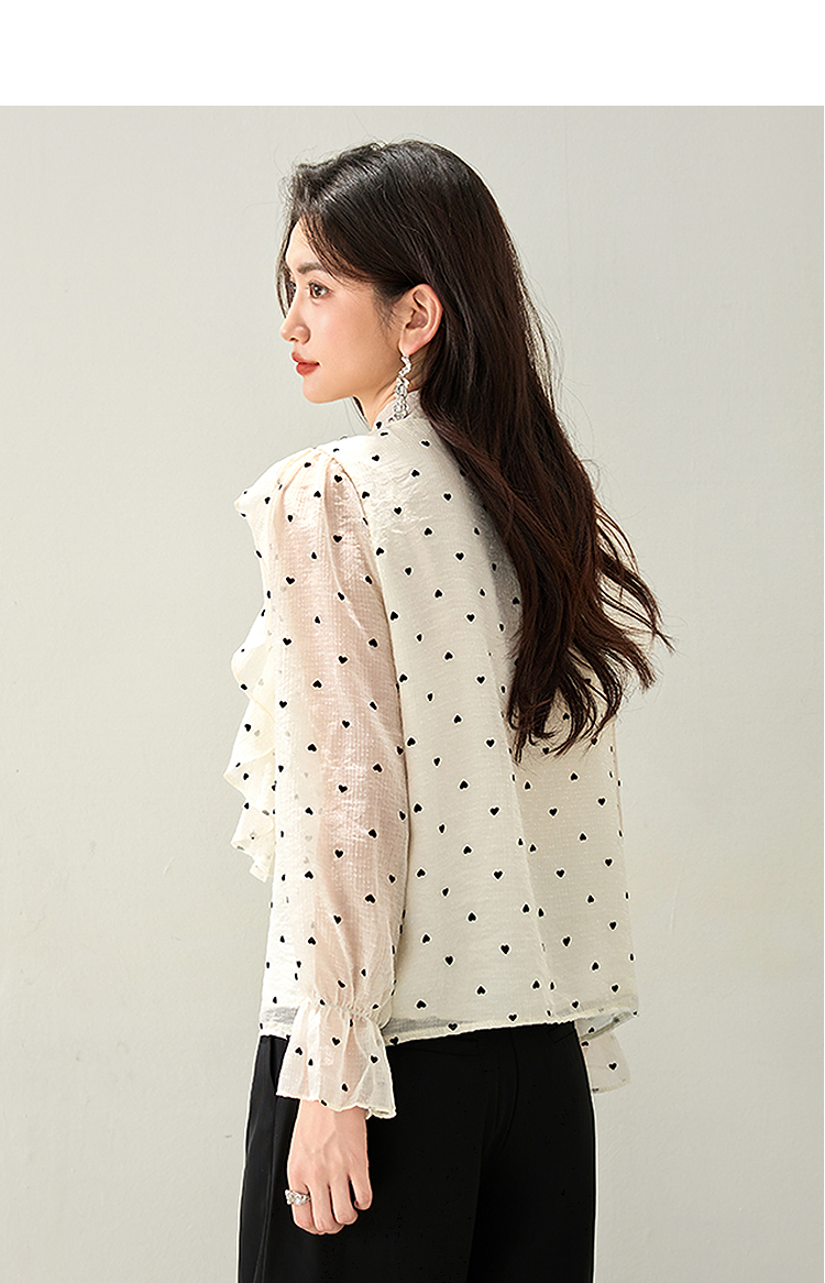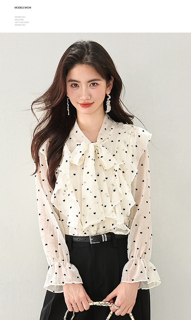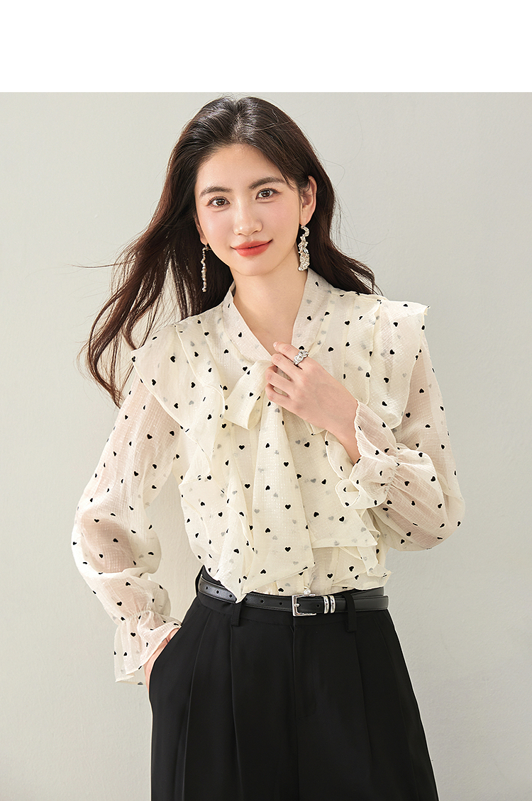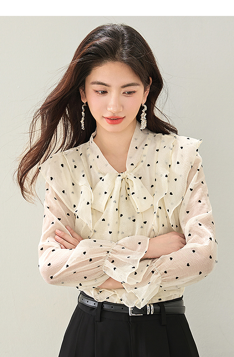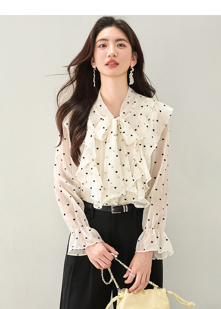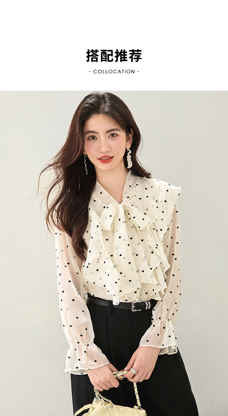 西遇荷叶边波点长袖衬衫女2026年春季新款法式v领宽松蝴蝶结上衣SS060151