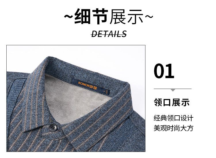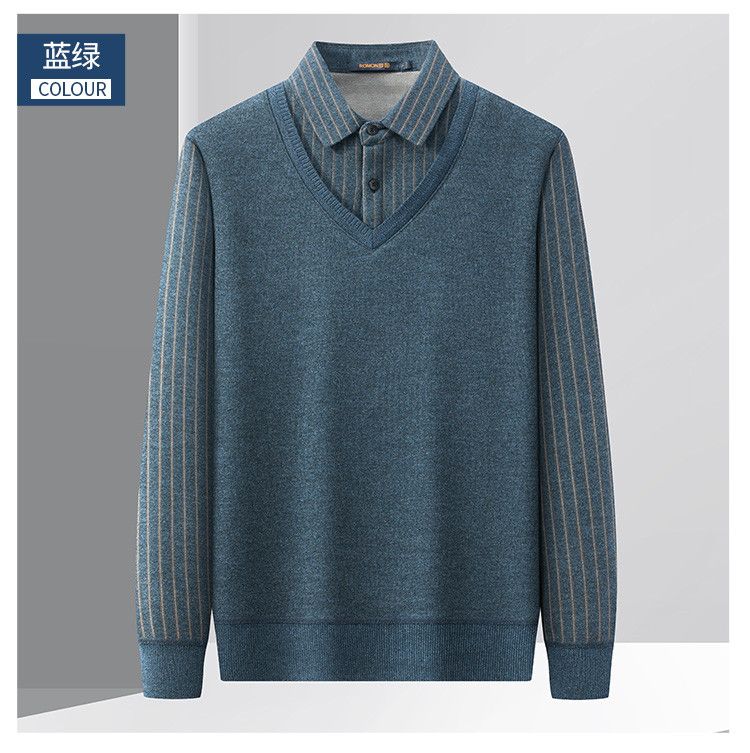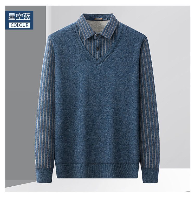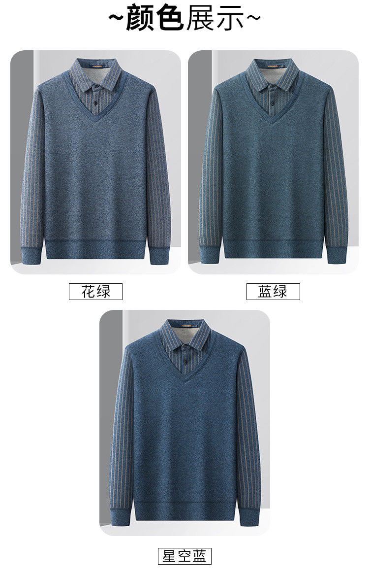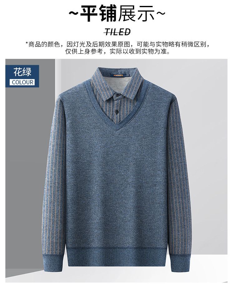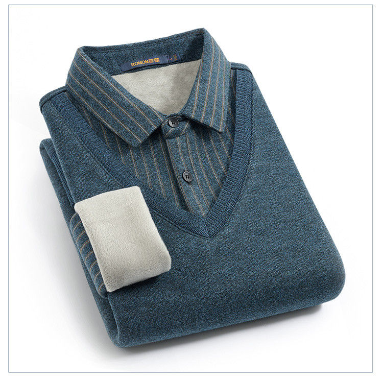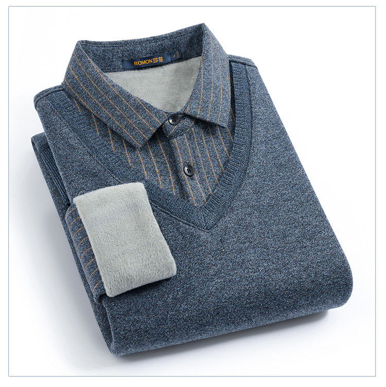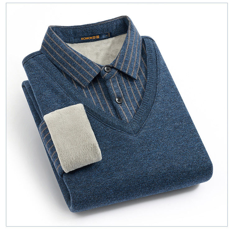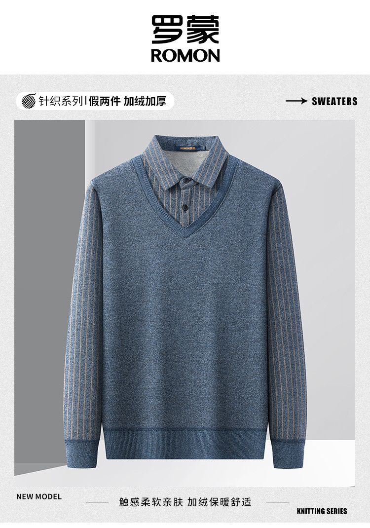 【加绒加厚】罗蒙秋冬男士奥利绒假两件加绒毛衣男针织衫男保暖加绒衬衫男毛衣