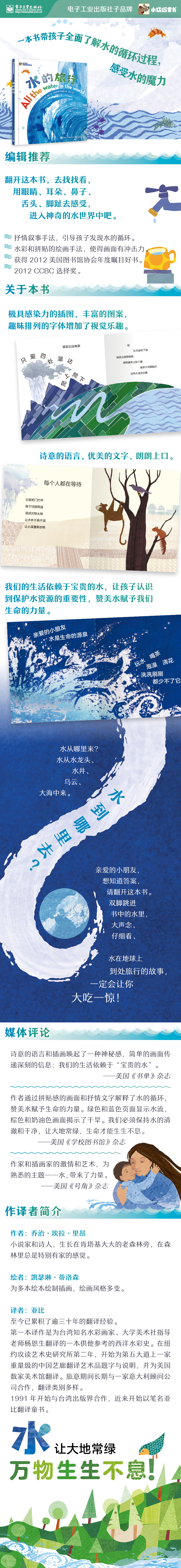 **具感染力的插图,丰富的图案,趣味排列的字体增加了视觉乐趣。诗意的语言,让孩子了解水的循环,赞美水赋予我们生命的力量,我们的生活依赖于宝贵的水。