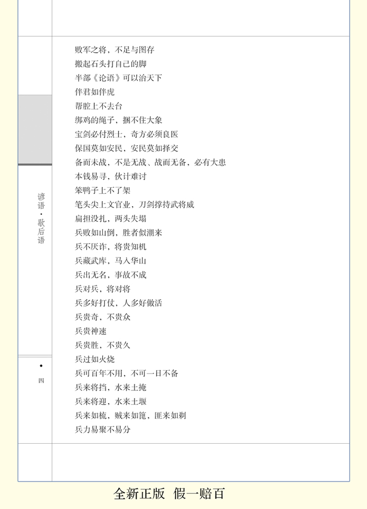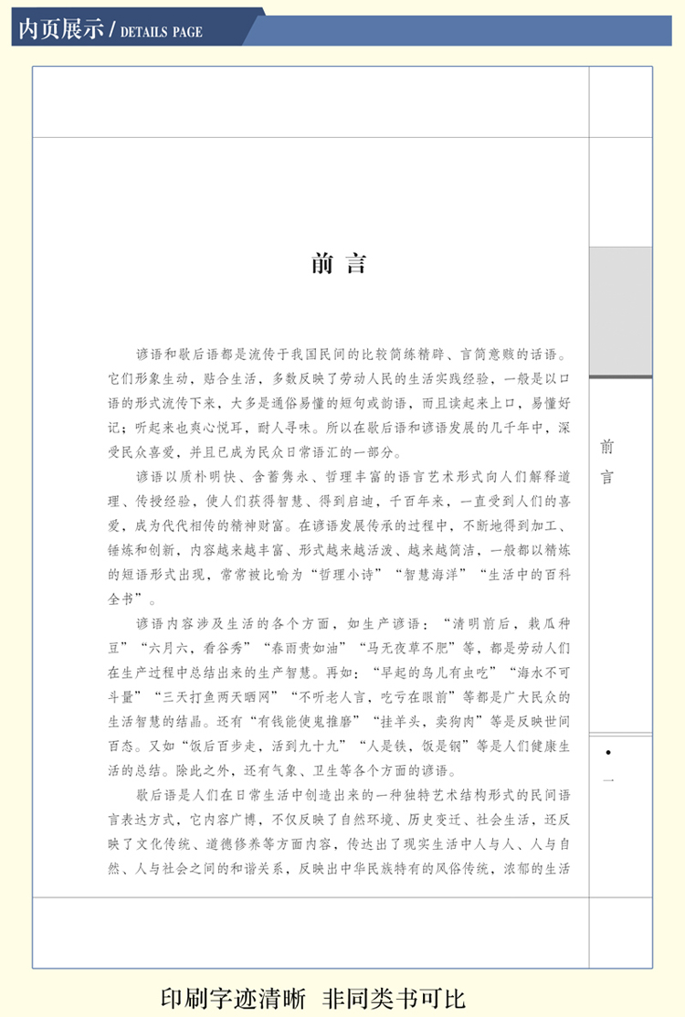 谚语以质朴明快、含蓄隽永、哲理丰富的语言艺术形式向人们解释道理、传授经验,使人们获得智慧、得到启迪,千百年来,一直受到人们的喜爱,成为代代相传的精神财富。在谚语发展传承的过程中,不断地得到加工、锤炼和创新,内容越来越丰富、形式越来越活泼、越来越简洁,一般都以精炼的短语形式出现,常常被比喻为“哲理小诗”“智慧海洋”“生活中的百科全书”。