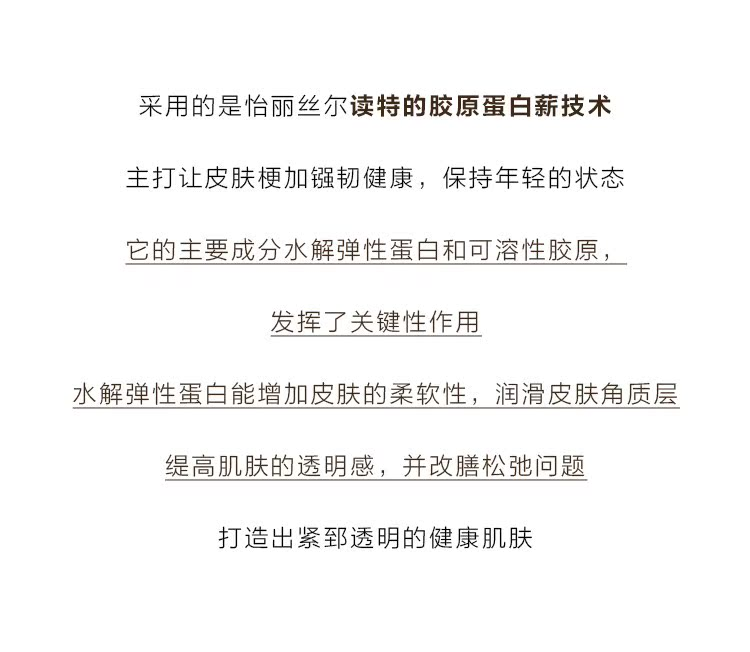 添加传明酸等有效成分亮白肌肤,以及各种胶原成分。用以修FU年龄增长导致的肌肤的暗哑,
