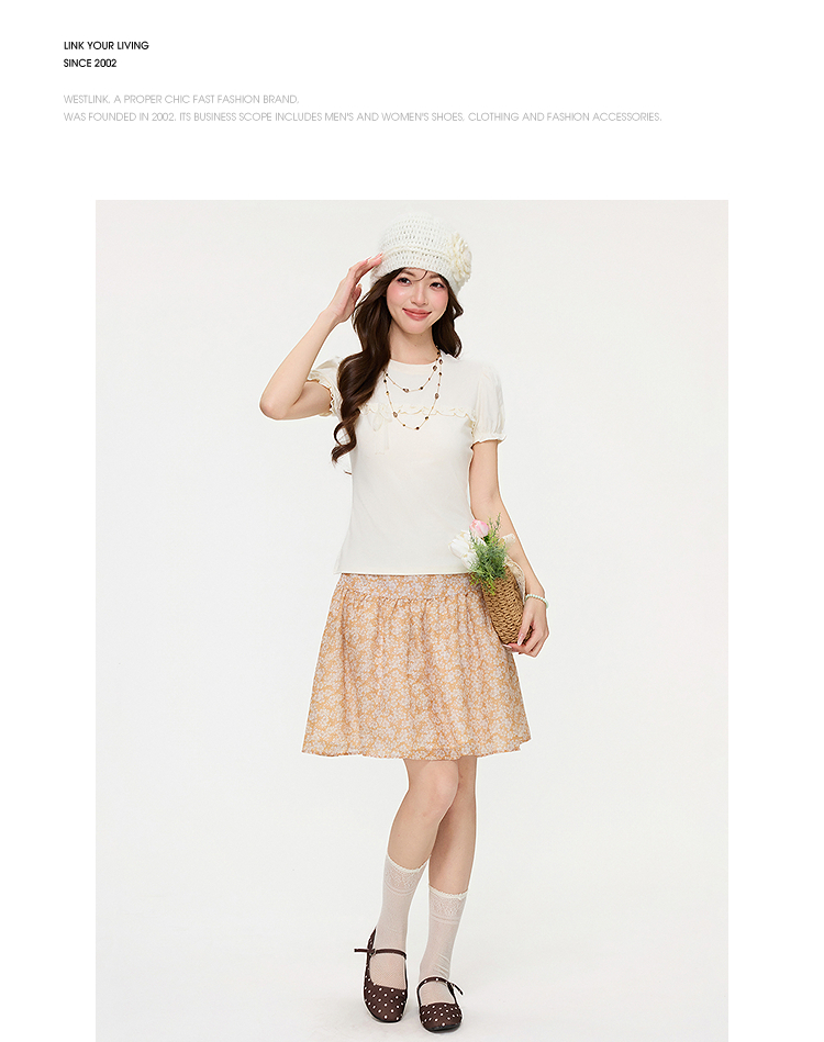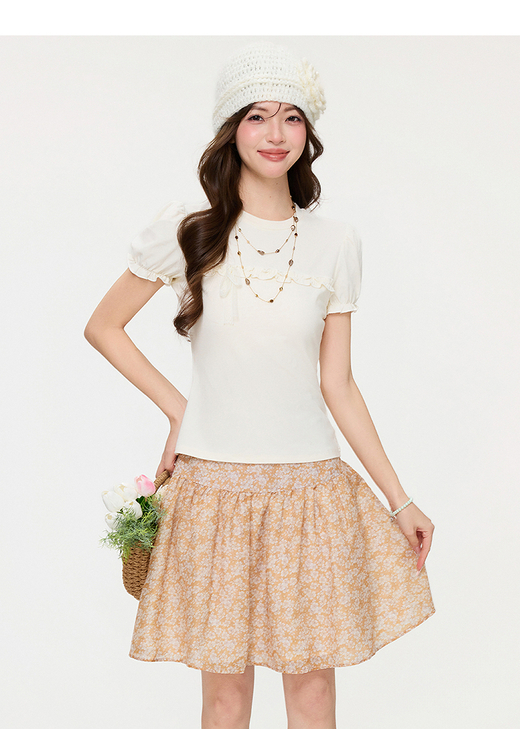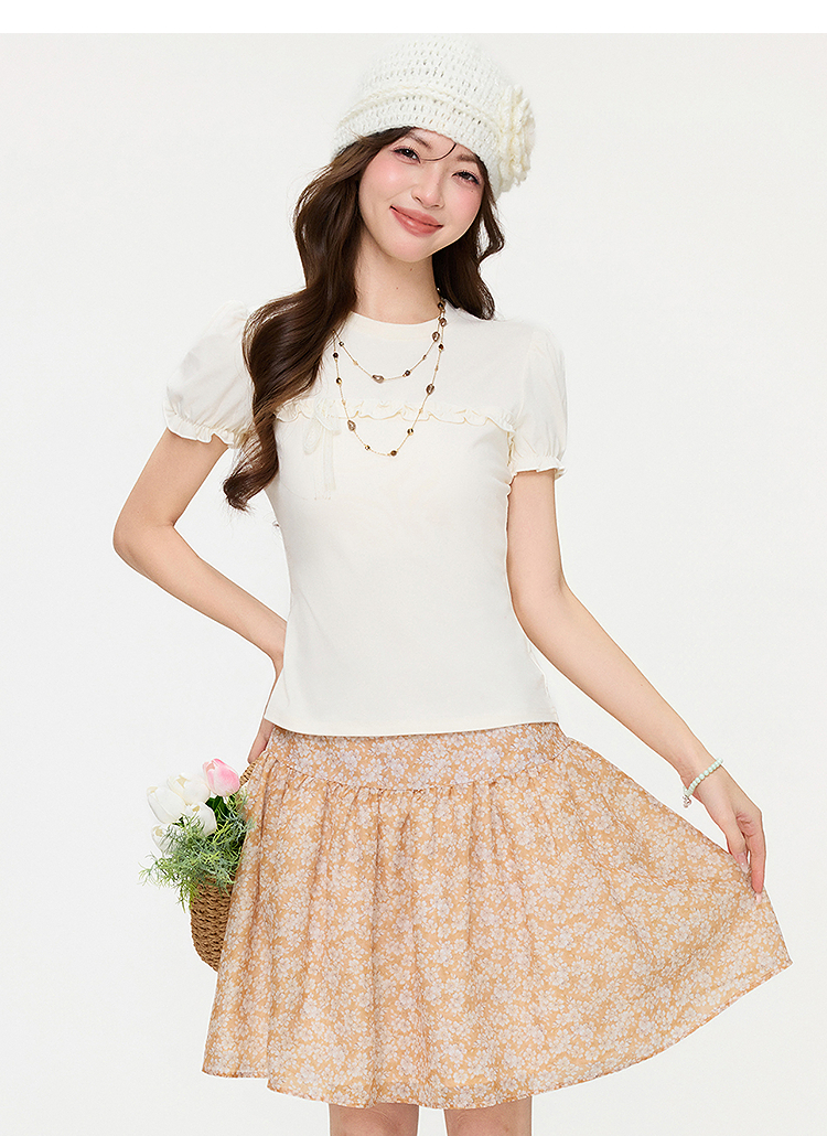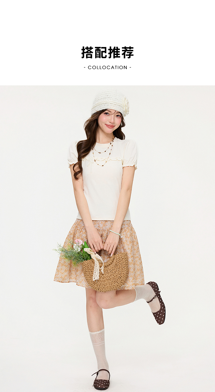 西遇复古拼接荷叶边蝴蝶结短袖T恤女2026夏新款蕾丝修身显瘦上衣SS060251