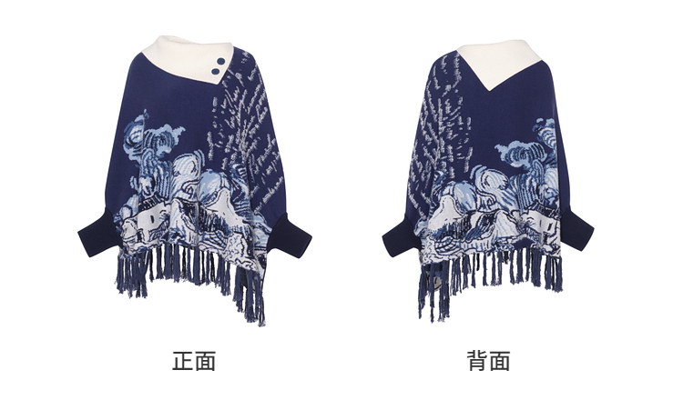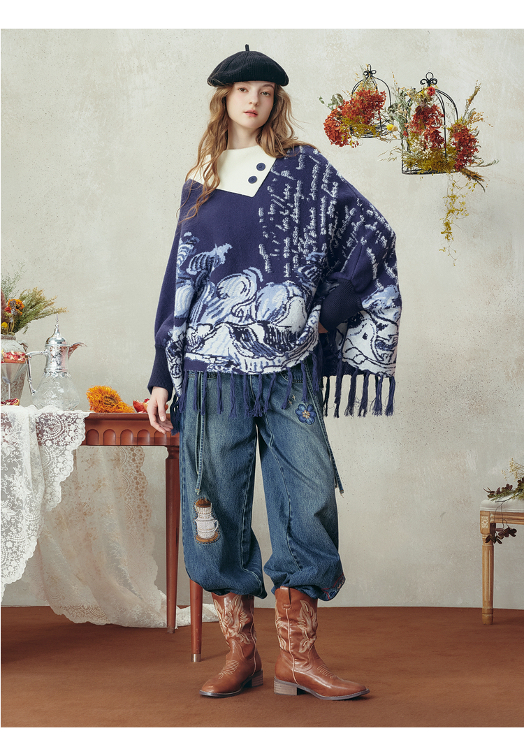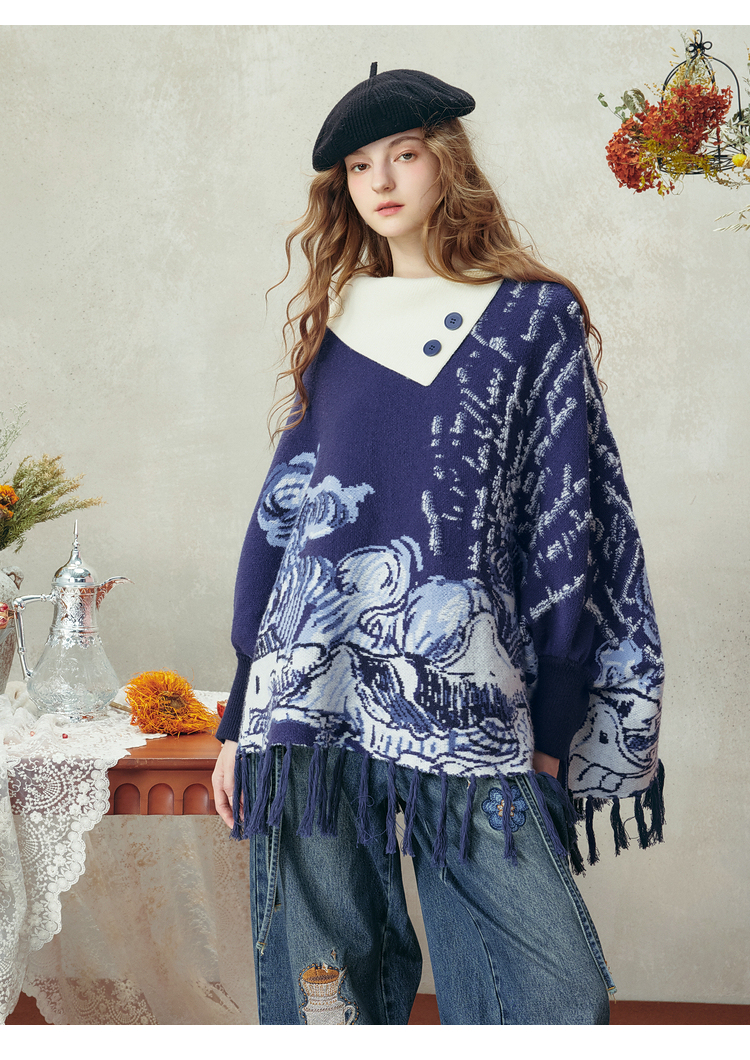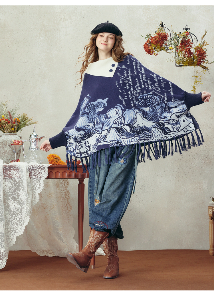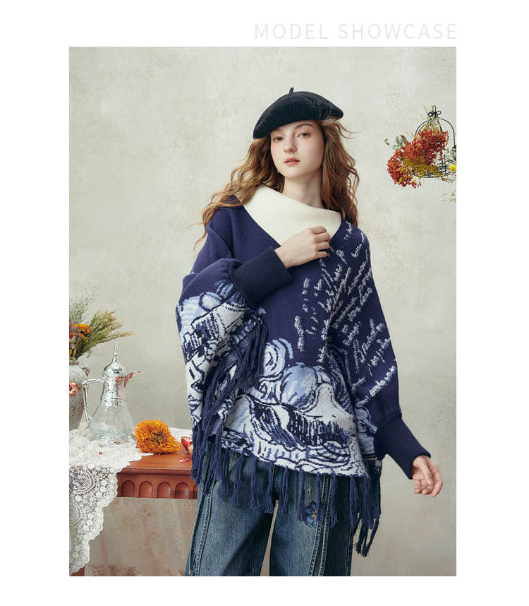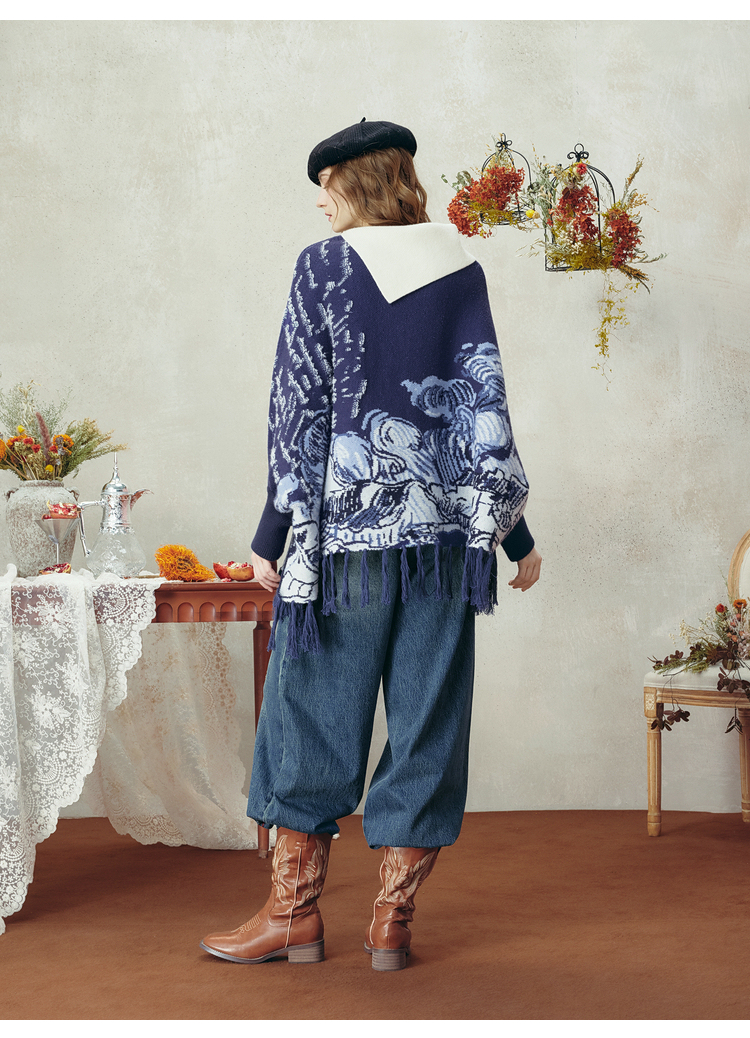 两三事梵高文艺游牧光年2025秋冬款大翻边领流苏下摆花色斗篷毛衣