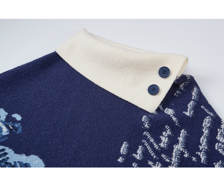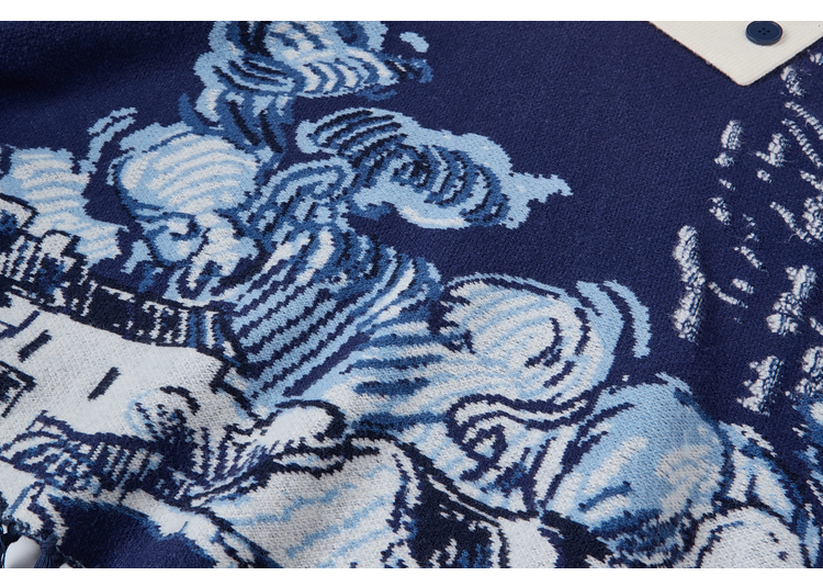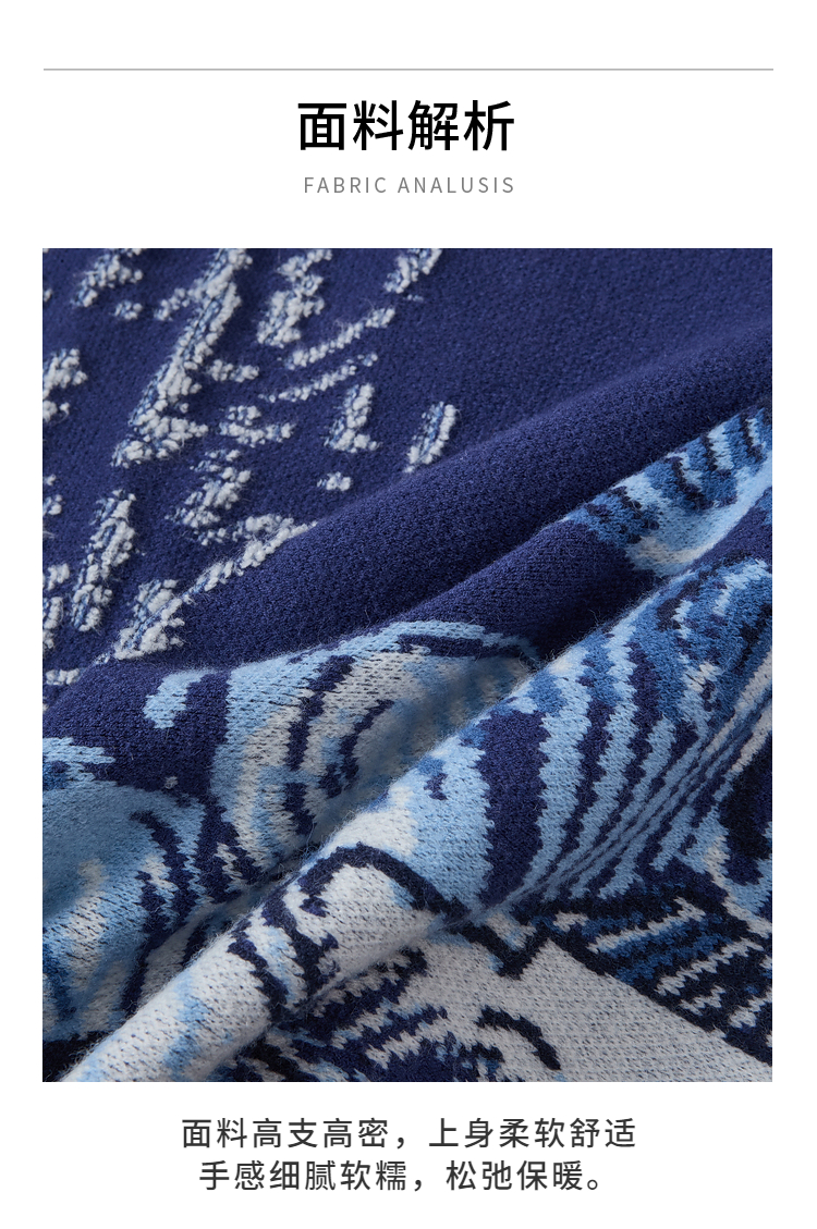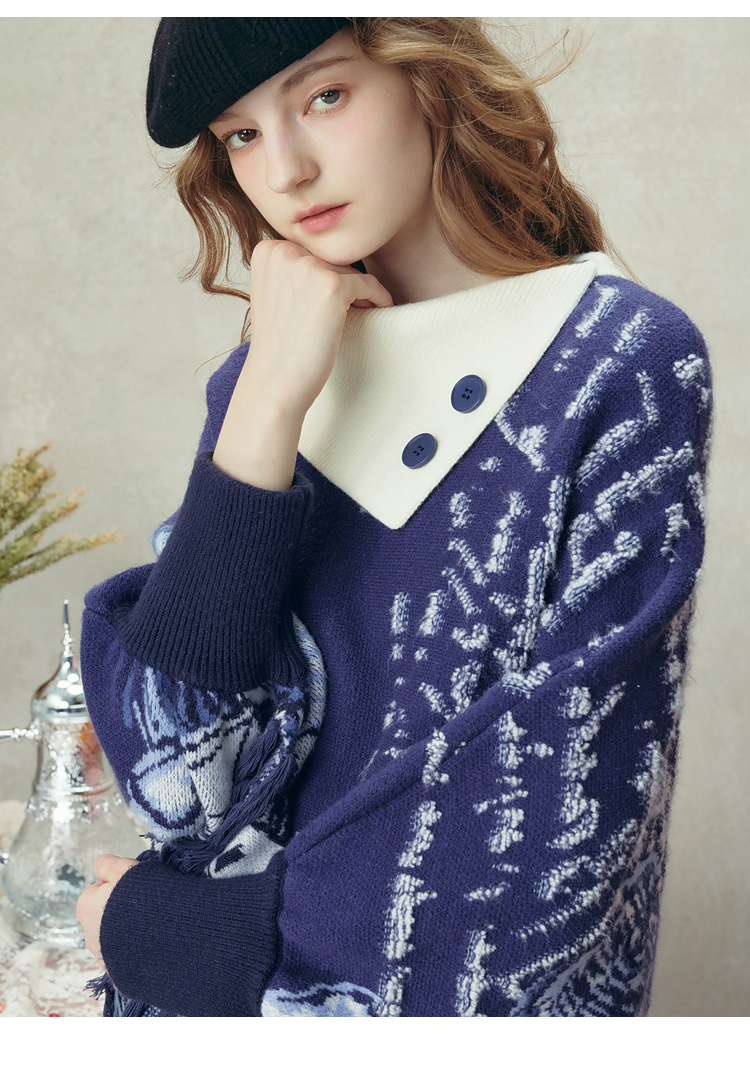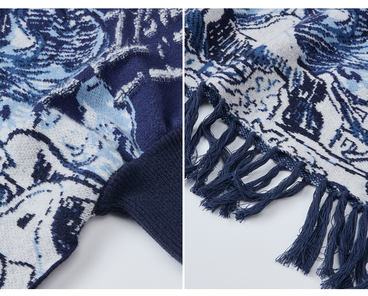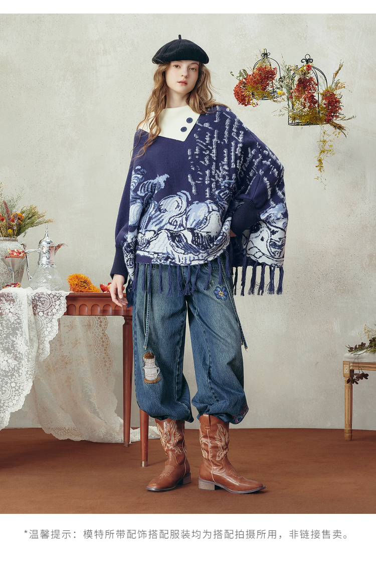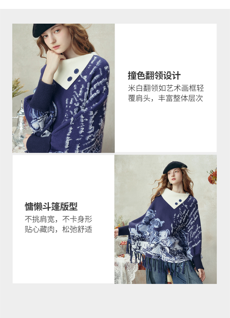 两三事梵高文艺游牧光年2025秋冬款大翻边领流苏下摆花色斗篷毛衣