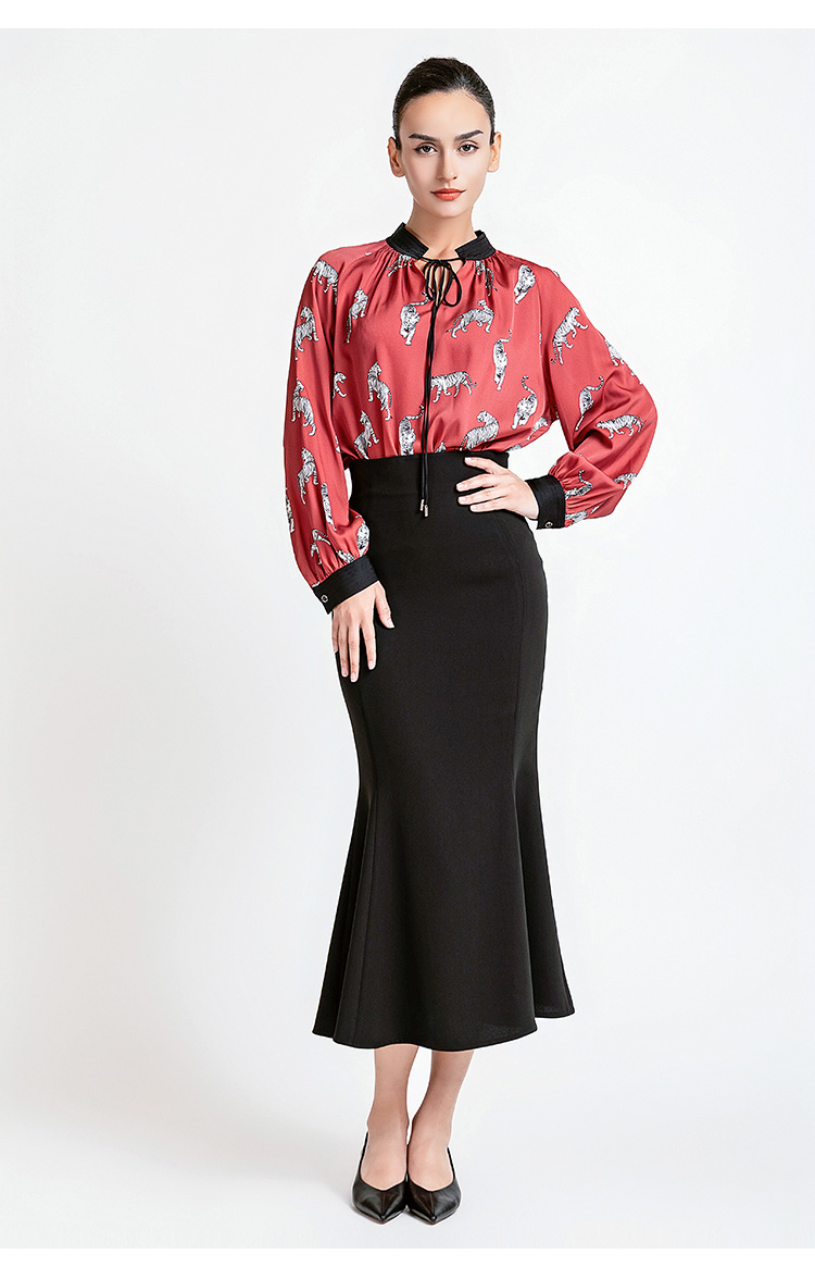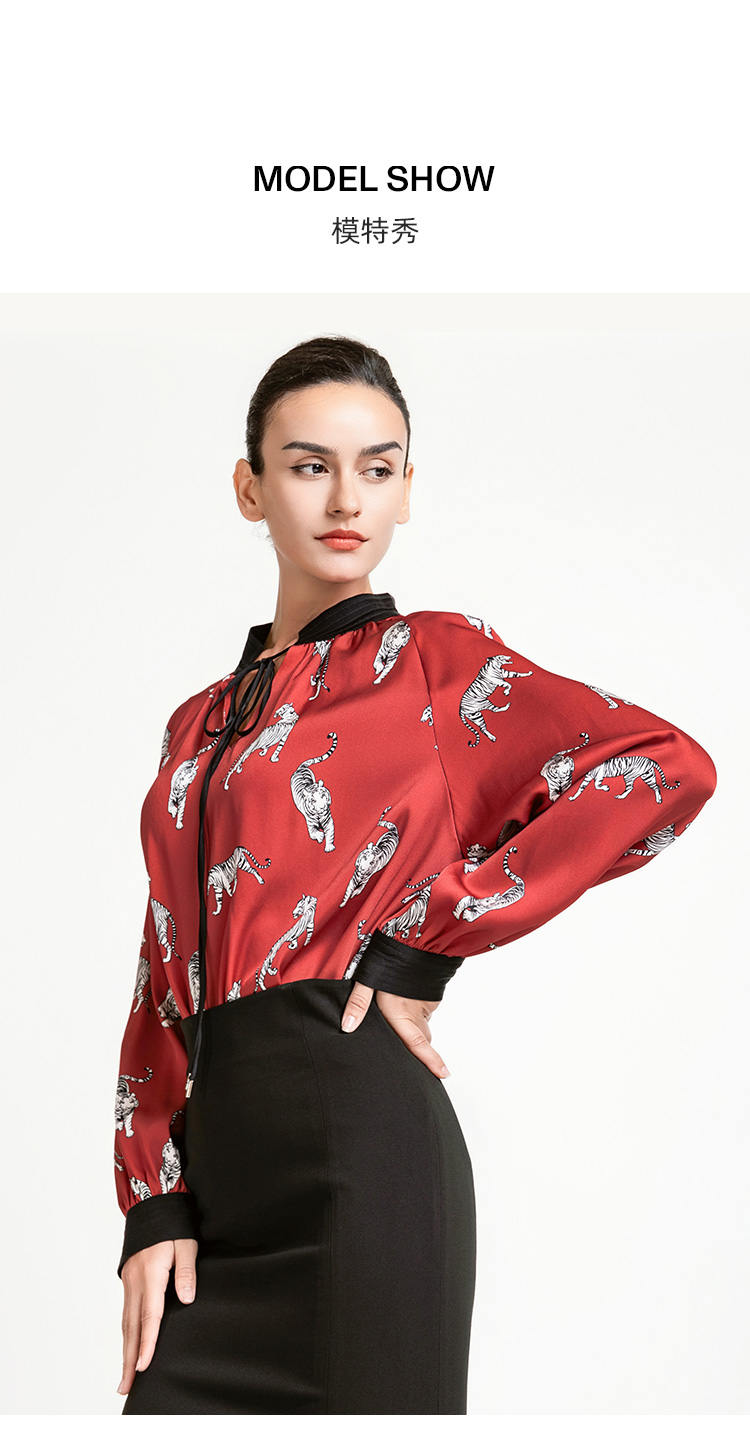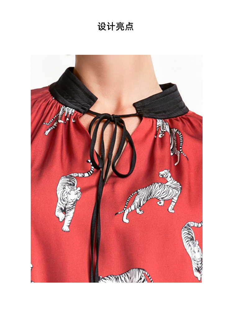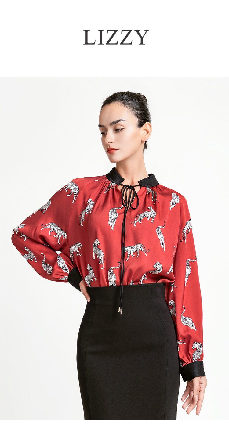 LIZZY 复古时尚洋气动物印花重磅真丝水滴领撞色立领女衬衫7939