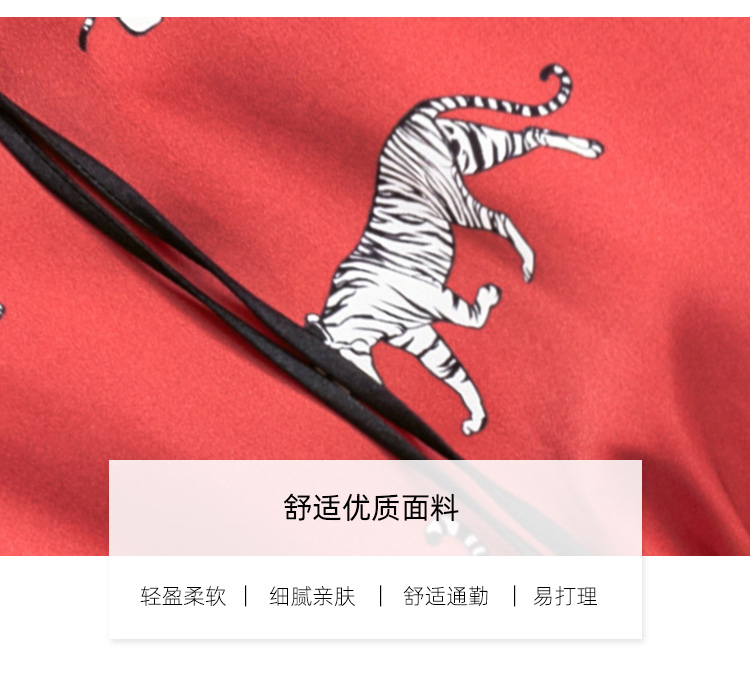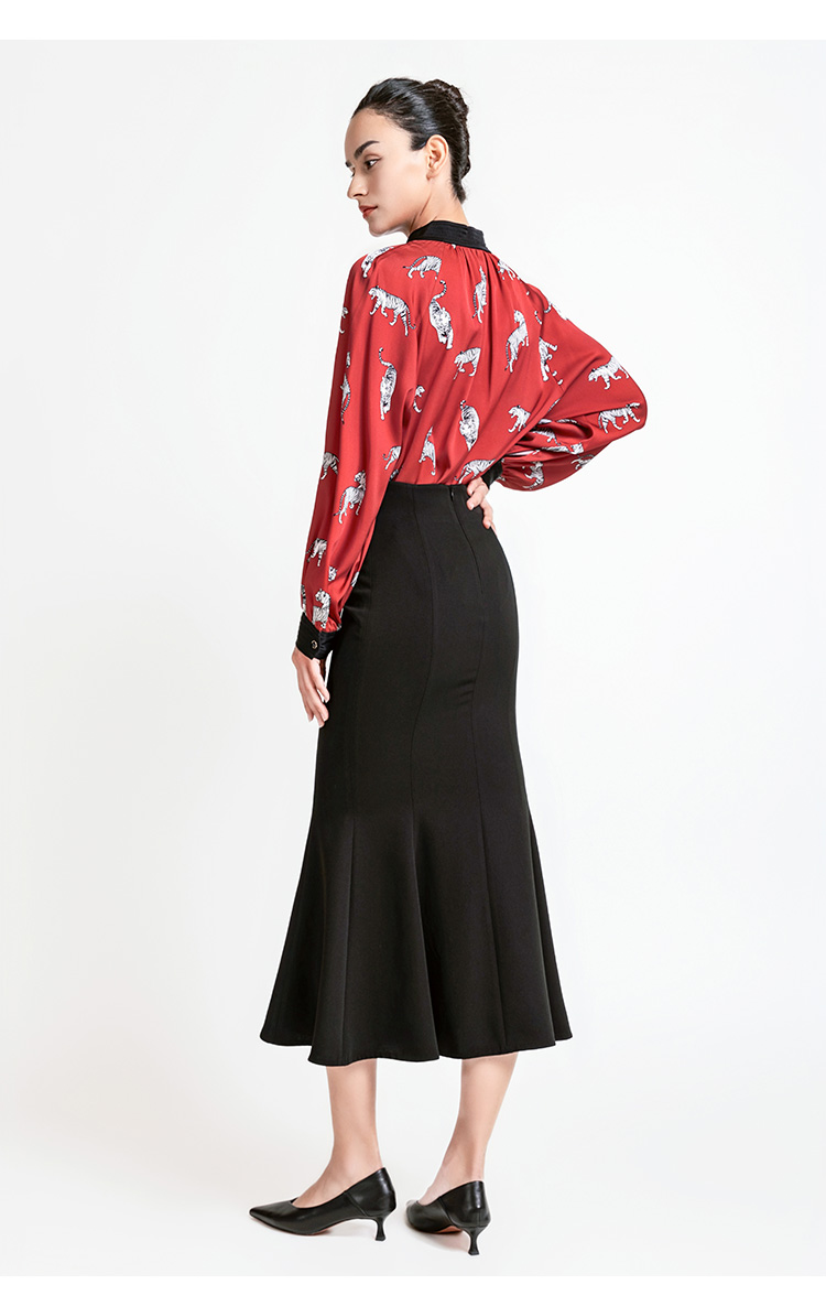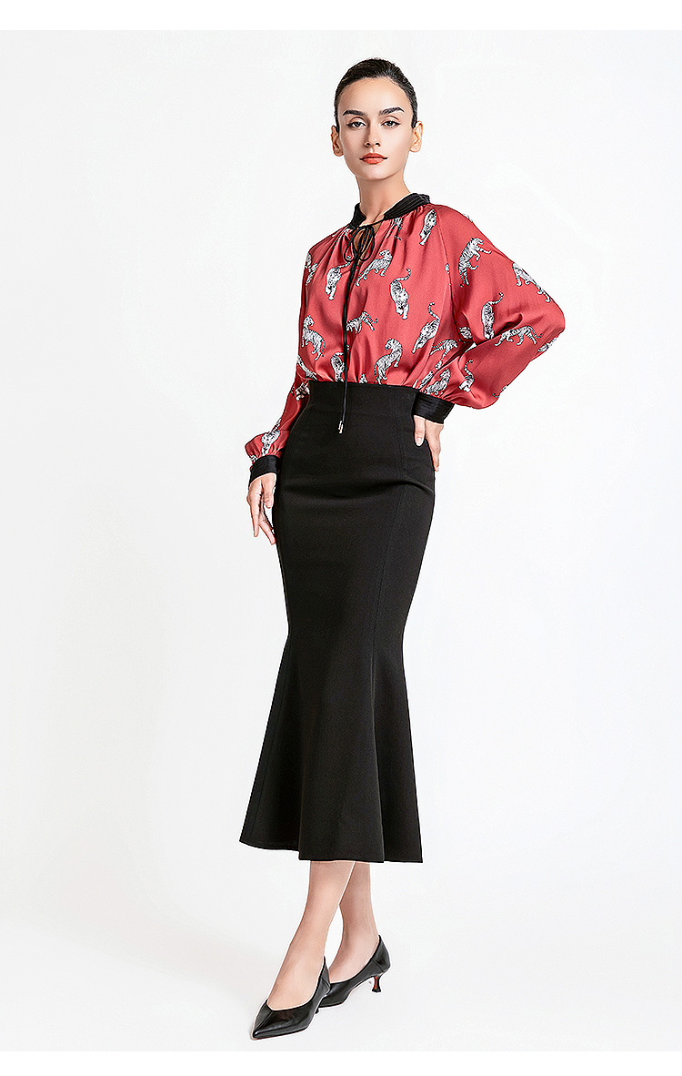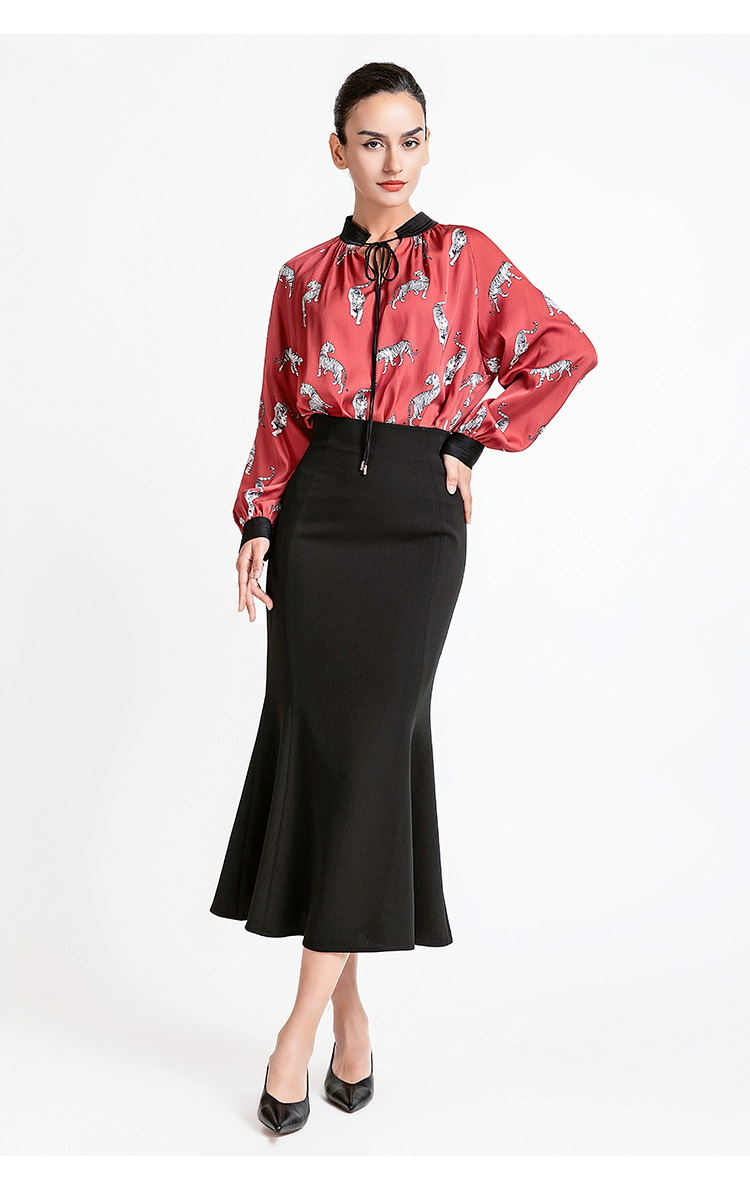 LIZZY 复古时尚洋气动物印花重磅真丝水滴领撞色立领女衬衫7939