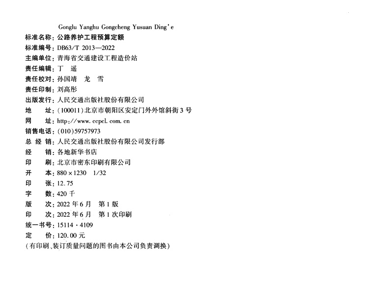 书名:公路养护工程预算定额(DB63/T 2013—2022)