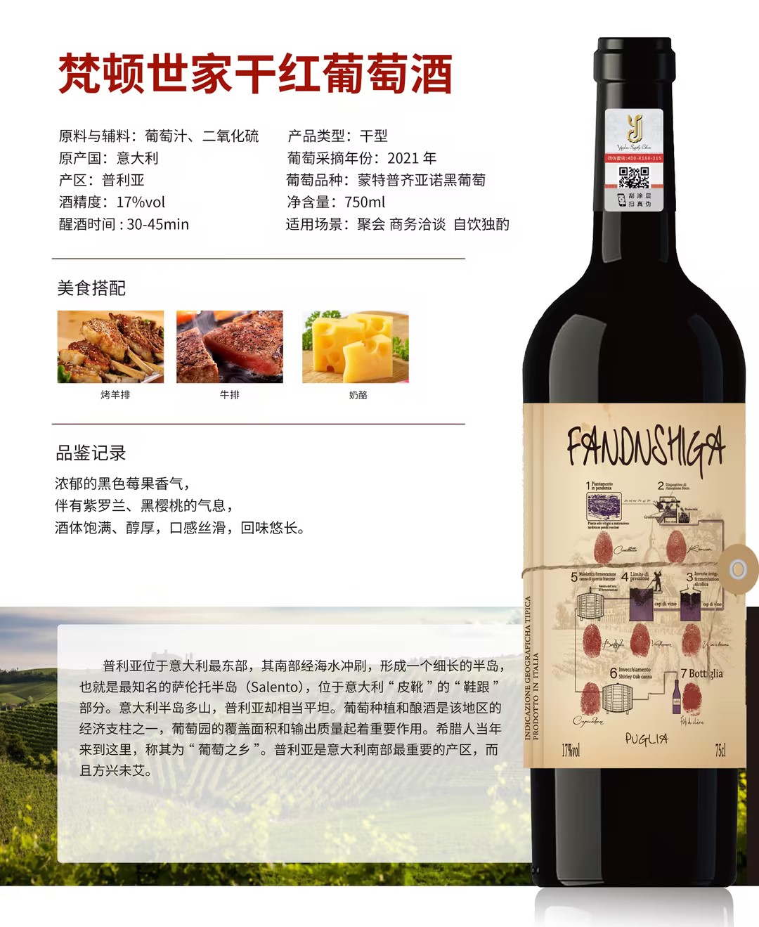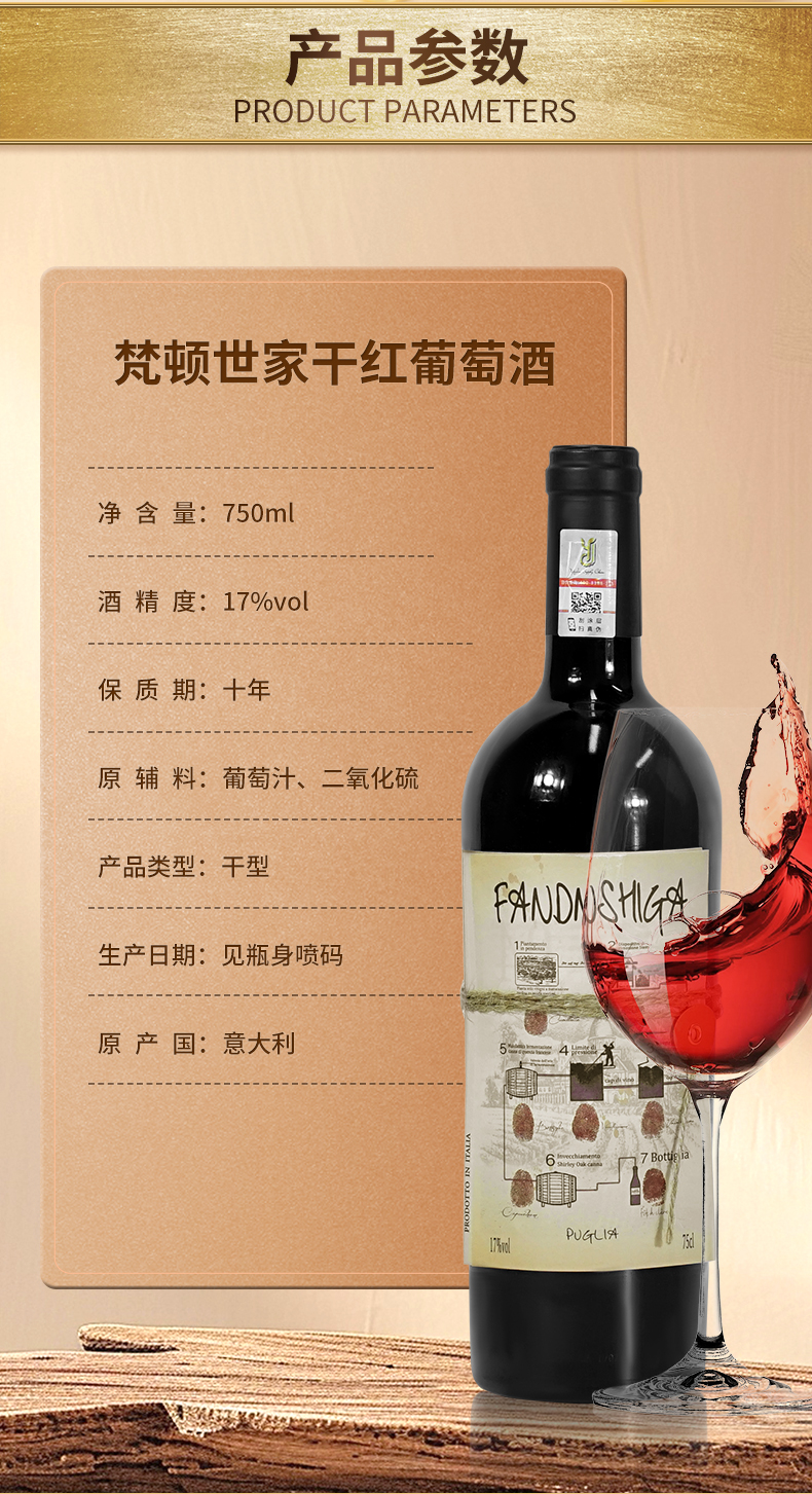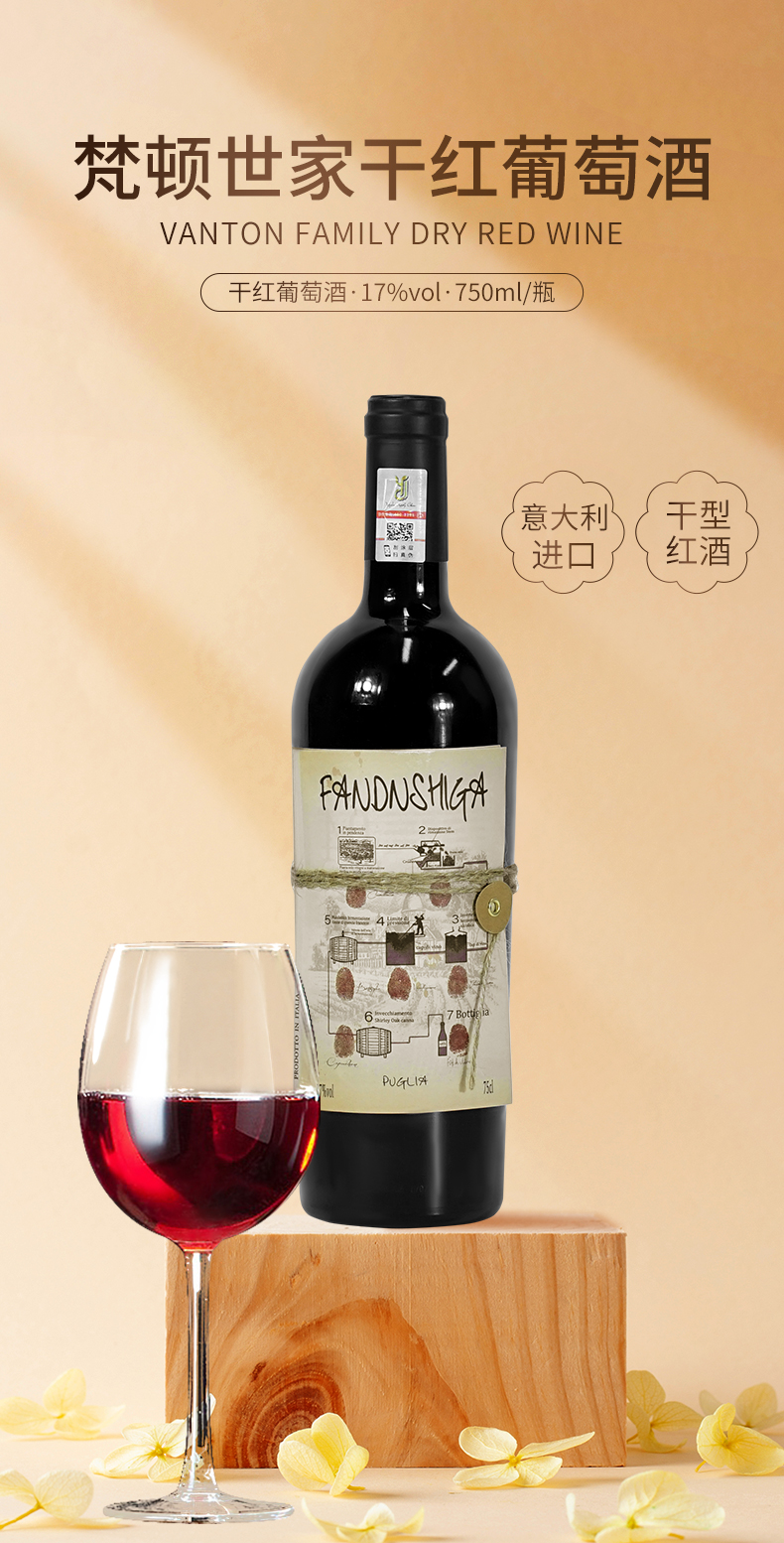 意大利 梵顿世家干红葡萄酒 17度 进口红酒750ml*1支(裸瓶)