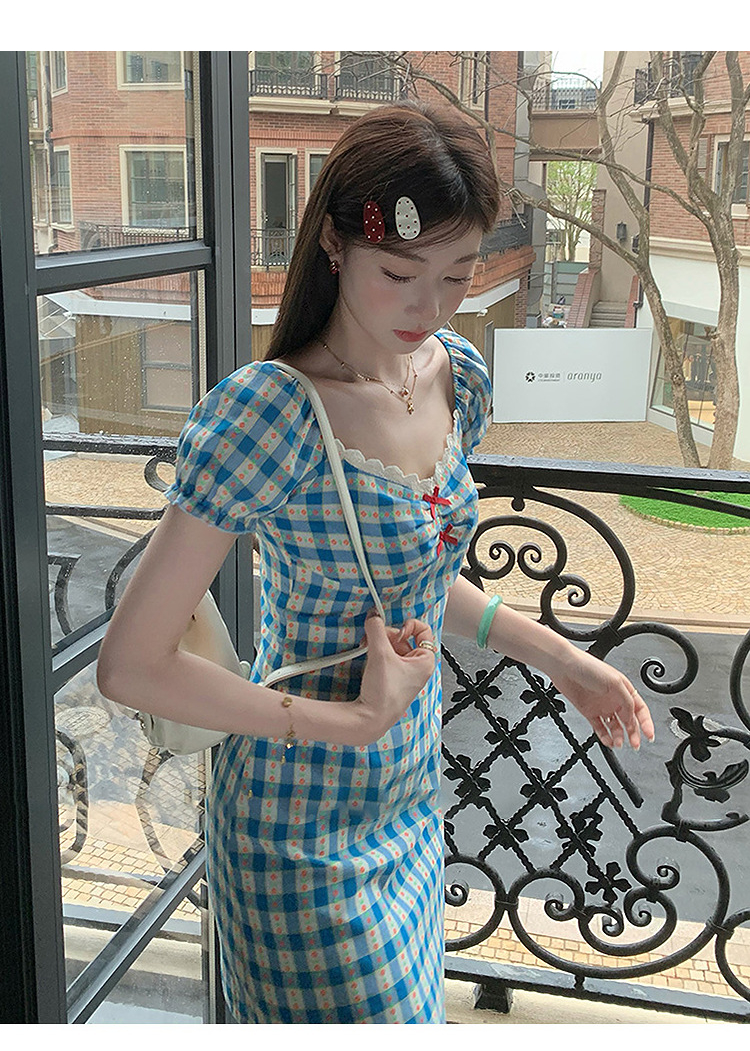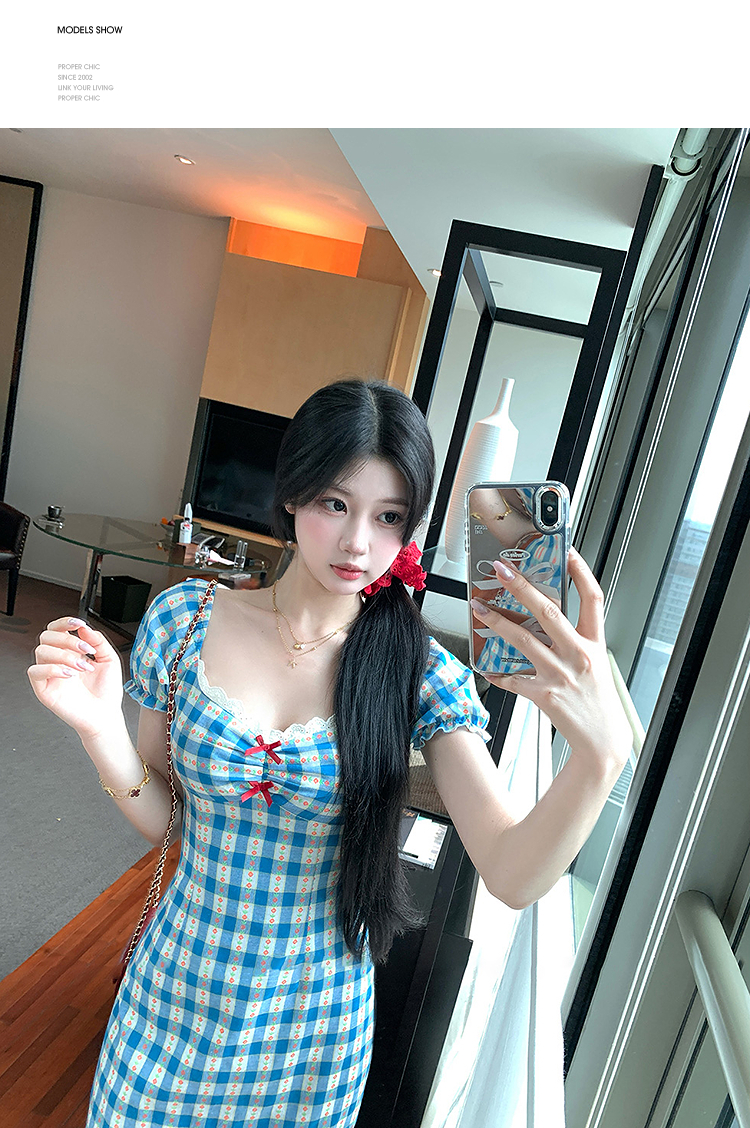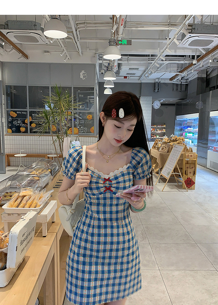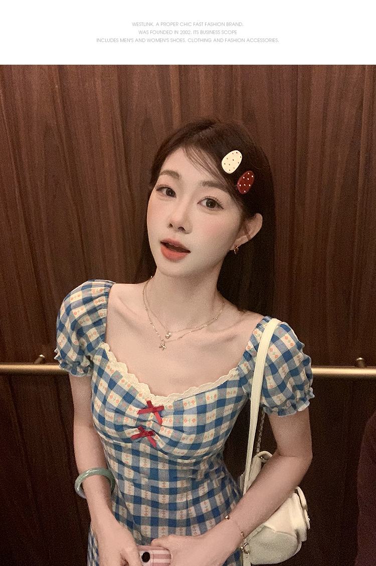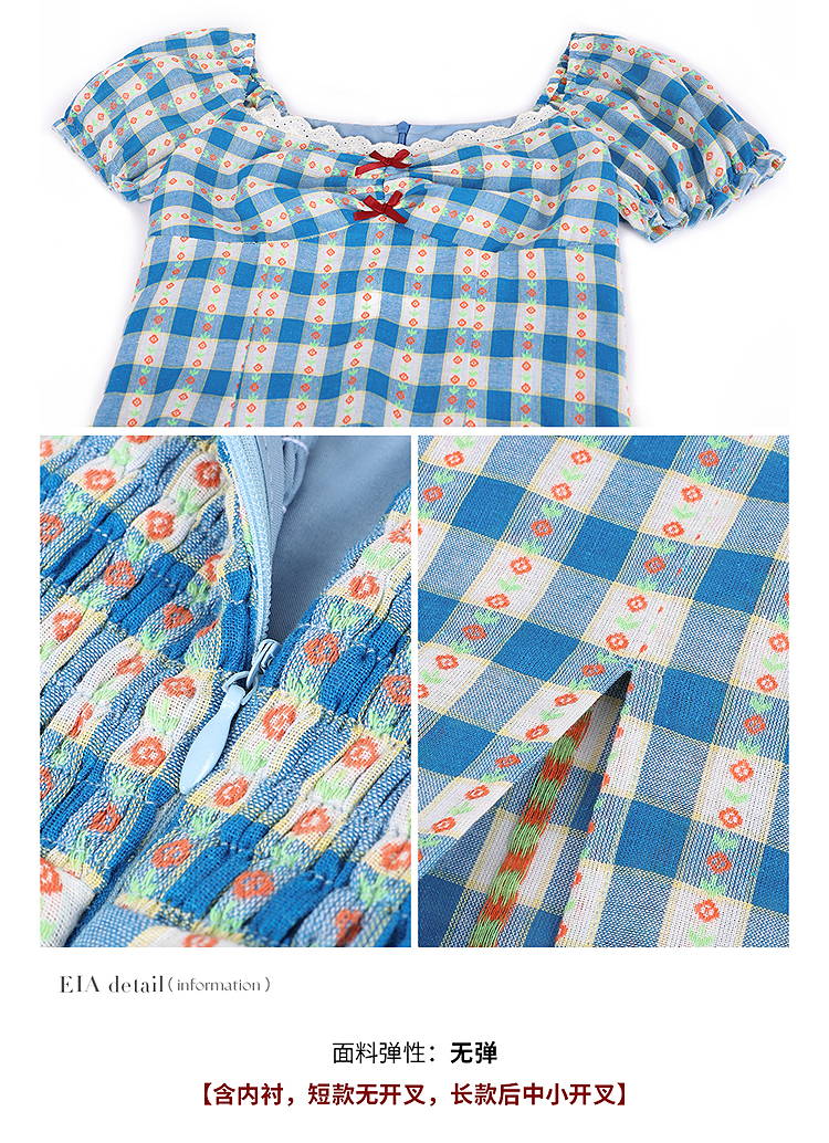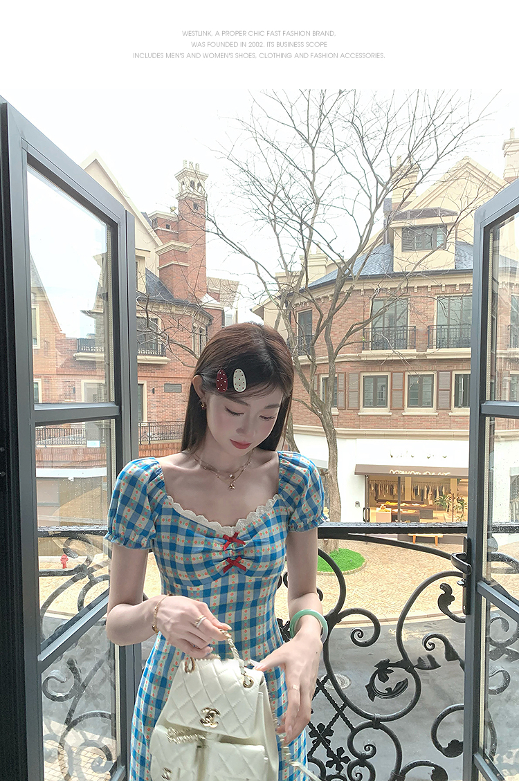 西遇格子泡泡袖连衣裙女夏季新款蝴蝶结蕾丝拼接法式收腰裙子SS050828/SS050829