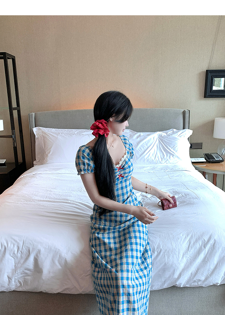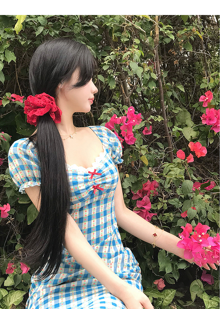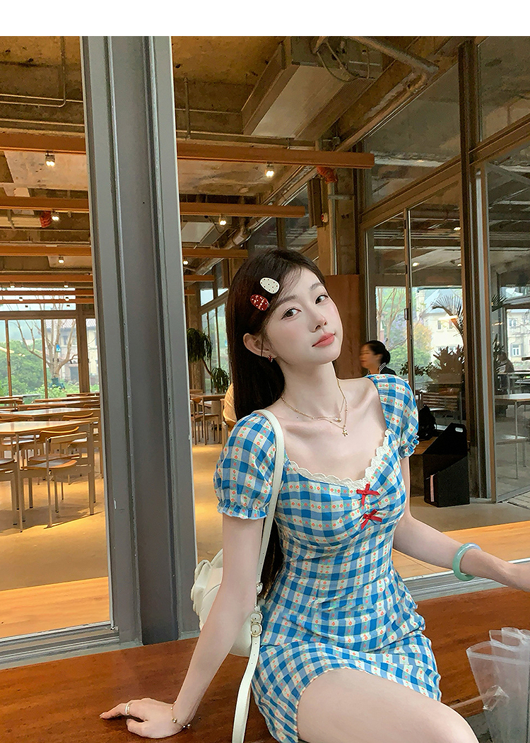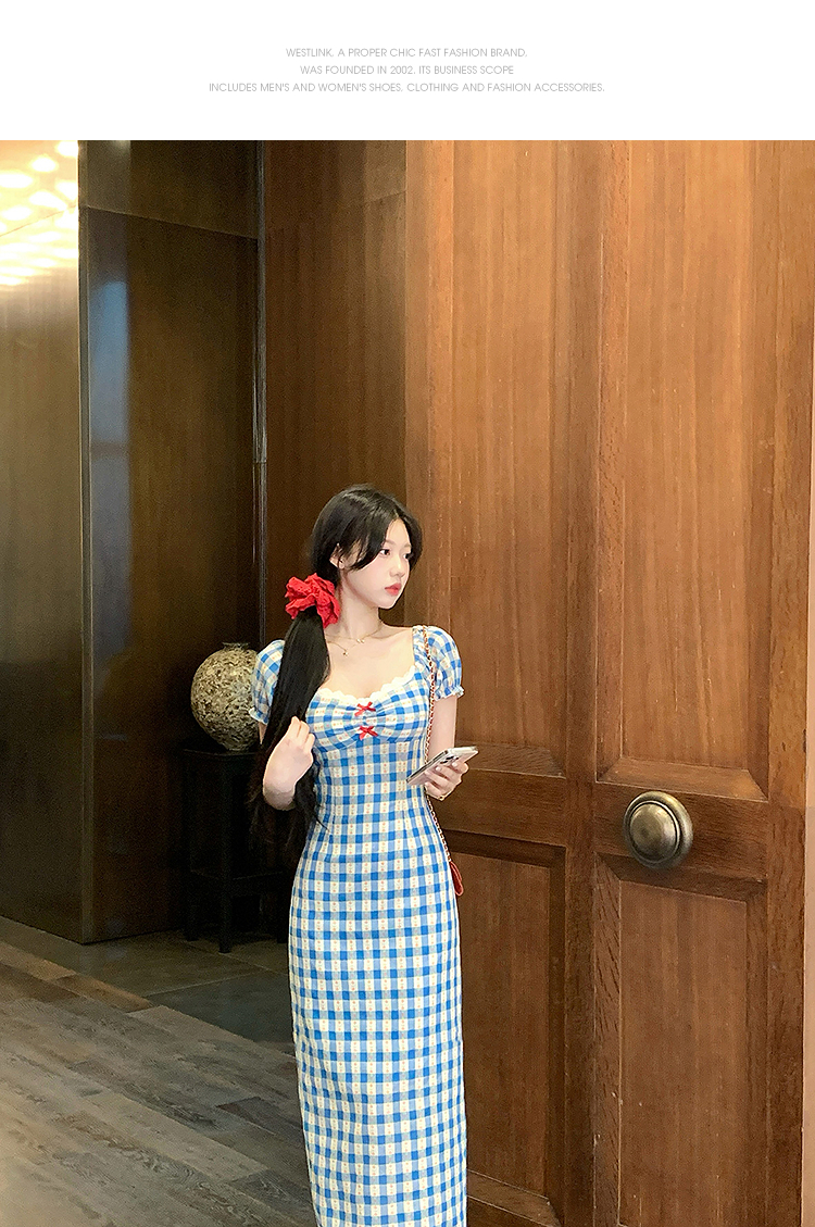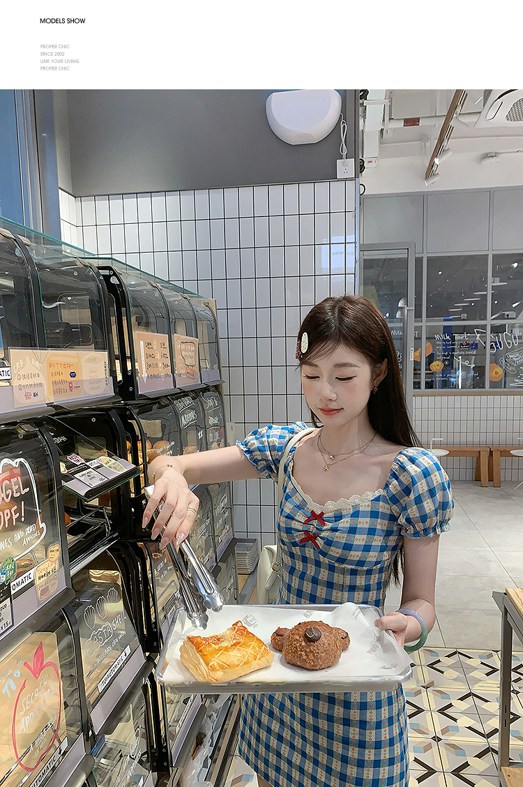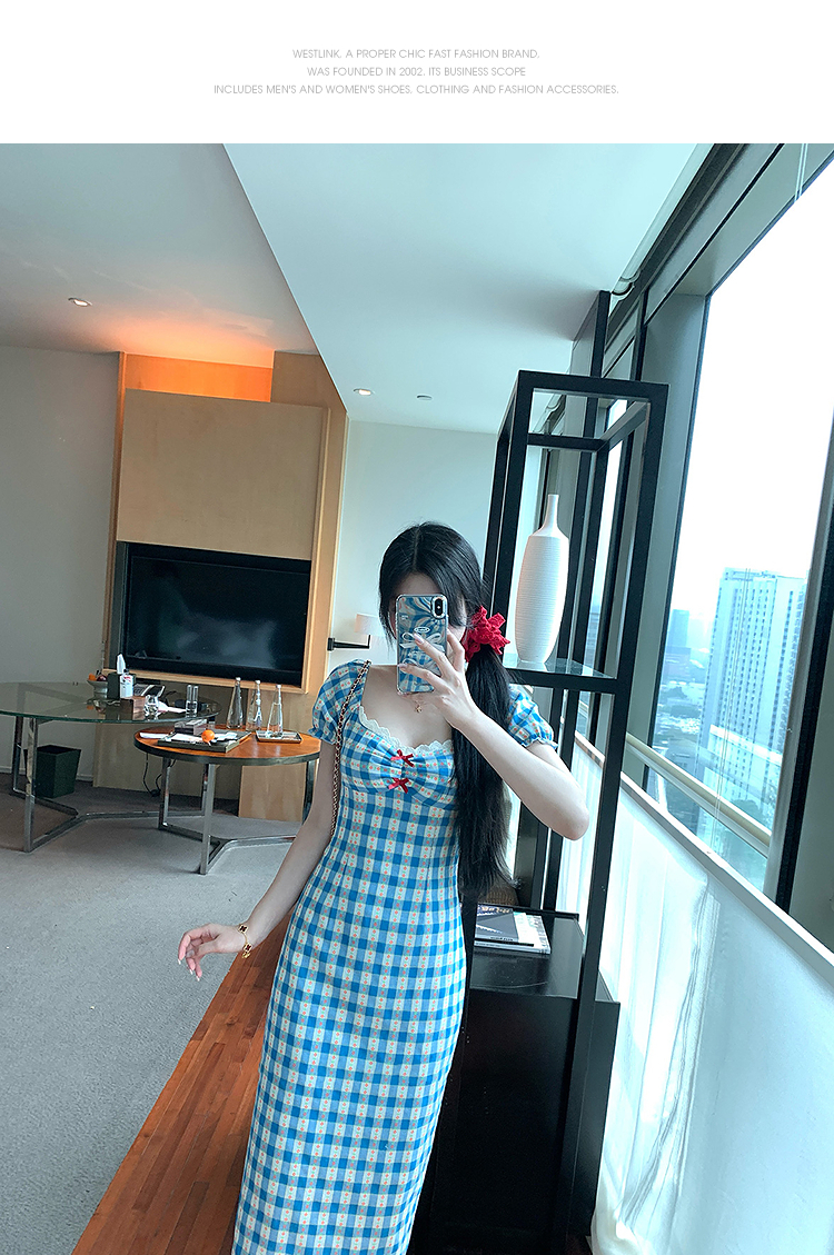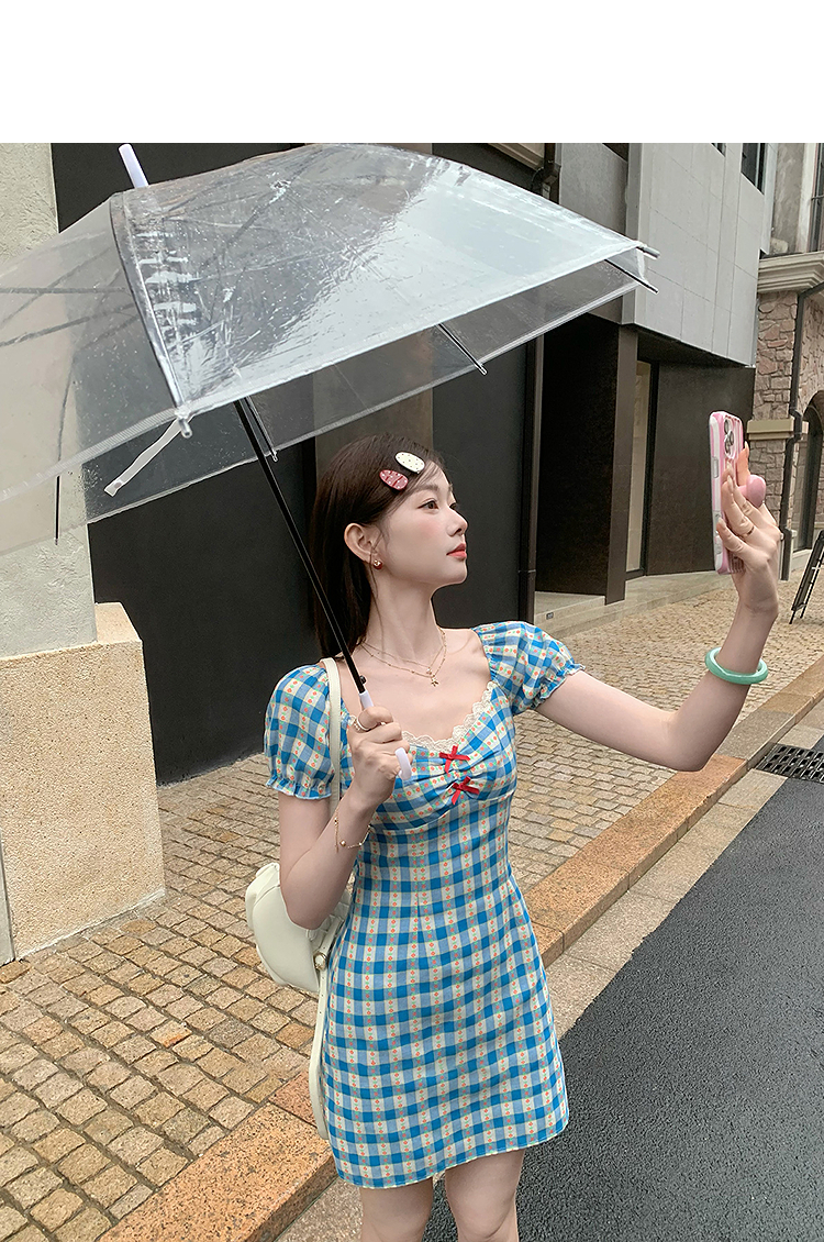 西遇格子泡泡袖连衣裙女夏季新款蝴蝶结蕾丝拼接法式收腰裙子SS050828/SS050829