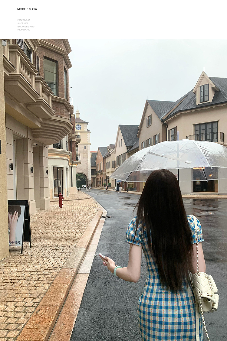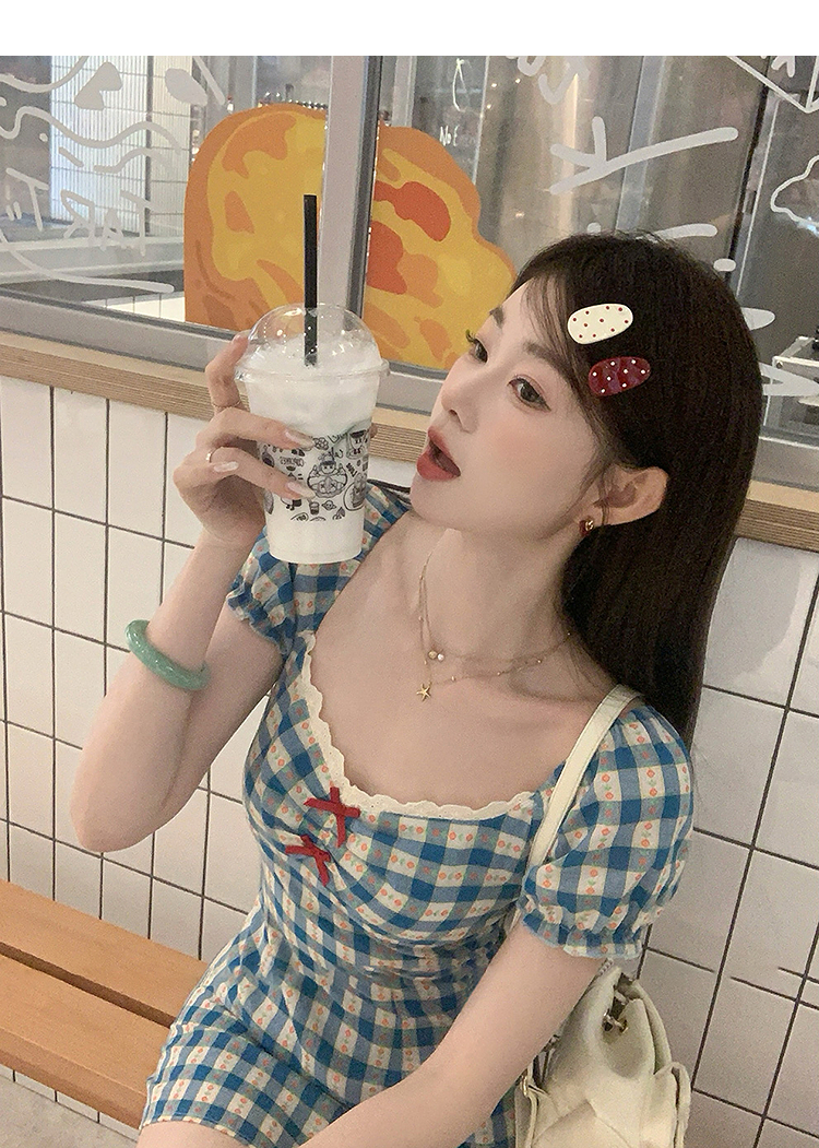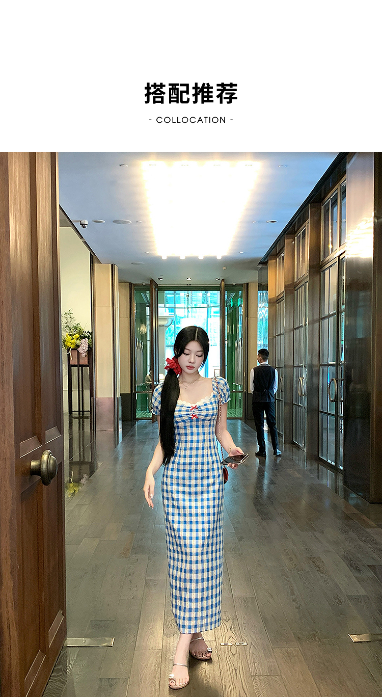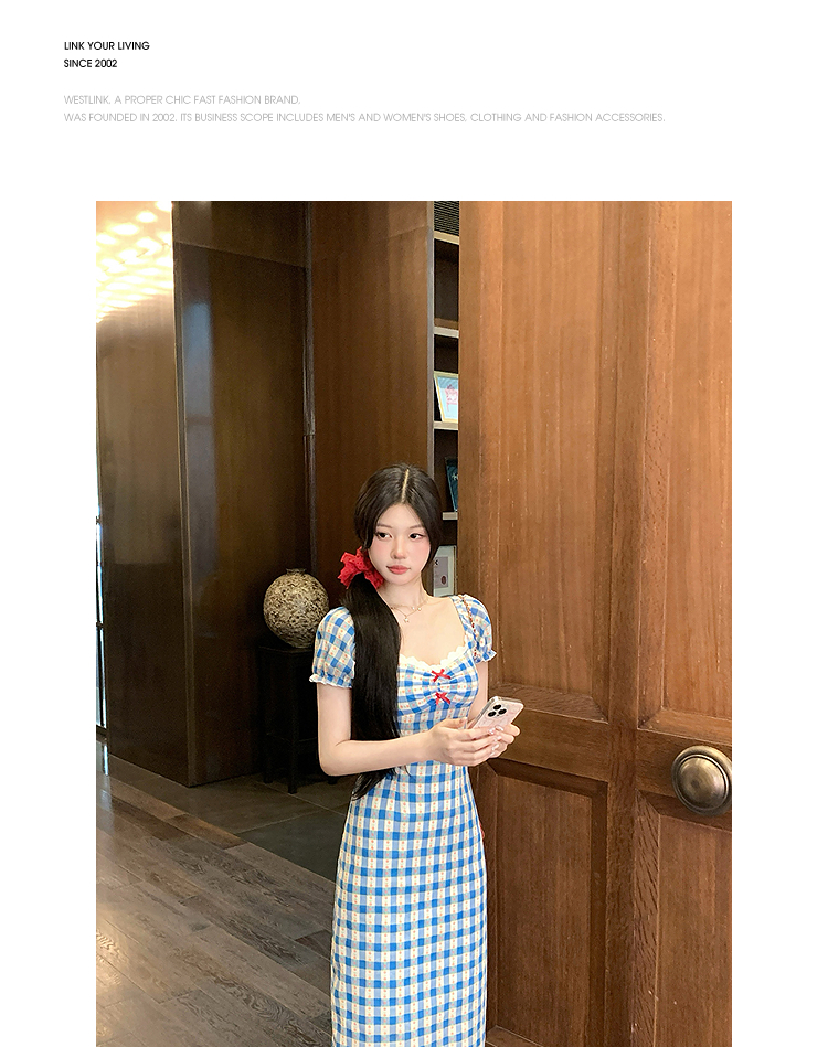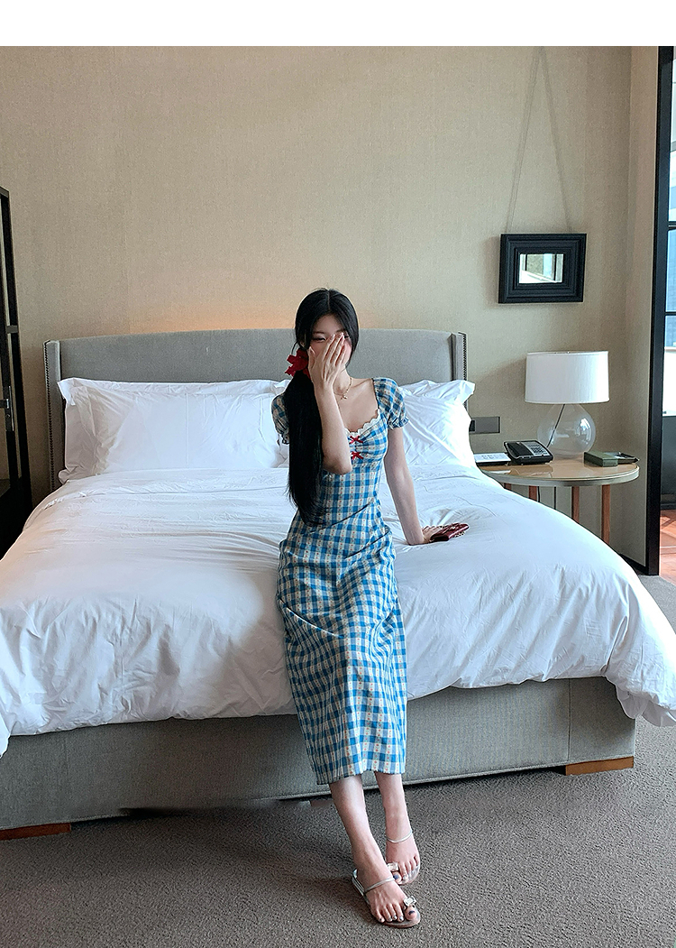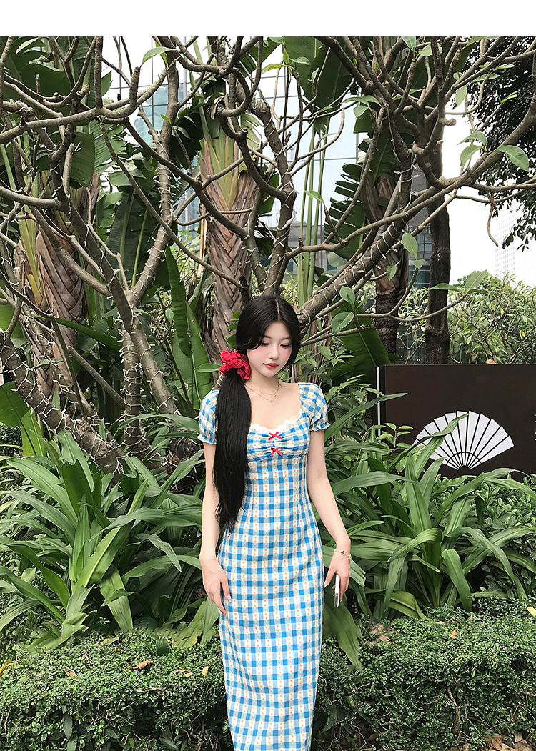 西遇格子泡泡袖连衣裙女夏季新款蝴蝶结蕾丝拼接法式收腰裙子SS050828/SS050829