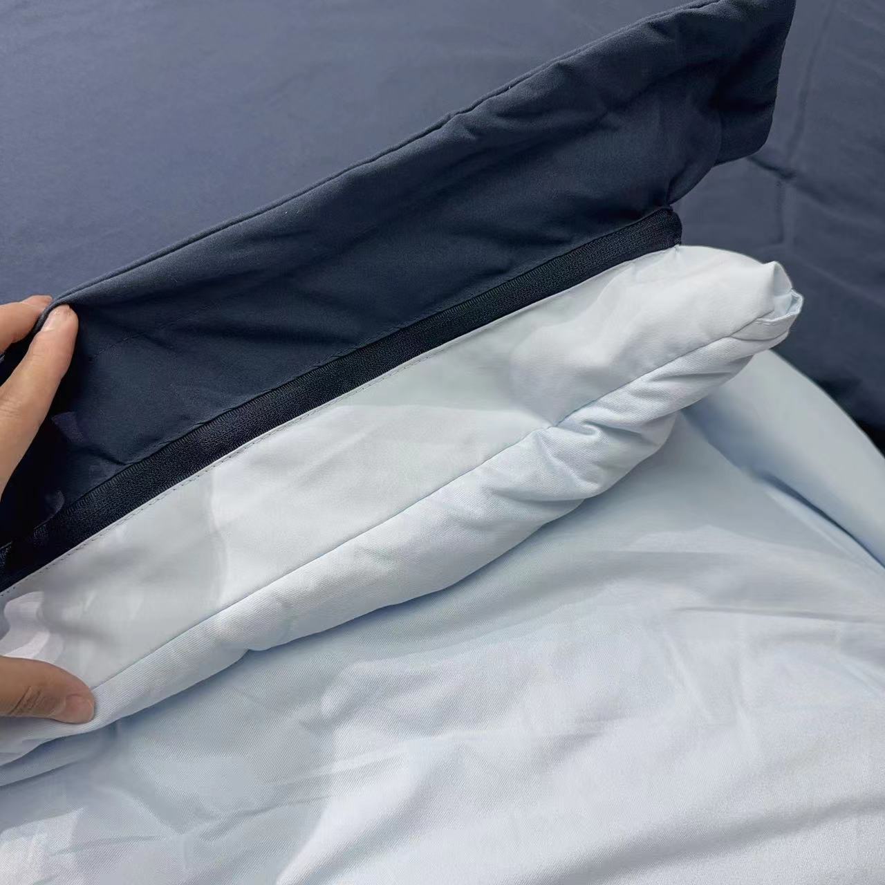 蓝色调的的被子,一半深蓝、一半浅蓝,让深处喧嚣城市的你进入平静。