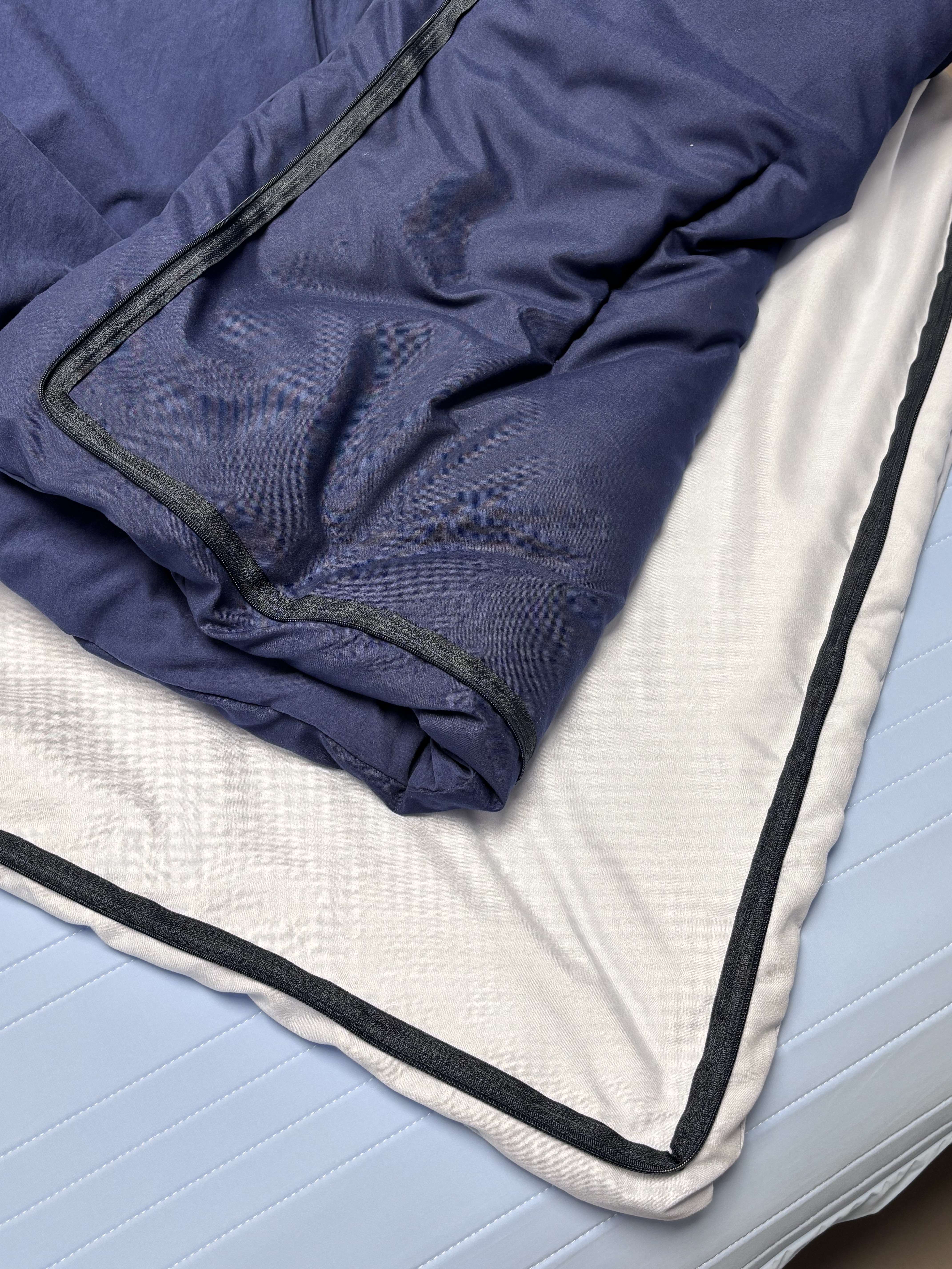 两床不同厚薄的被子,通过拉链可随意组合或拆解,来适应于不同温度的天气。