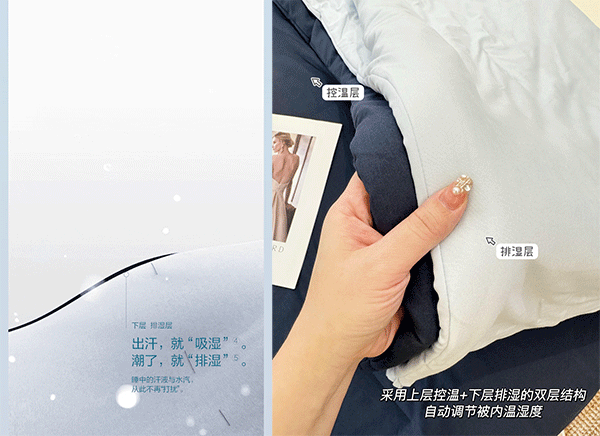 上层是蓄热层采用BalmyLayer™️调温絮片:冷了就“蓄热”,闷了就“散热”,温度与身体就像惺惺相惜的恋人,相当合拍。