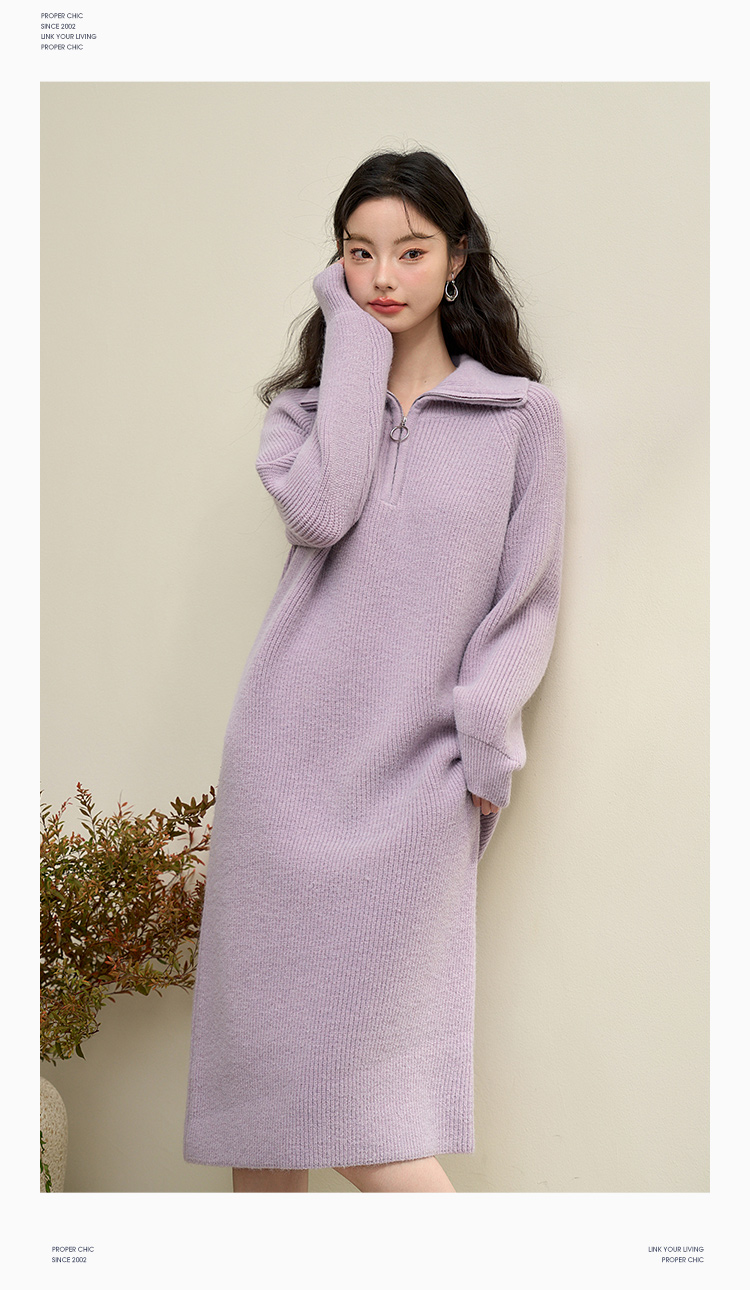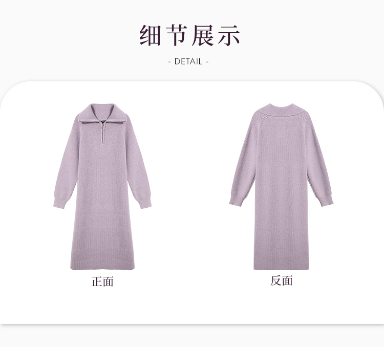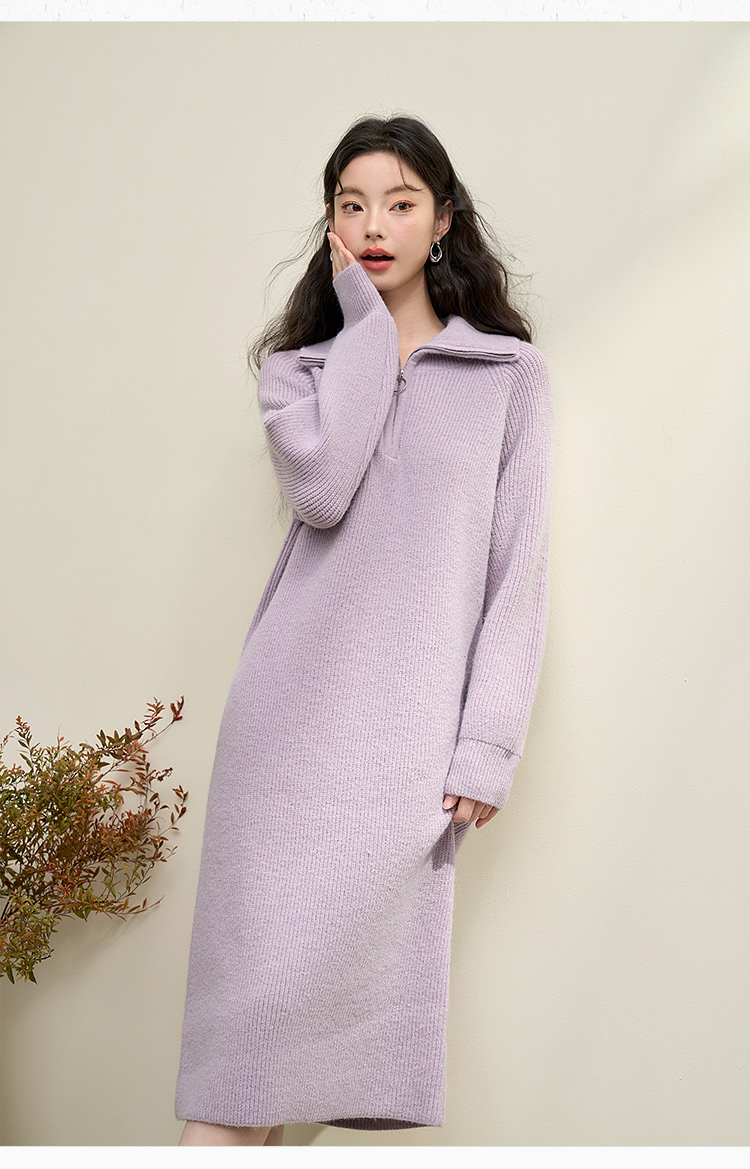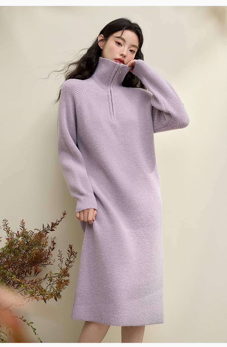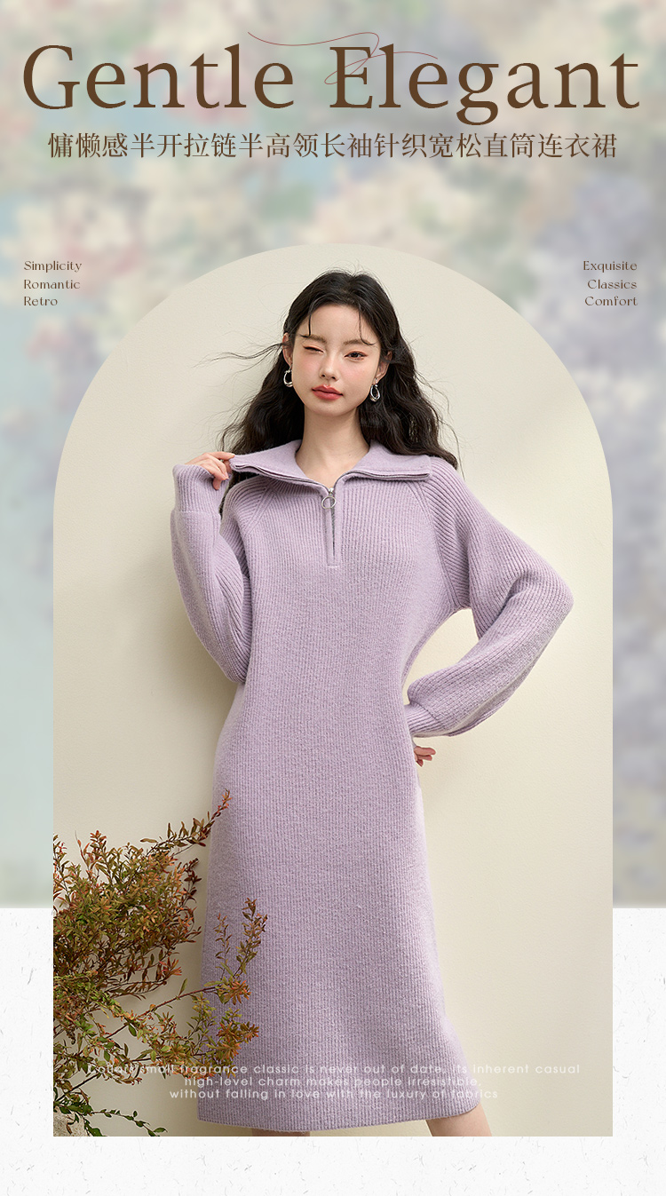 慵懒感半开拉链半高领长袖连衣裙女秋季宽松直筒针织裙V4242911