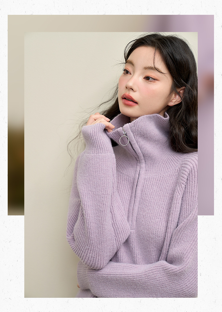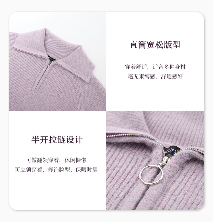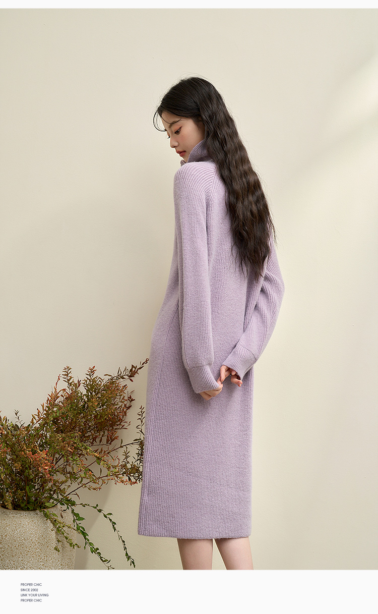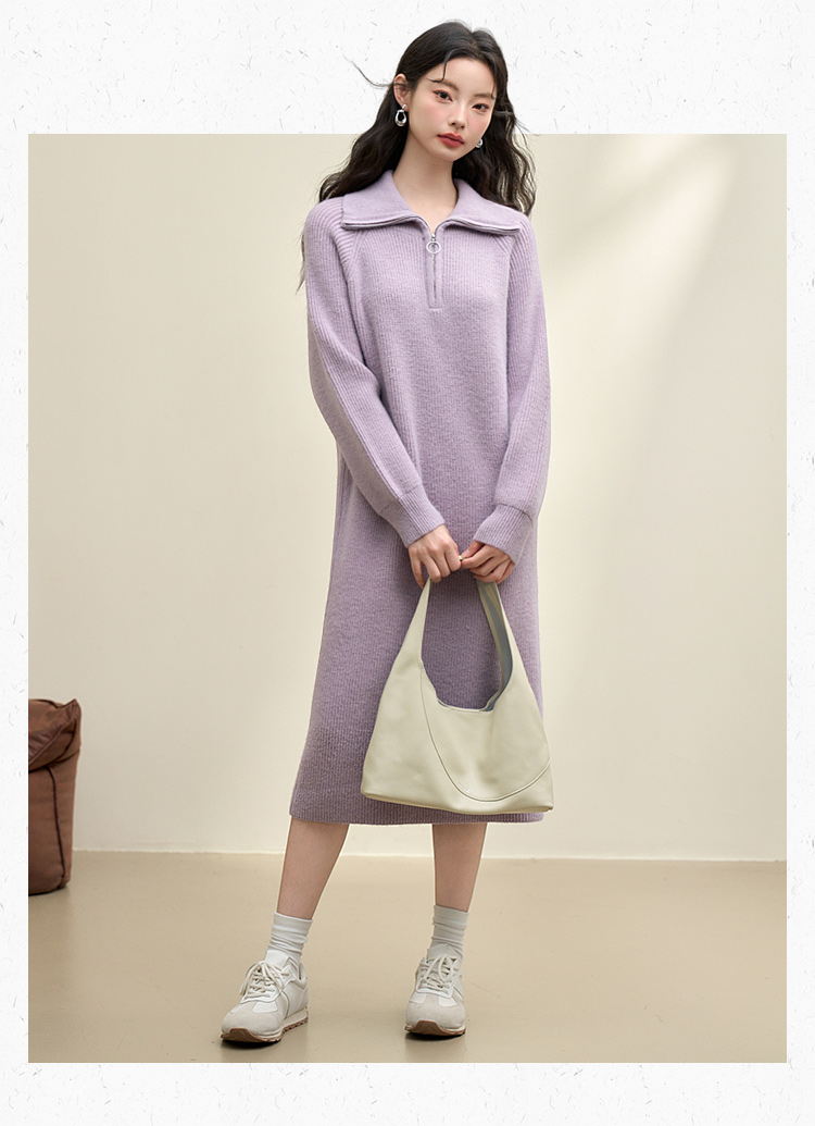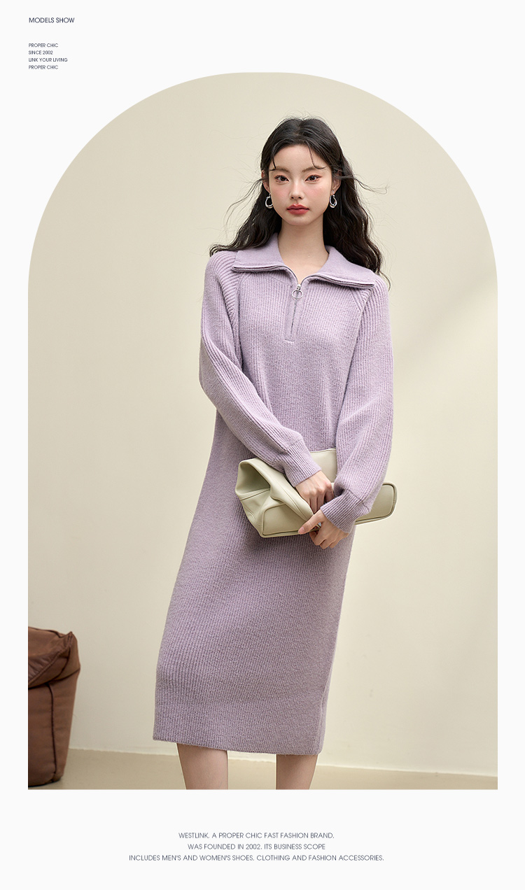 慵懒感半开拉链半高领长袖连衣裙女秋季宽松直筒针织裙V4242911