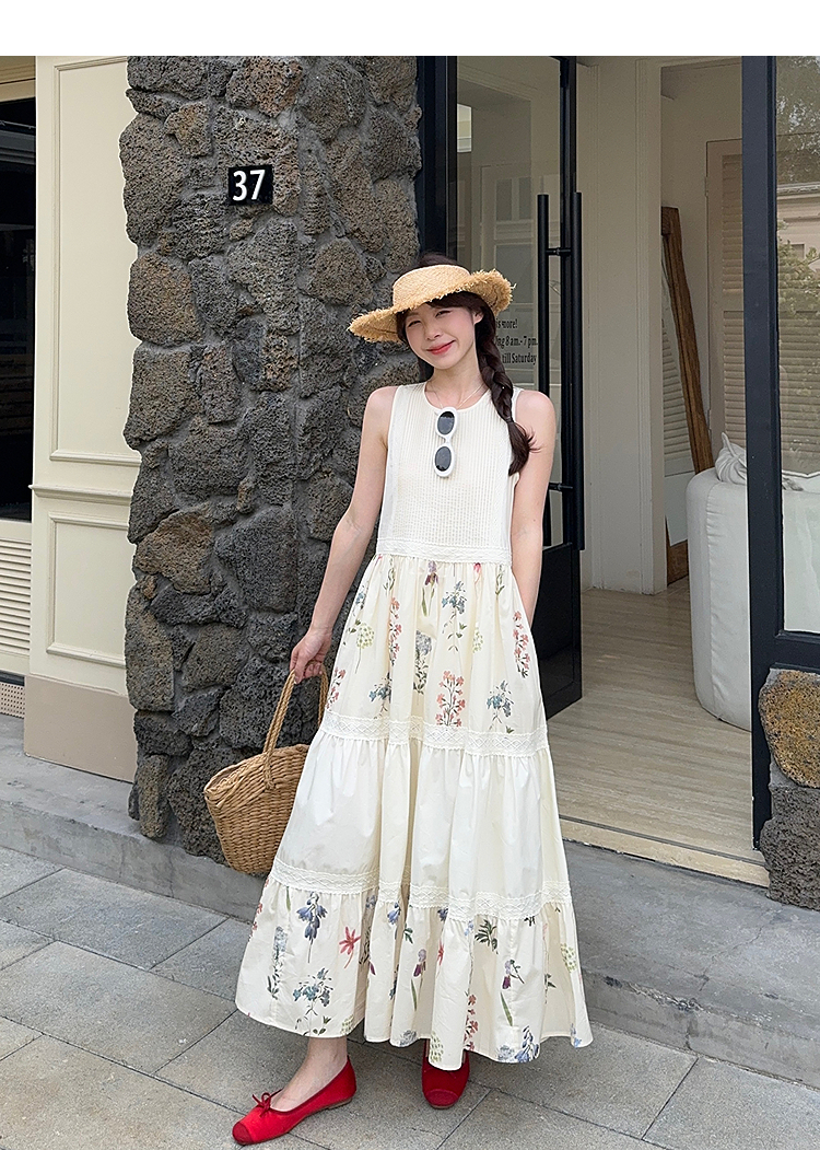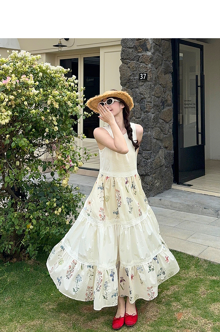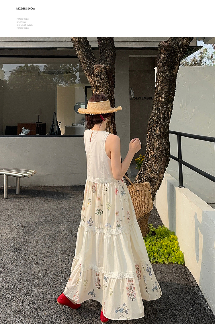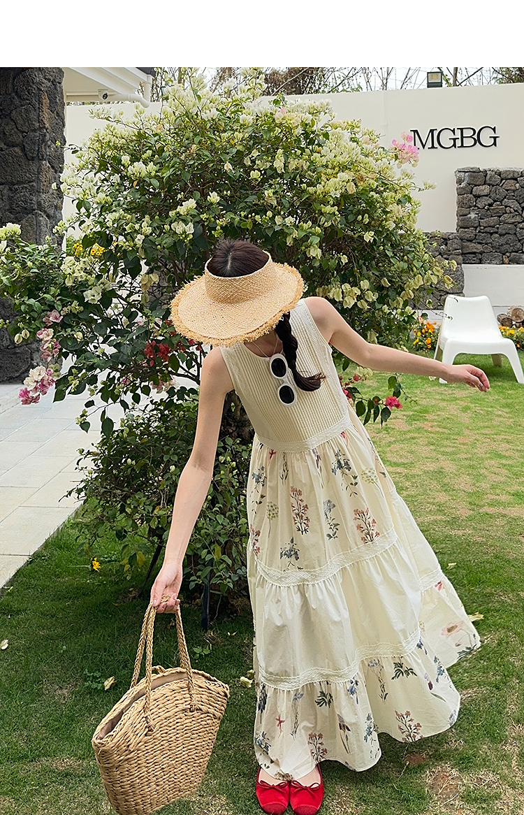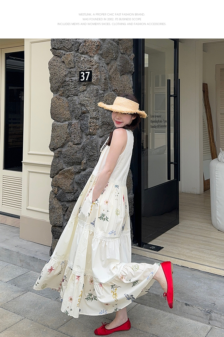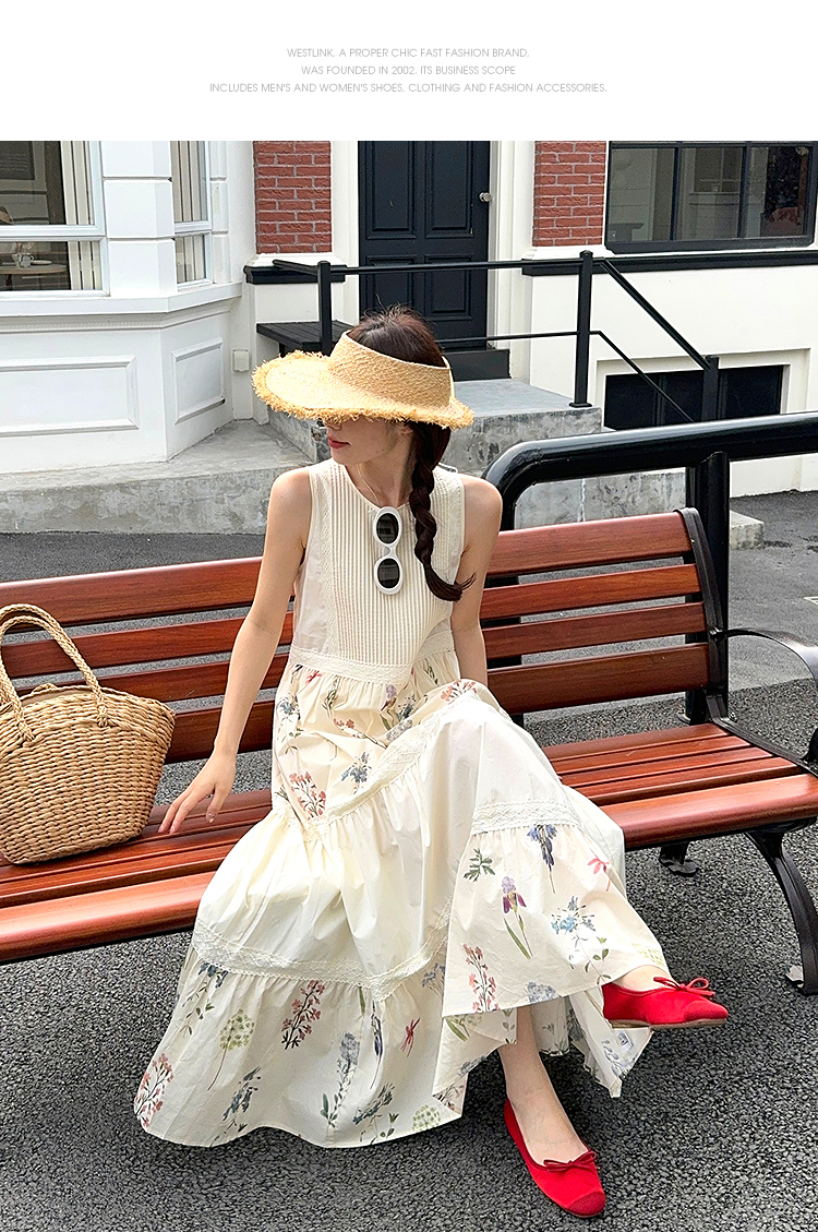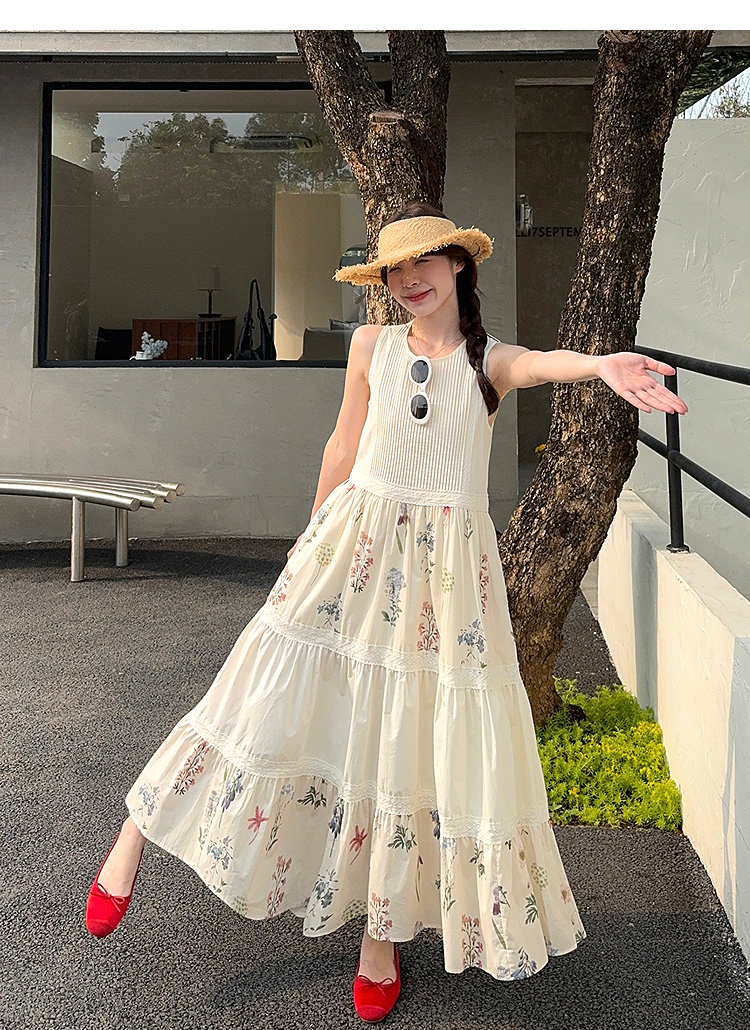 西遇拼接背心连衣裙女2025年夏季新款a字蕾丝蛋糕裙法式无袖长裙SS050502