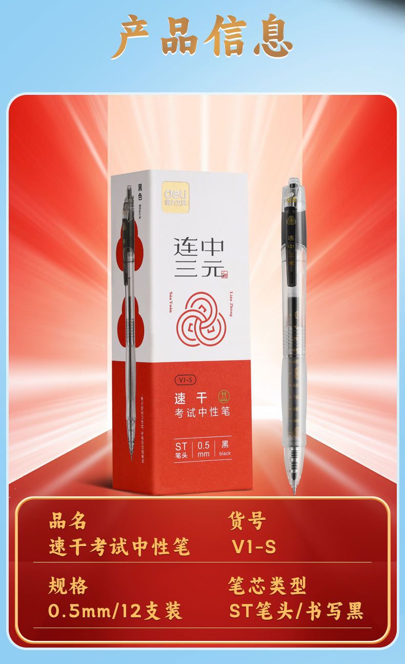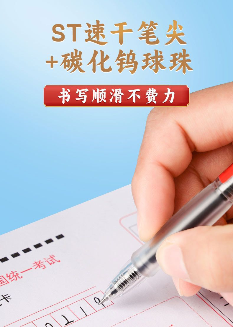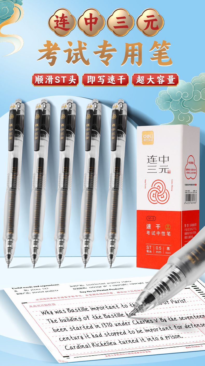 得力按动中性笔 连中三元 学生考试专用st笔头 速干 顺滑 耐用碳素黑笔