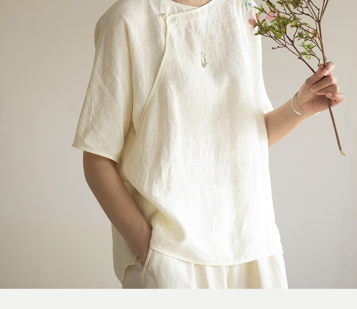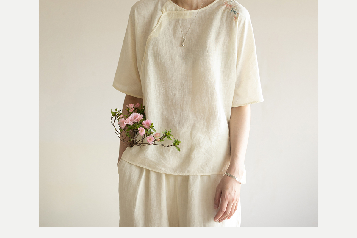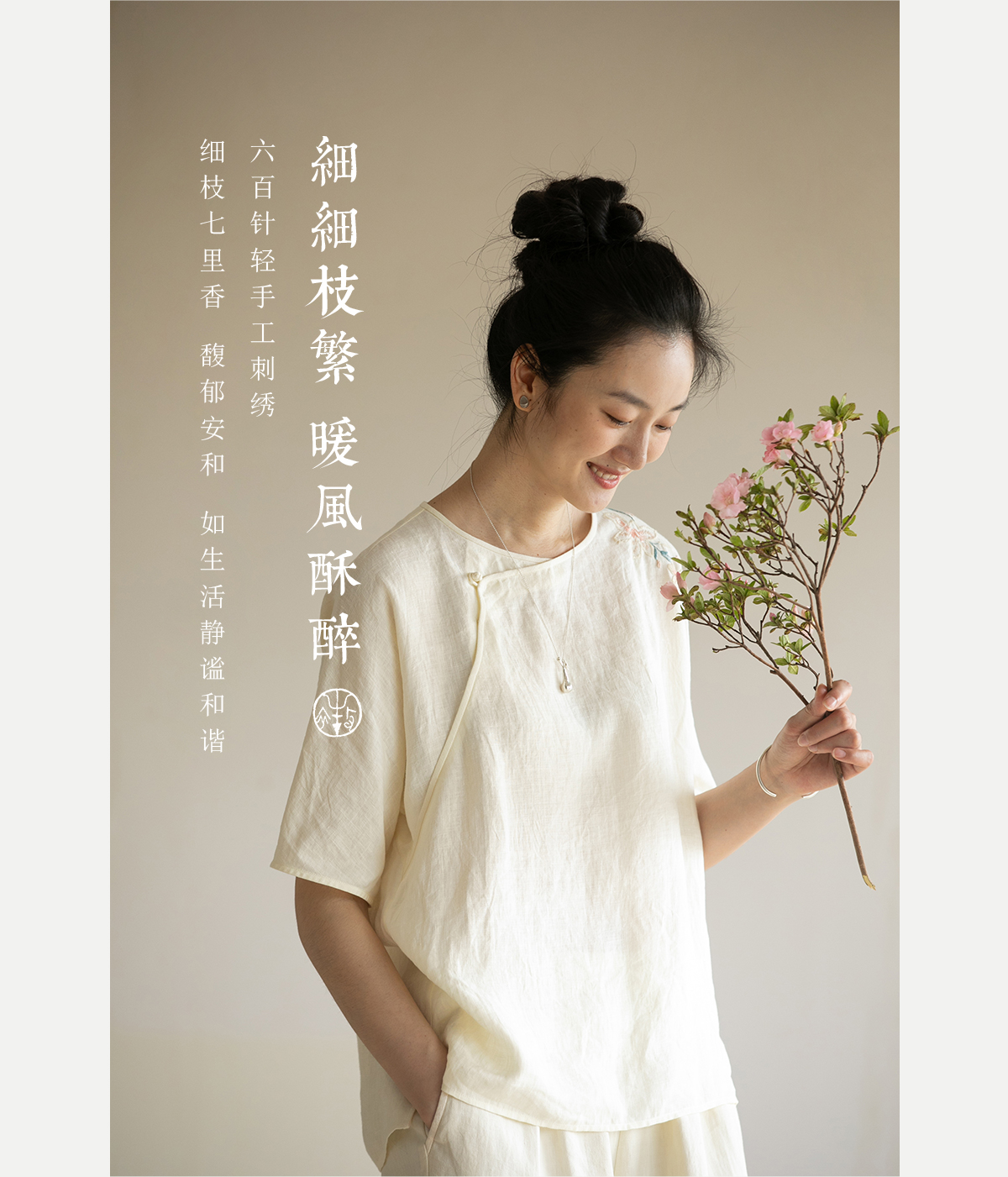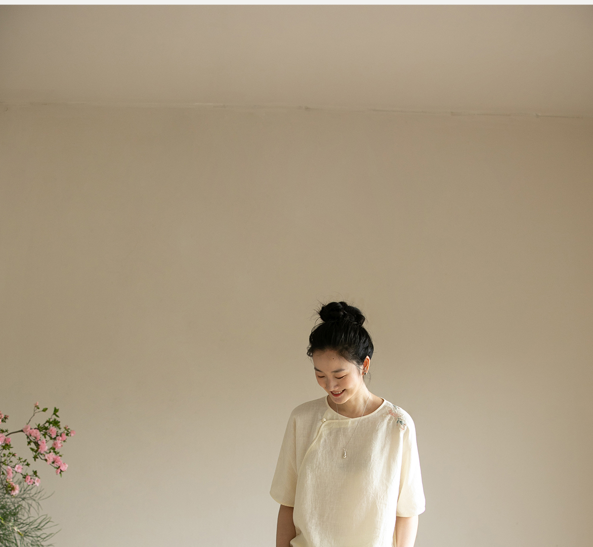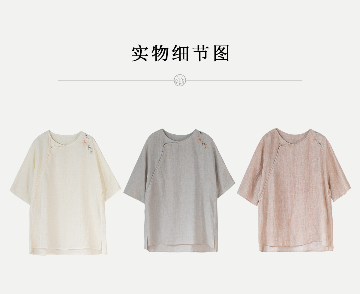 牧衣游原创 手工刺绣汉麻套头衫轻薄清凉禅意复古短袖上衣 撷芳归