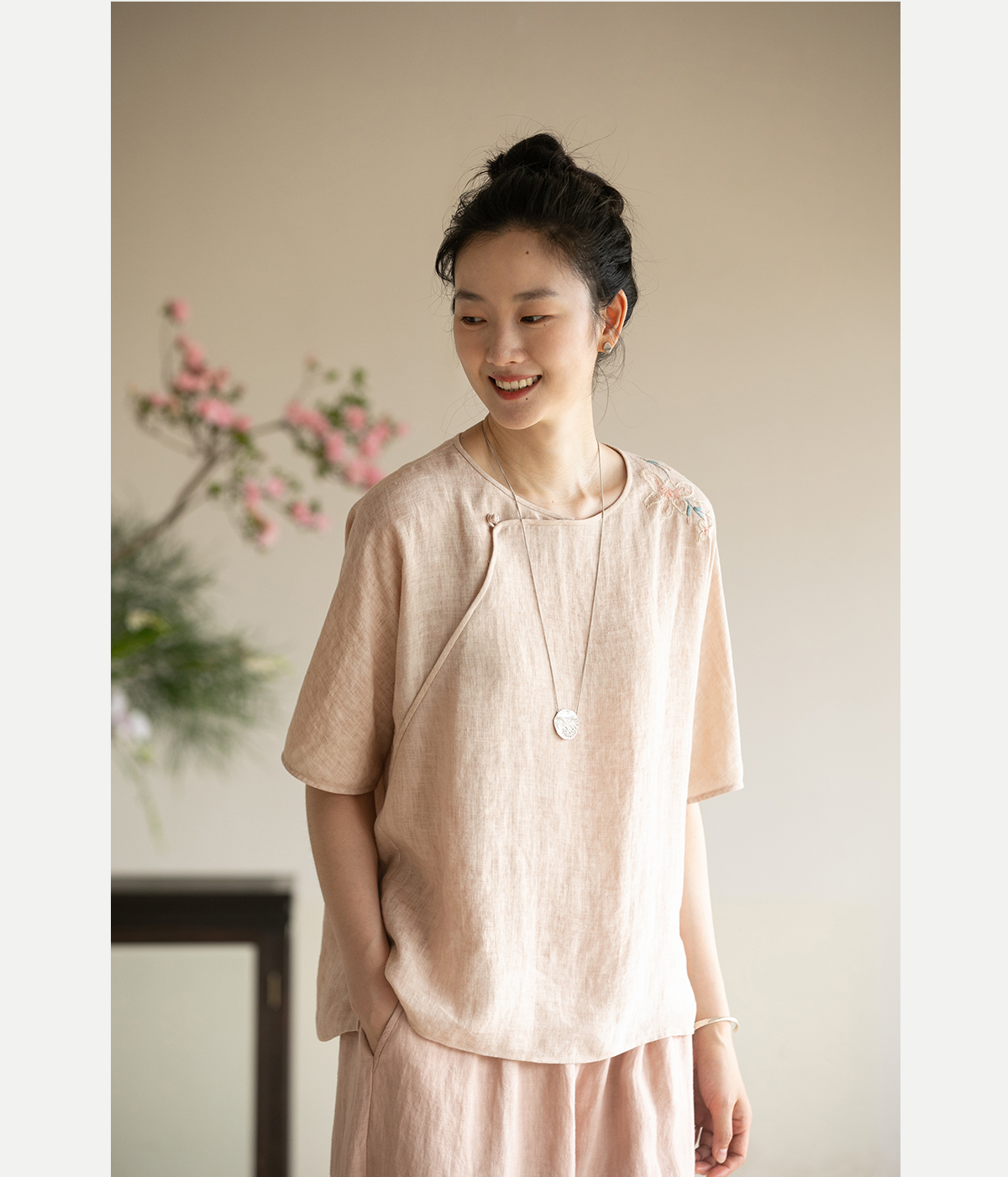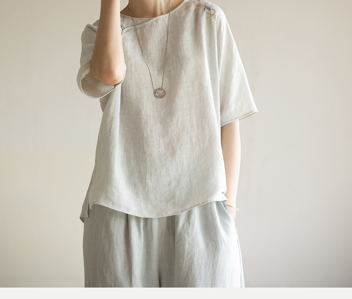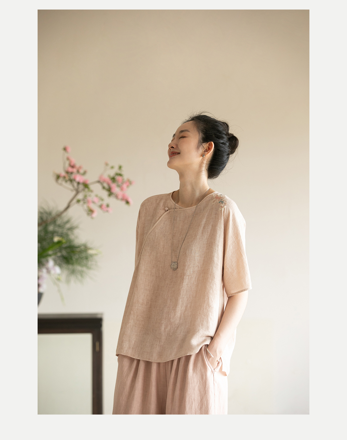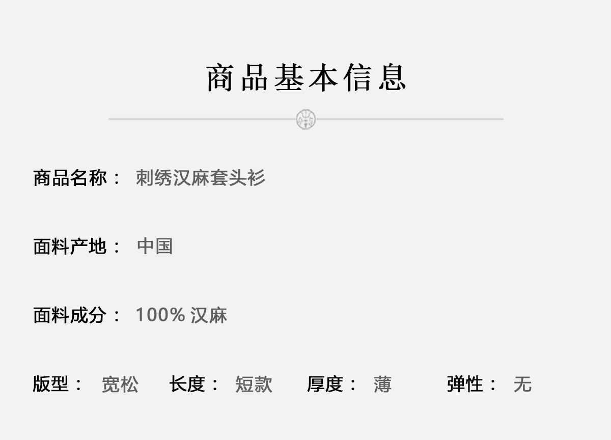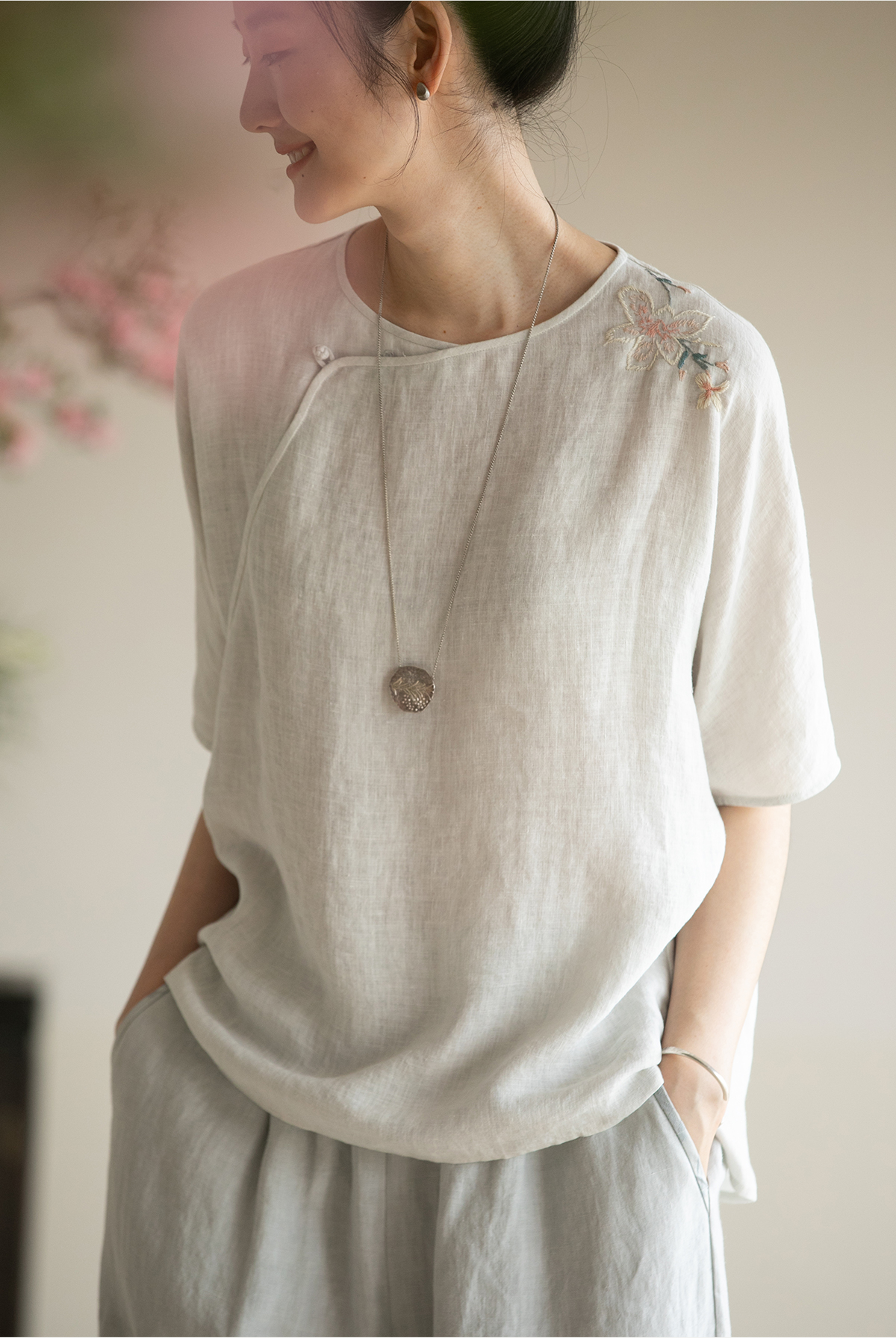 牧衣游原创 手工刺绣汉麻套头衫轻薄清凉禅意复古短袖上衣 撷芳归