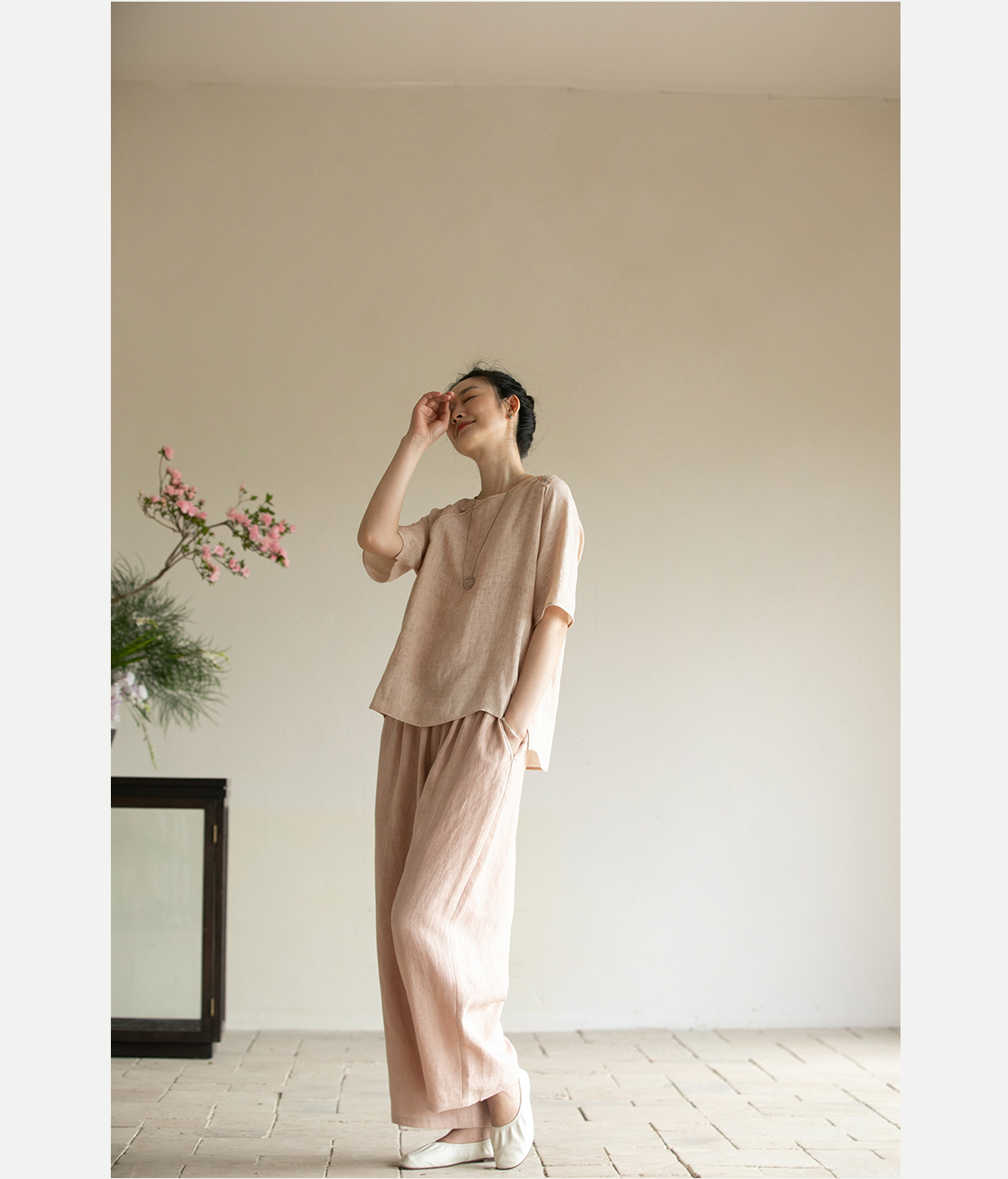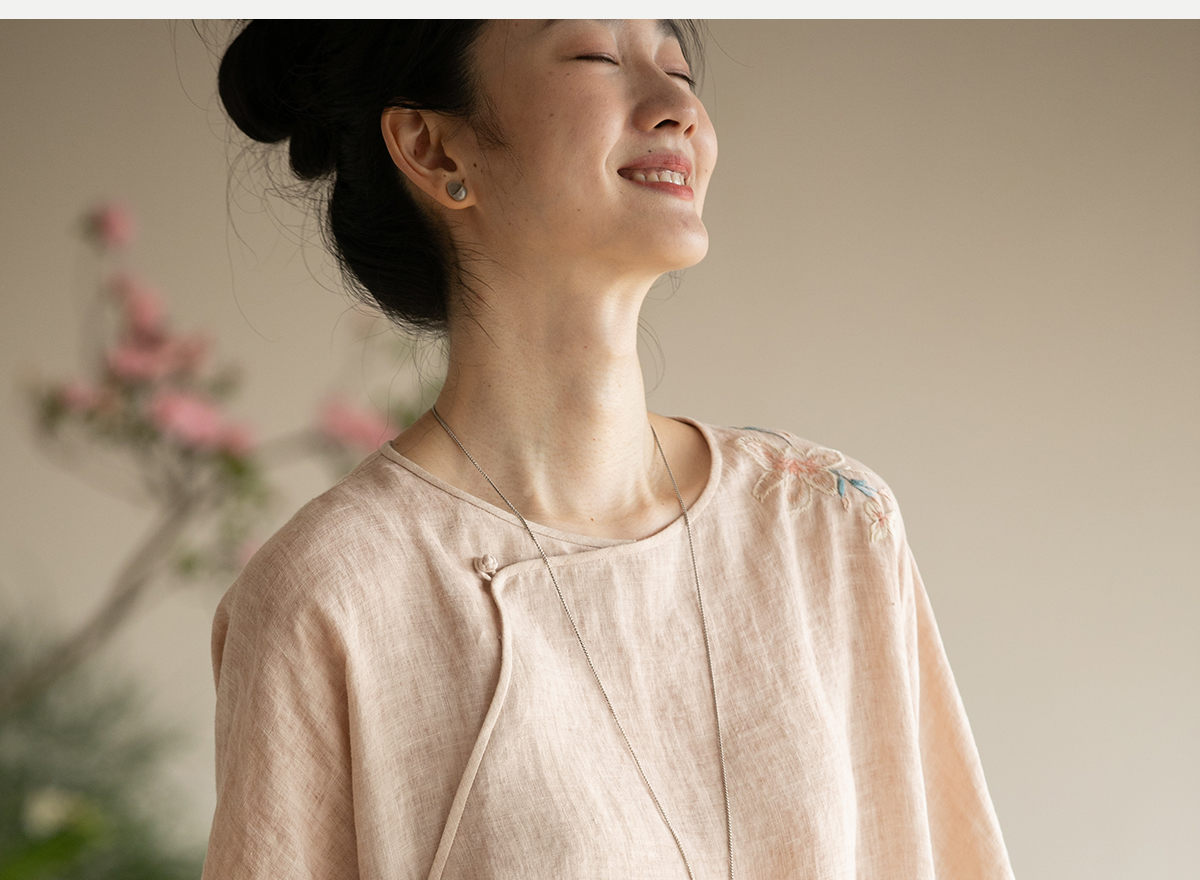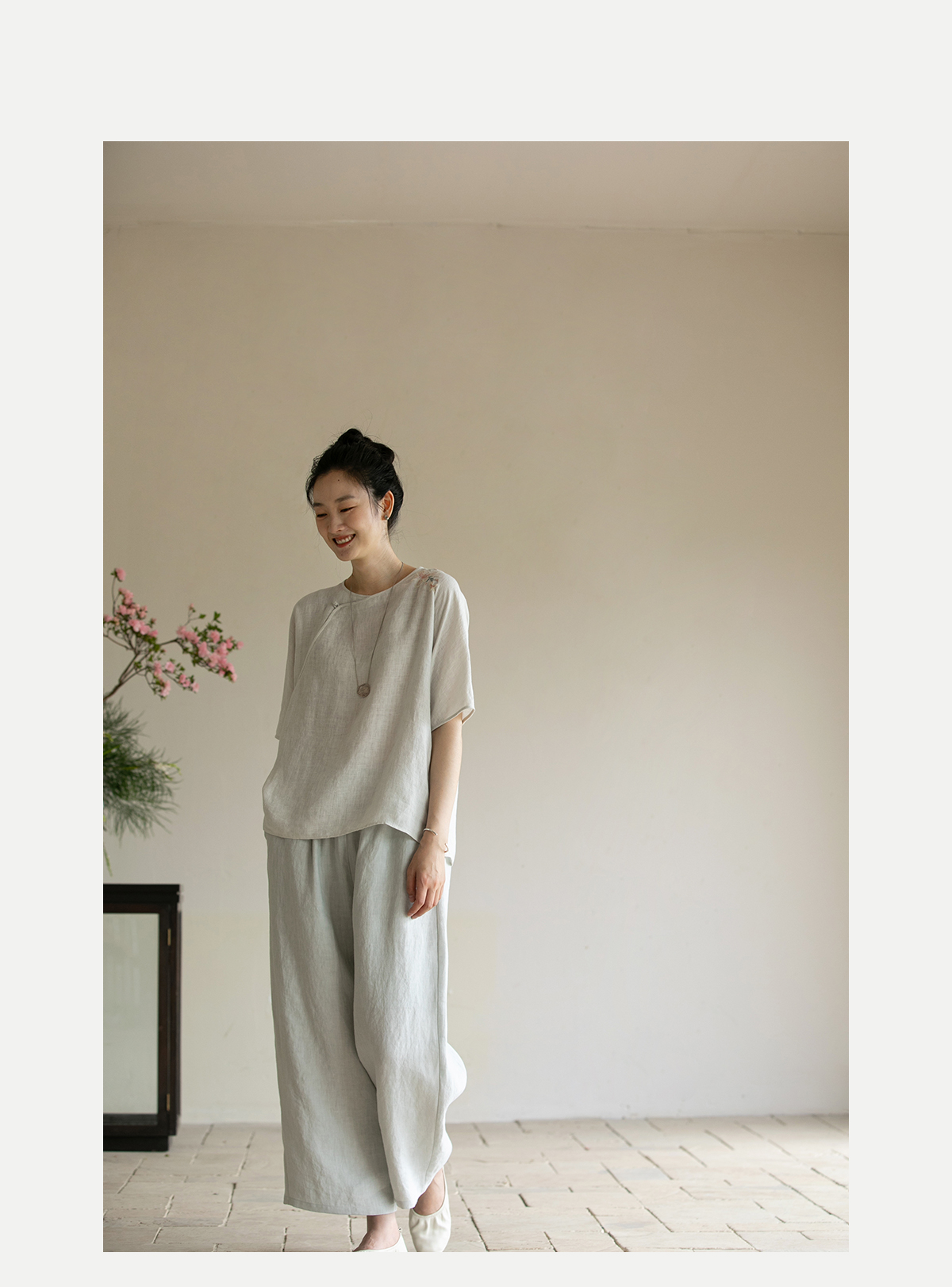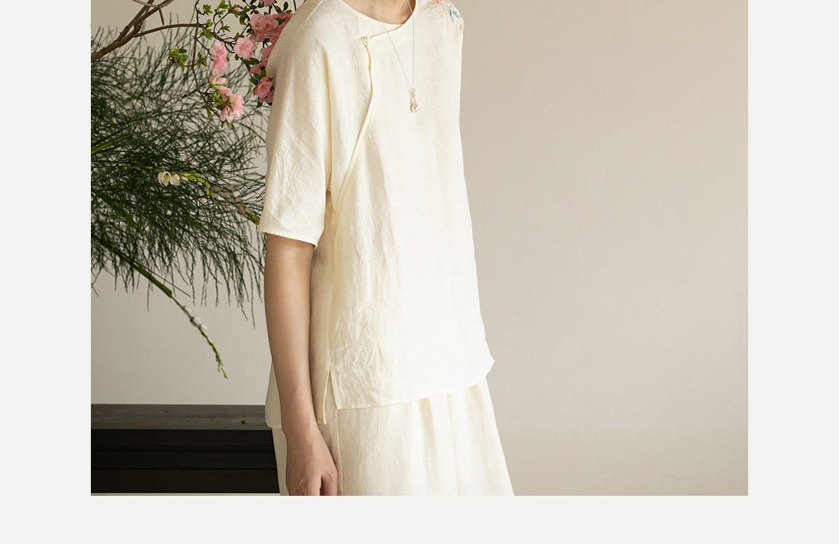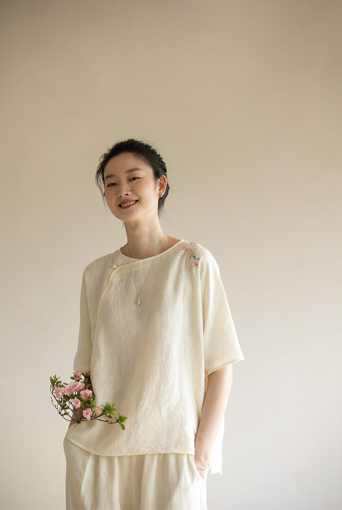 牧衣游原创 手工刺绣汉麻套头衫轻薄清凉禅意复古短袖上衣 撷芳归
