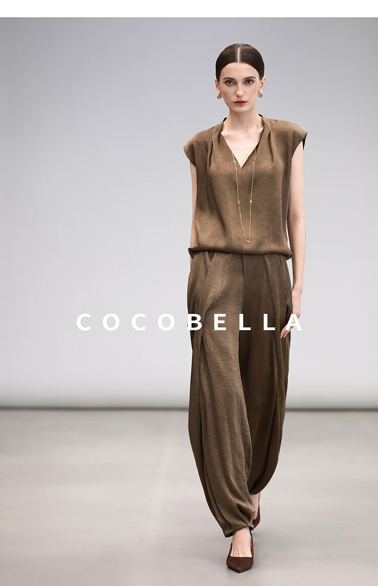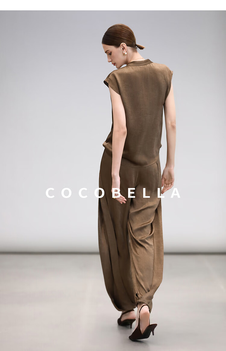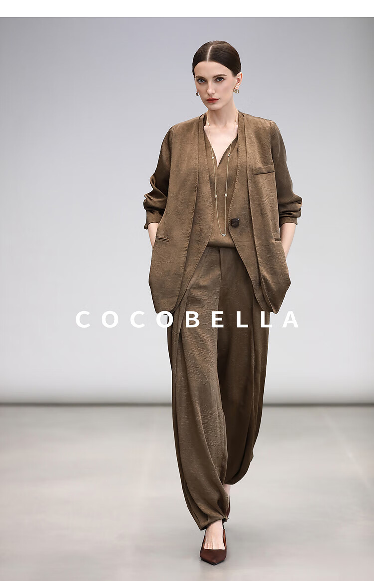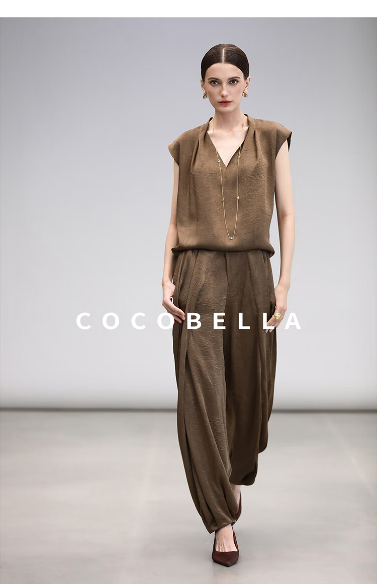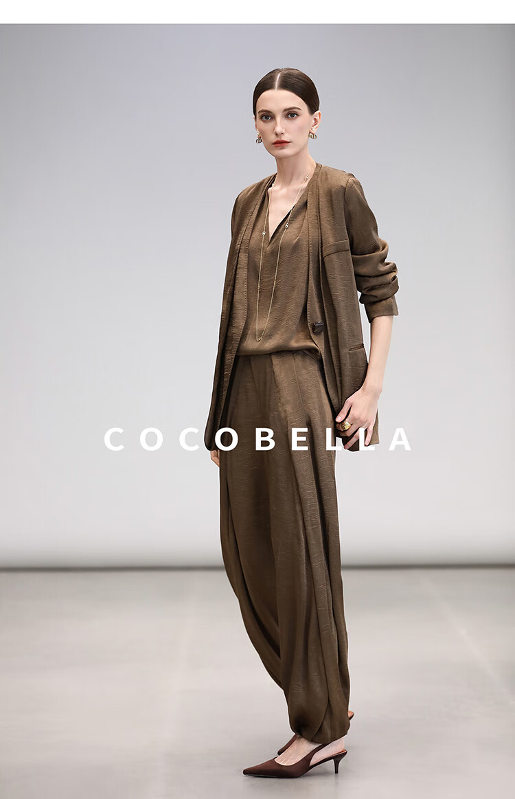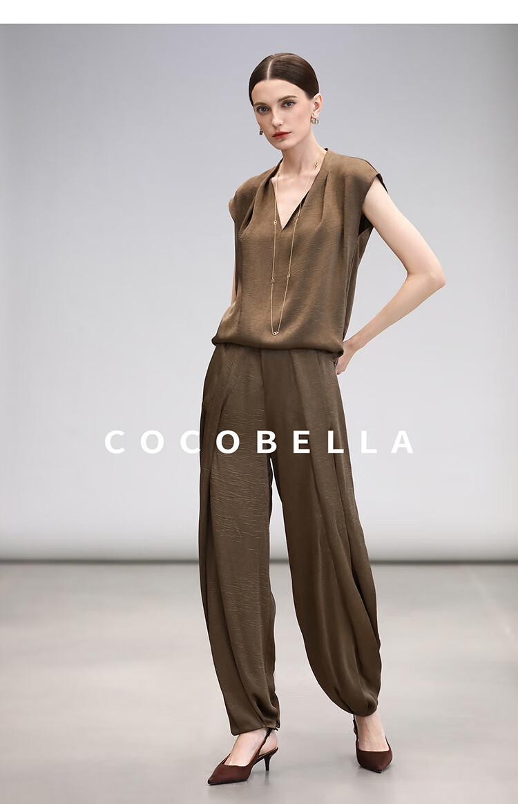 COCOBELLA奢感通勤商务肌理缎面休闲裤春夏高腰打褶灯笼裤PA3011