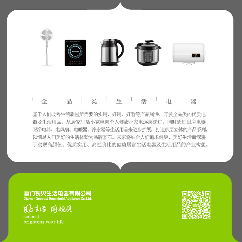 厦门视贝科技有限公司是集产品自主设计,研发,生产,销售于一体的高科技企业。拥有80000平方米的制造厂房,核心员工2000多人。产品线涵盖照明、电工,卫浴,线路,集成风暖等领域。