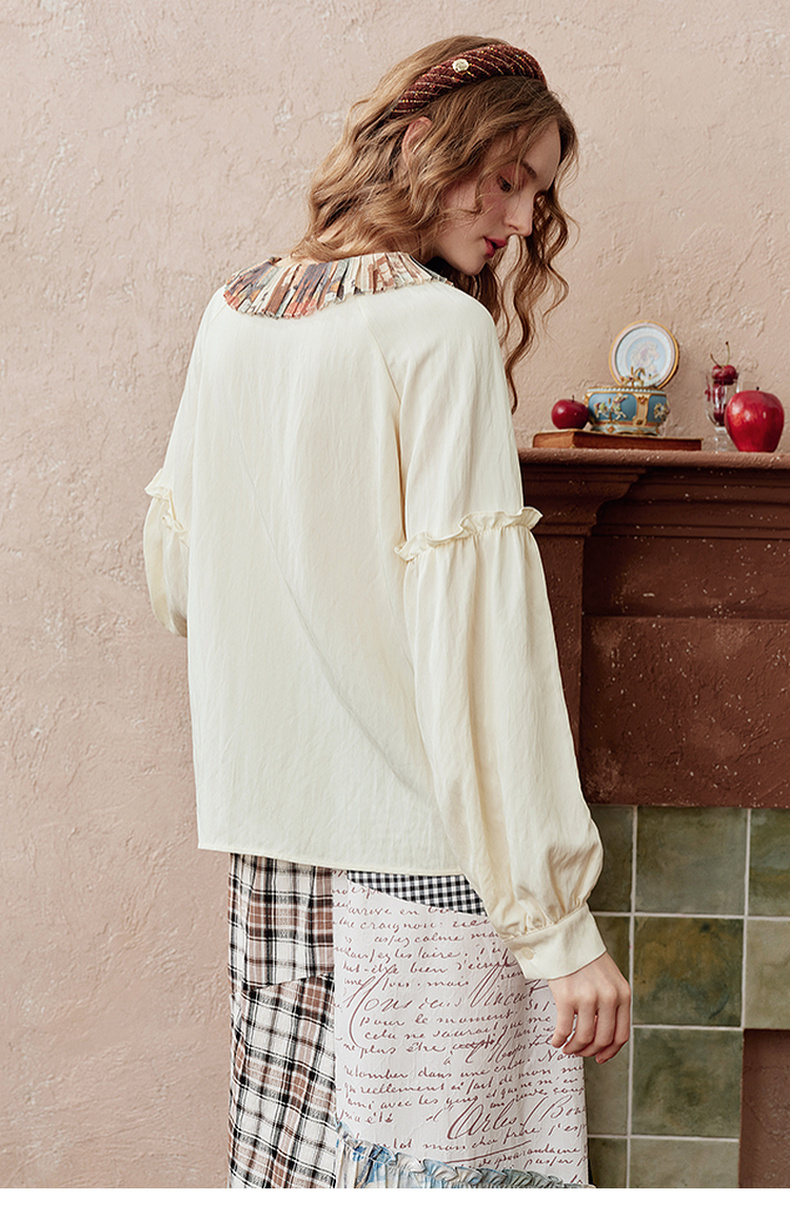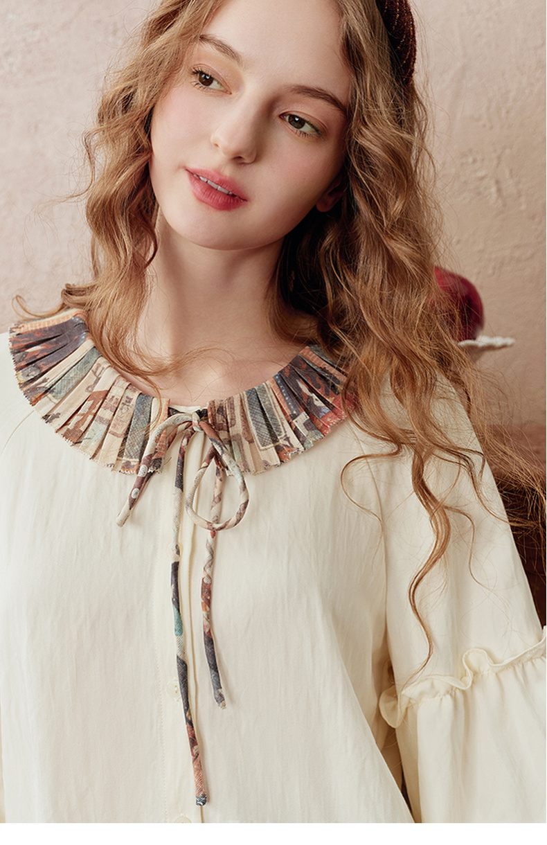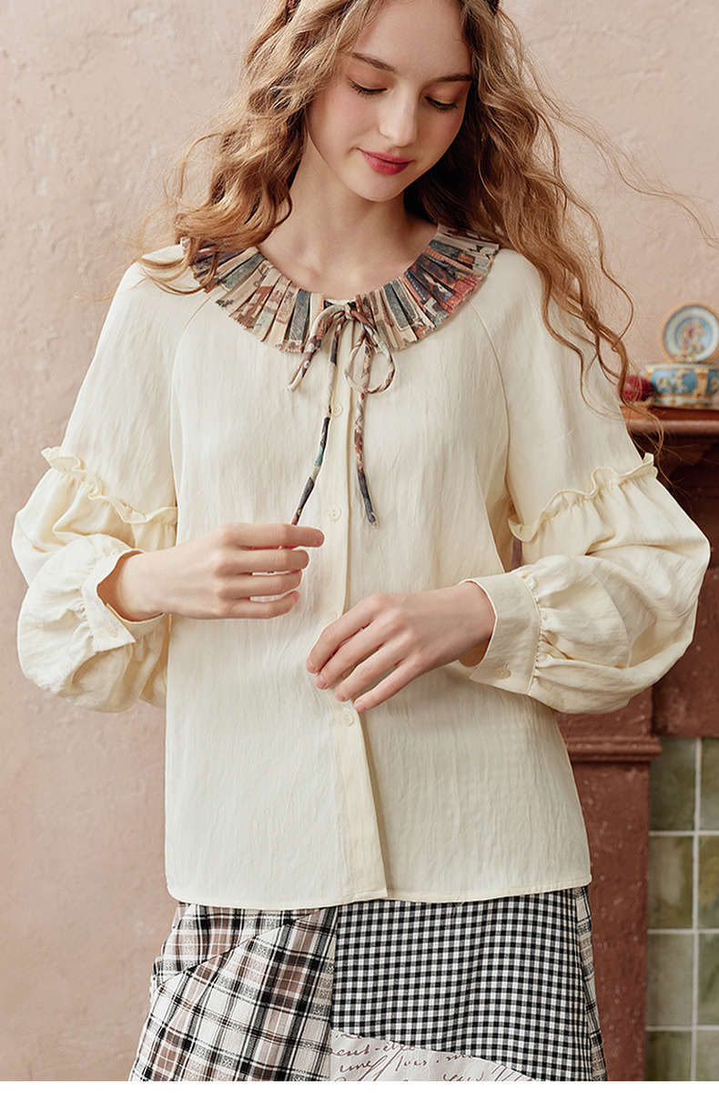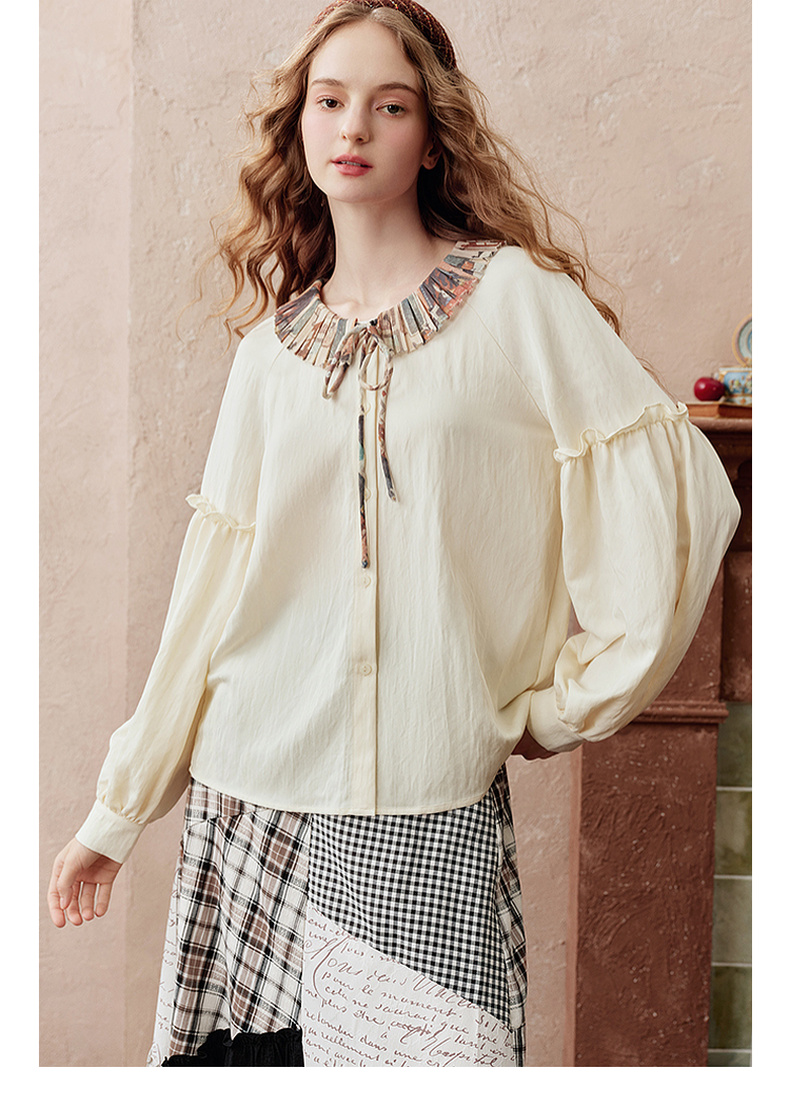 两三事 栗子蛋糕 2025秋季新款文艺风印花压褶领绑带灯笼袖衬衫女