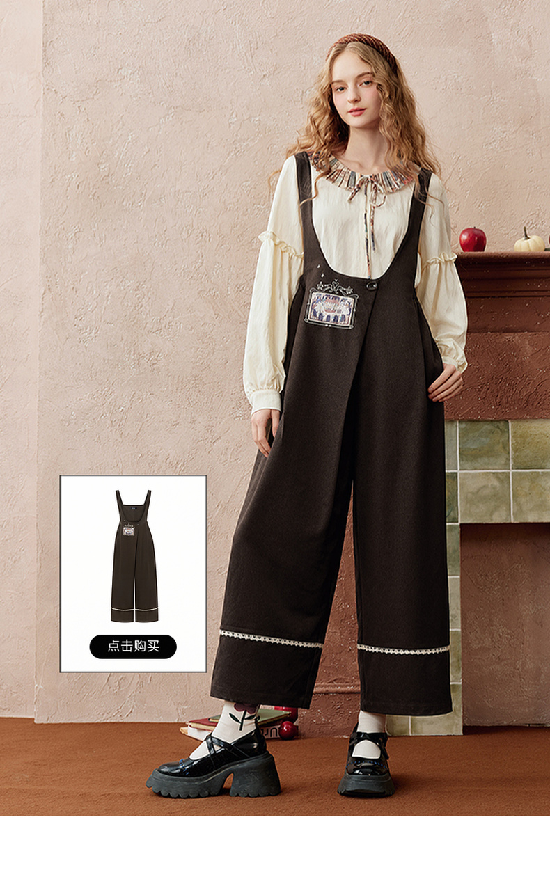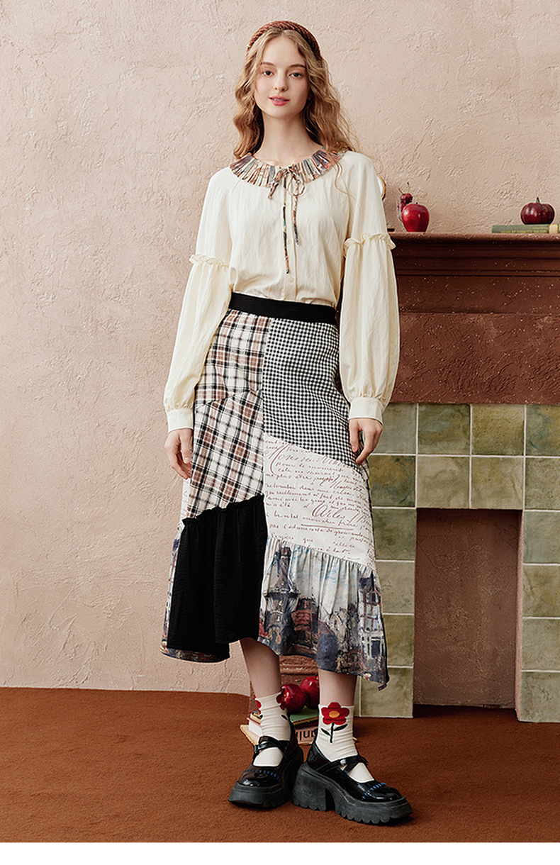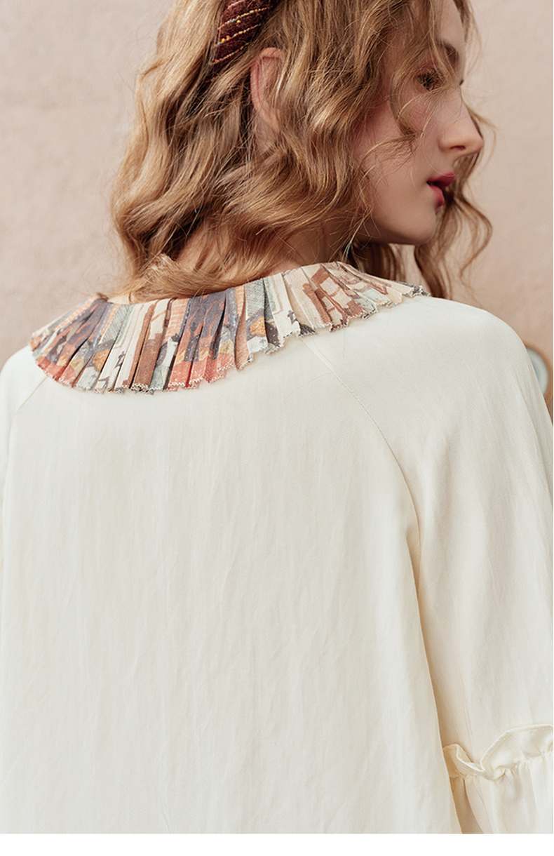 两三事 栗子蛋糕 2025秋季新款文艺风印花压褶领绑带灯笼袖衬衫女