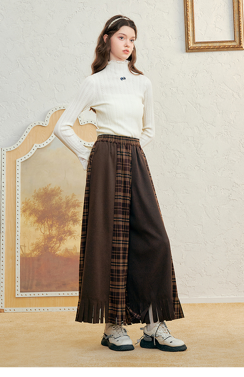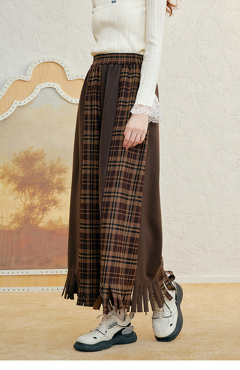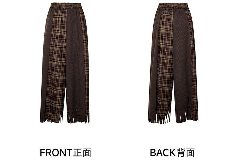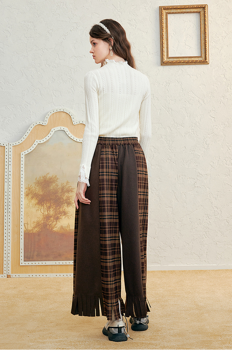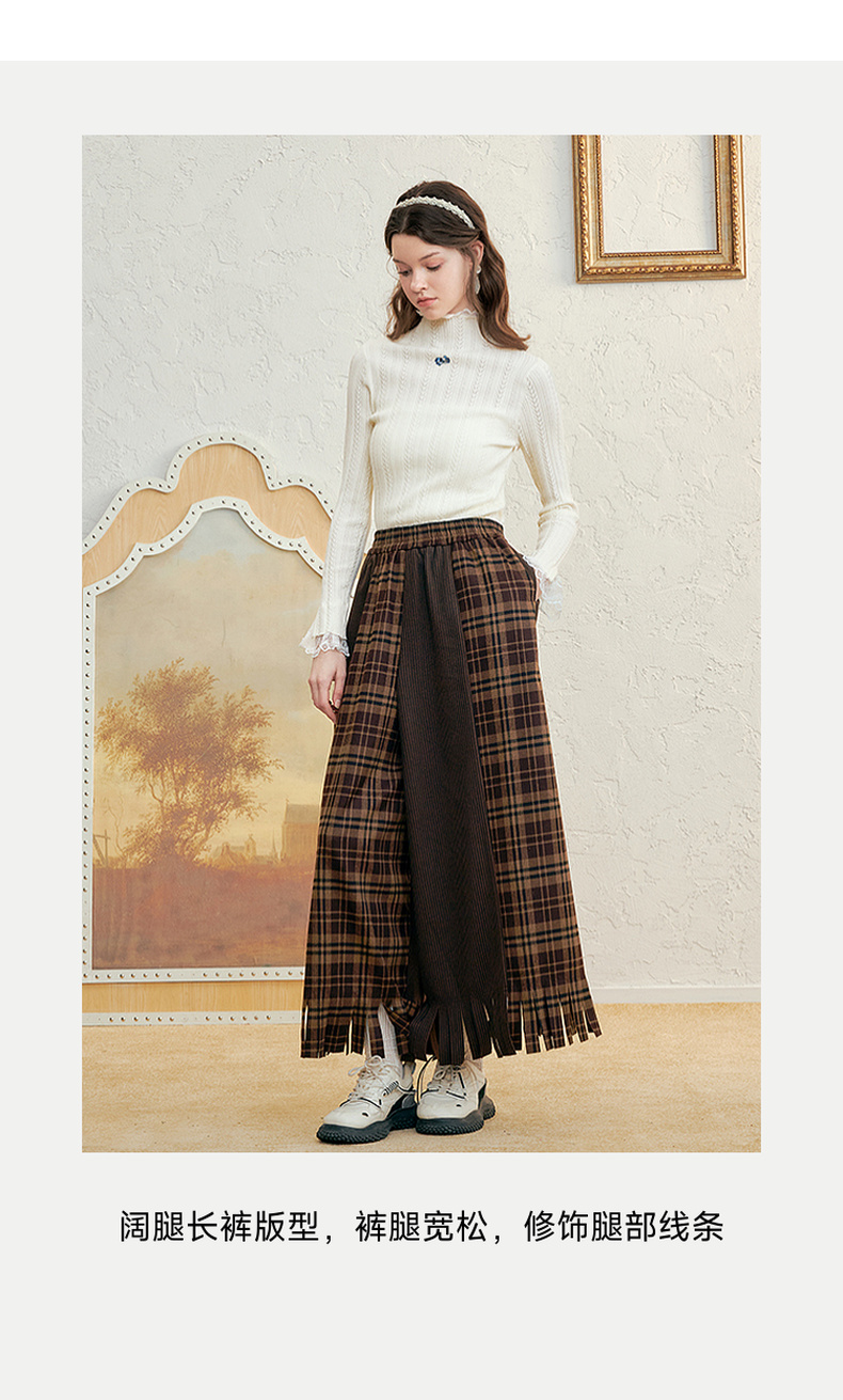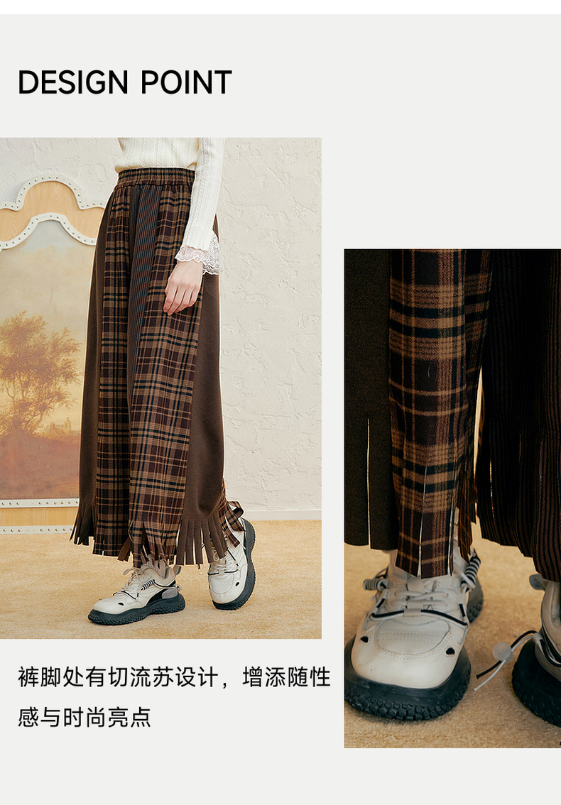 两三事格物求知2025春季新款时尚流苏裤脚口格子阔腿休闲裤女宽松
