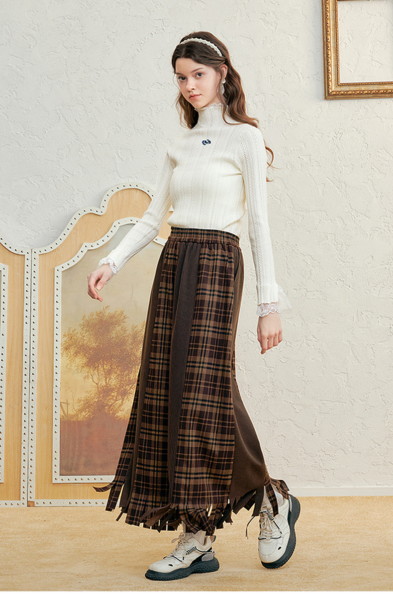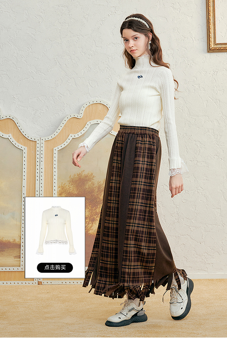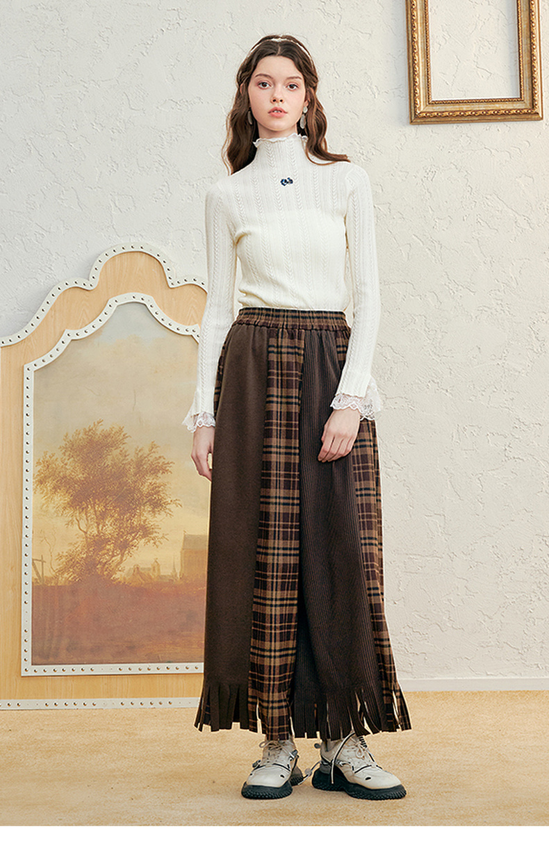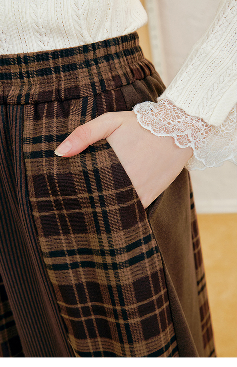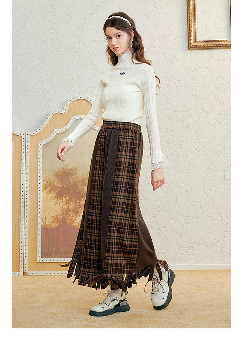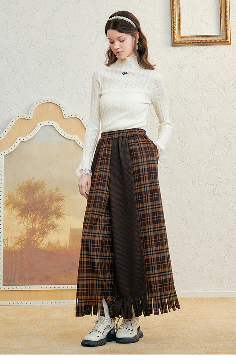 两三事格物求知2025春季新款时尚流苏裤脚口格子阔腿休闲裤女宽松