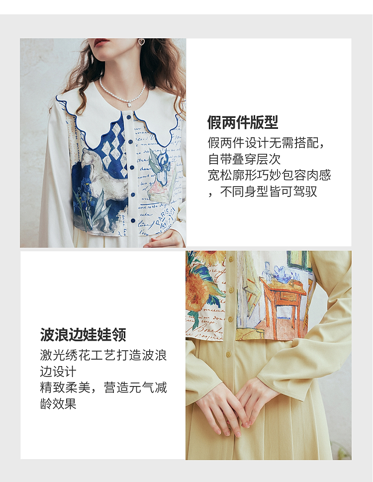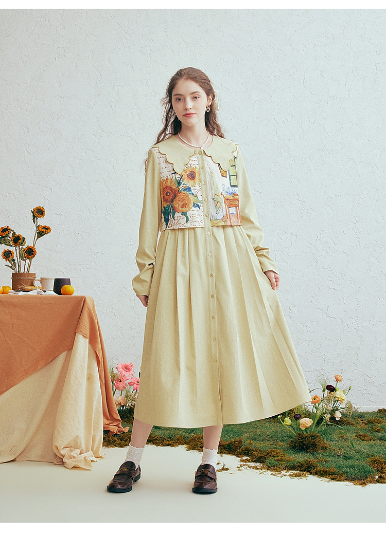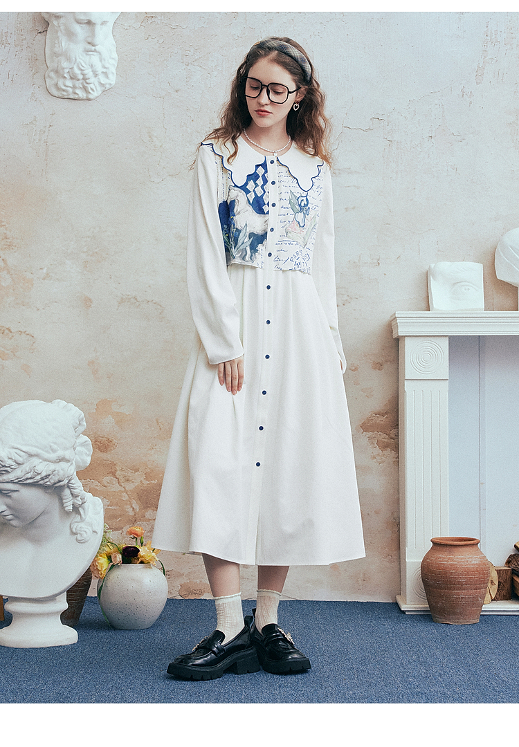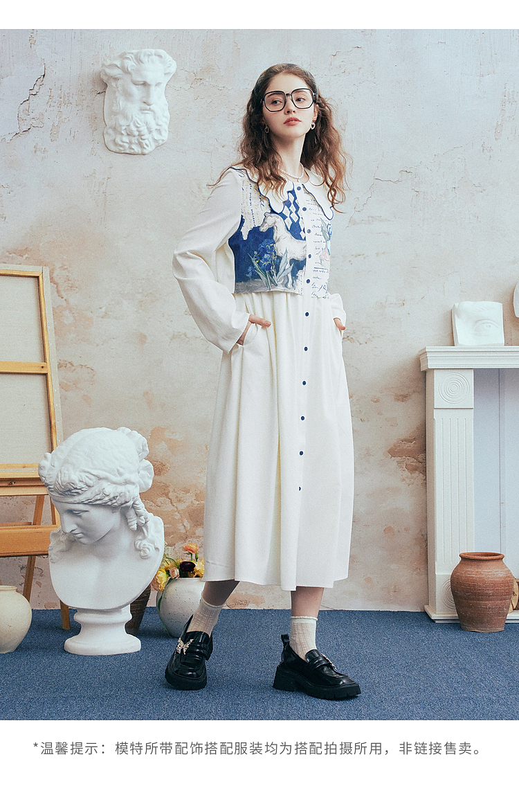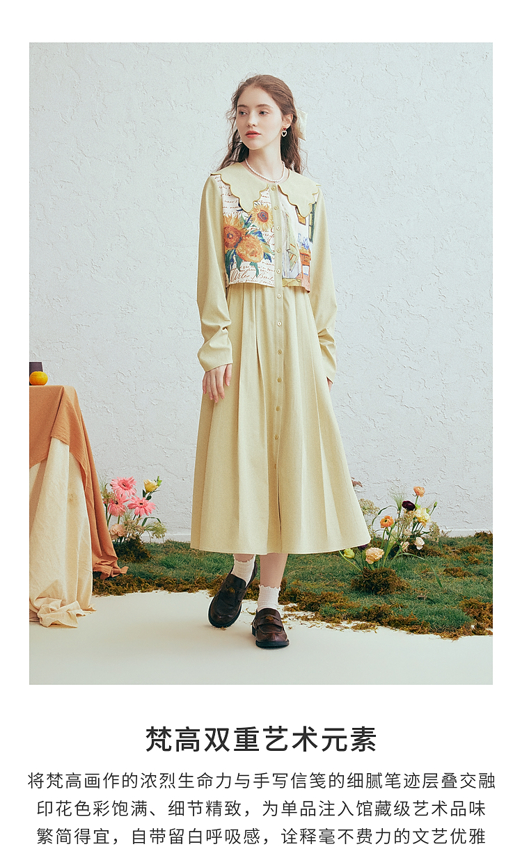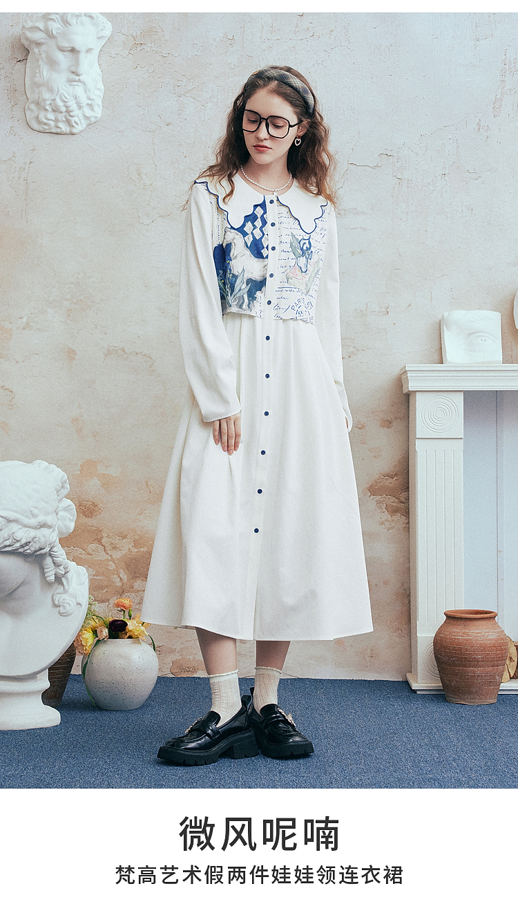 两三事梵高文艺微风呢喃2026春季新款森女风印花拼接假两件连衣裙